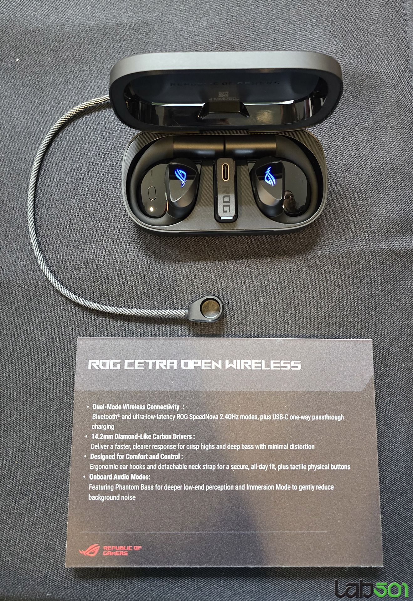 Castile sunt dotate cu functiile Phantom Bass si Immersion Mode, adaptor 2.4GHz ROG SpeedNova cu port USB-C passthrough pentru incarcarea dispozitivului la care le conectam (smartphone, de exemplu), precum si cu o prindere reflectorizanta pentru gat.