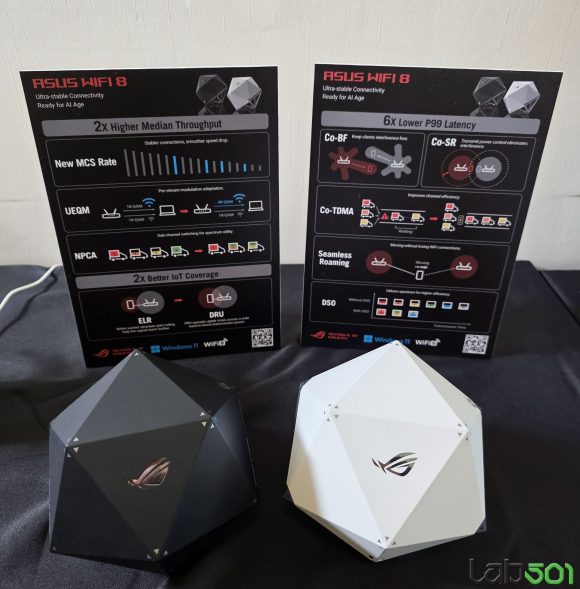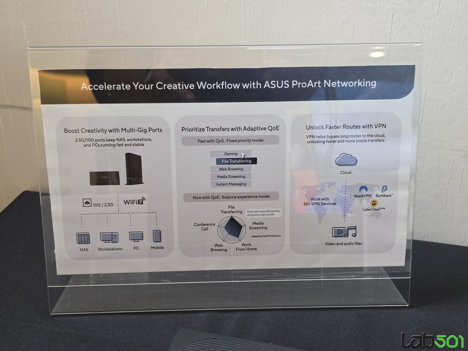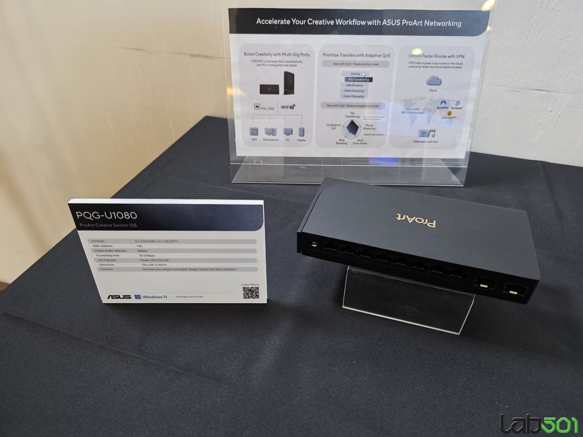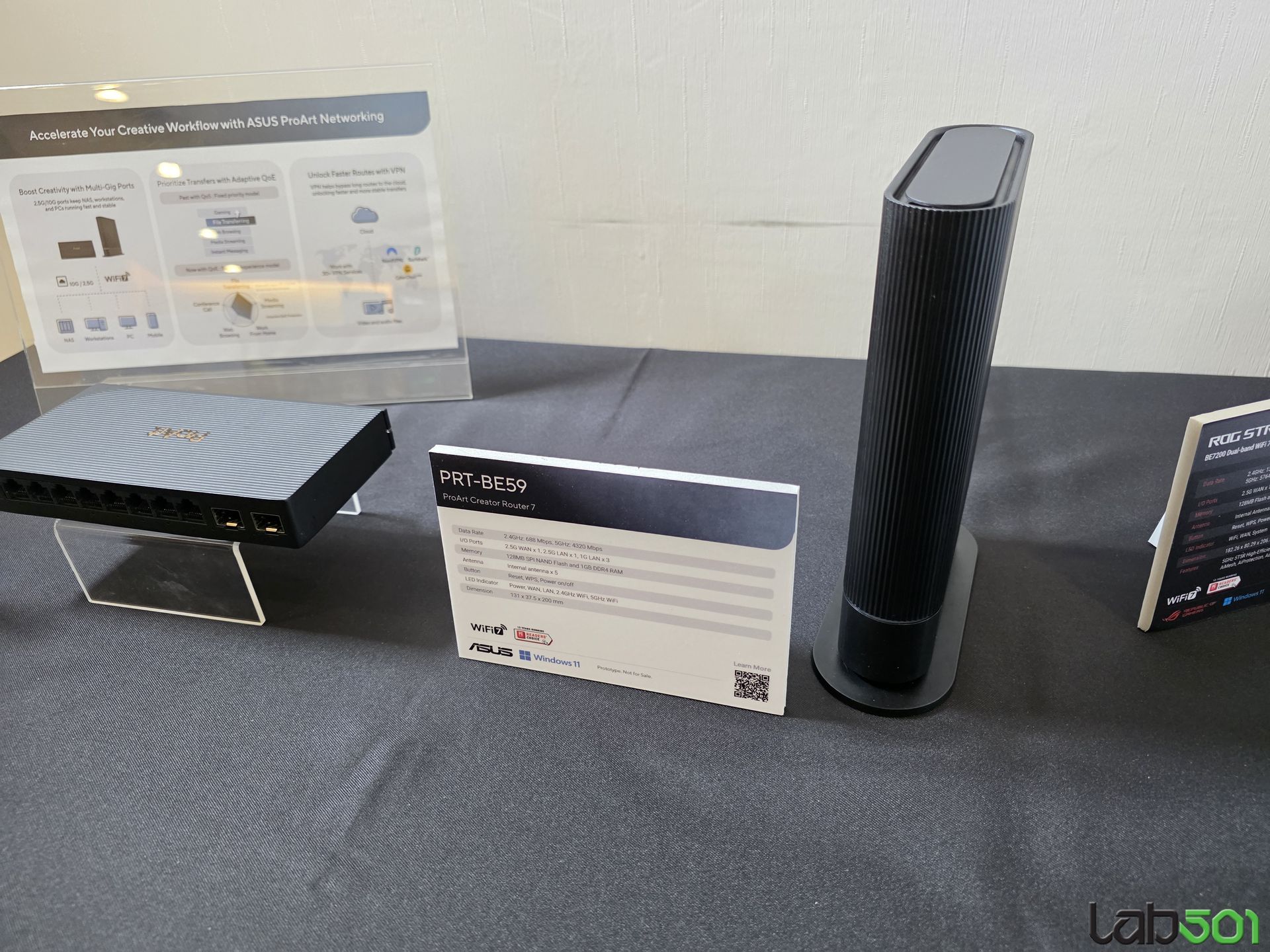 Ultima echipa care ne-a prezentat cele mai noi produse si tehnologii a fost departamentul de retelistica. Astfel, am putut afla mai multe detalii despre ASUS ROG Strix GS-BE7200, un router WiFi 7 (7200 Mbps, MLO, 4K-QAM) cu 6 antene, care ofera o performanta cu pana la 15% mai ridicata la distanta fata de routere standard (5GHz 4T4R). Am vazut de asemenea cum arata ASUS ProArt Router PRT-BE5000, care ofera conectivitate dual-band WiFi 7 (5000Mbps) 1 x 2.5G WAN, 1 x 2.5G LAN si 3 x Gigabit LAN ports, precum si ProArt Switch PQG-U1080, care se remarca prin porturile dual 10G SFP+ si 8 x 2.5 Gigabit.