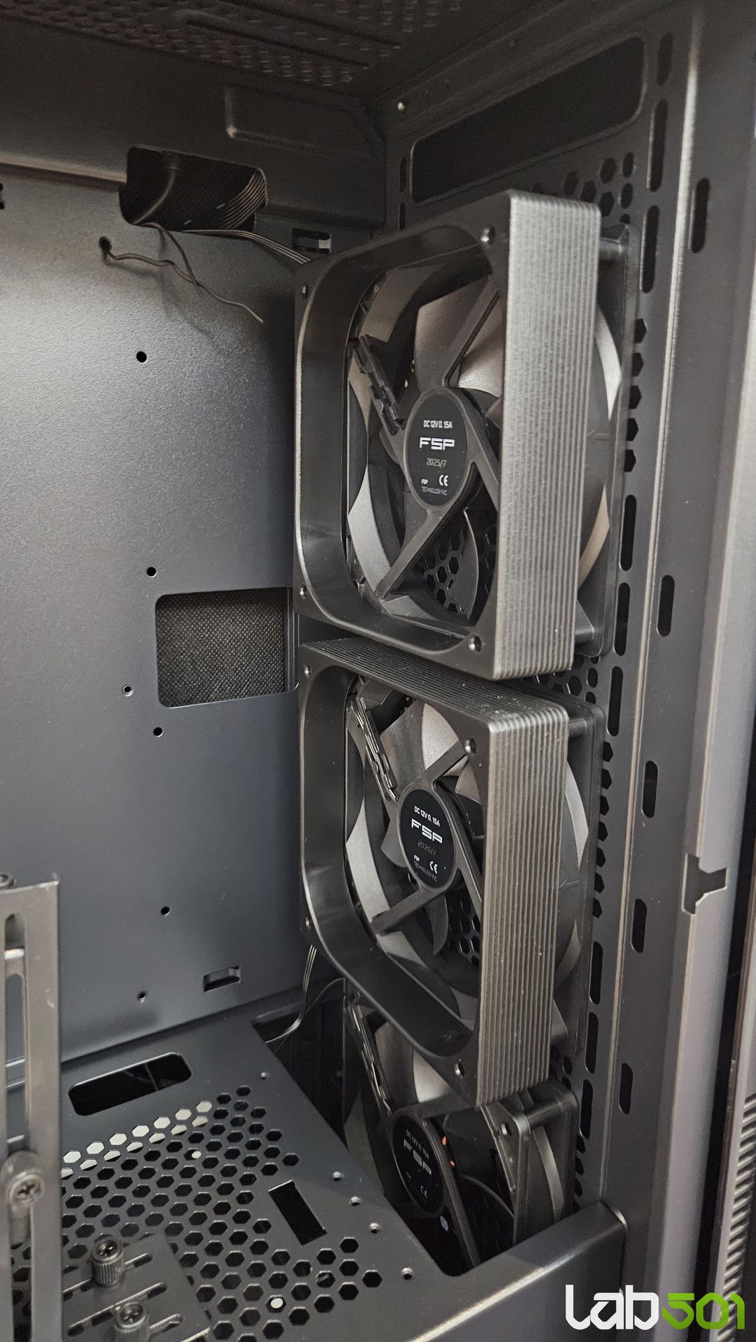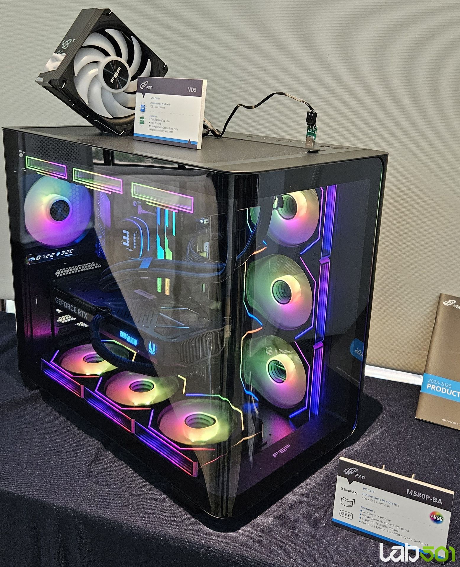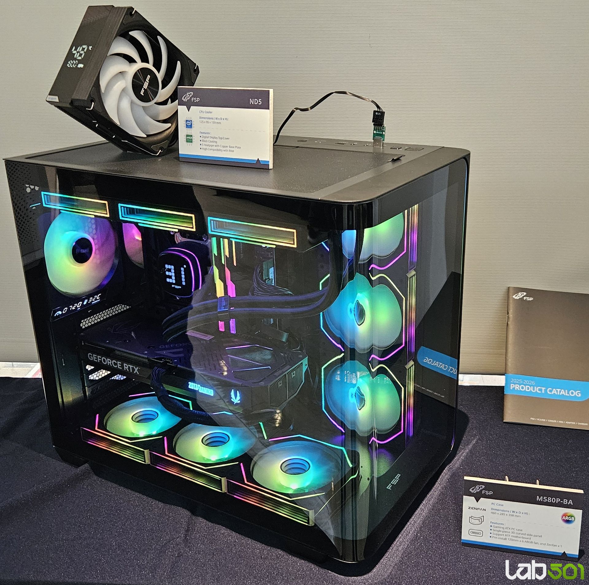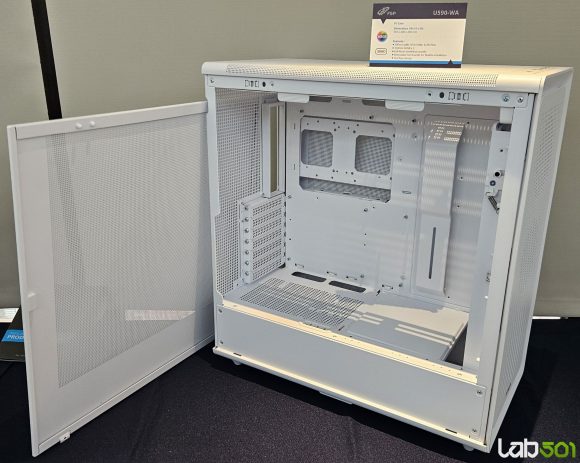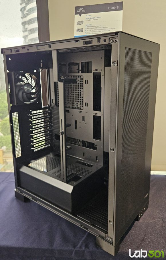 Pentru zona AI si workstation, FSP a prezentat U500 – o carcasa E-ATX compatibila cu formate CEB si EEB, gandita pentru sisteme echipate cu placi grafice RTX 5000. Suporta instalarea a doua placi RTX 5090 si radiatoare AIO de pana la 480 mm, fiind clar orientata catre configuratii pentru calcul intensiv. Suportul dublu pentru placi grafice este proiectat inclusiv pentru transport, oferind stabilitate sporita in build-uri grele si dense.