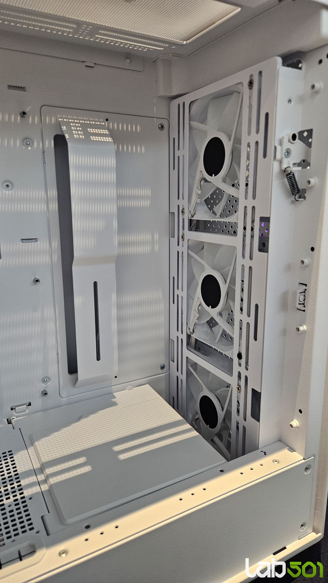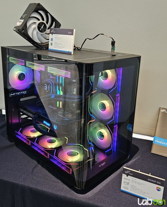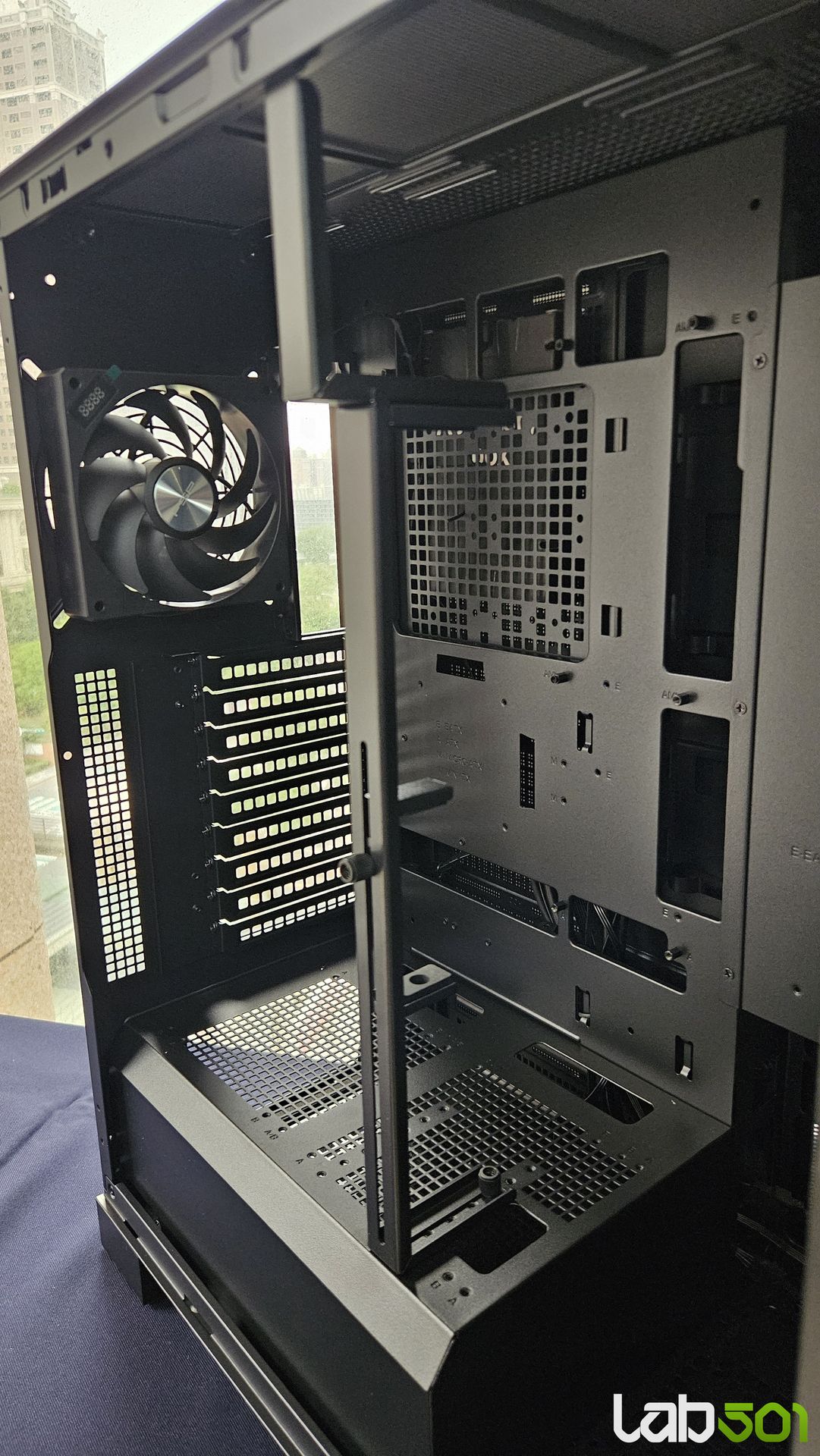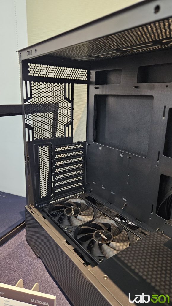 Pentru zona AI si workstation, FSP a prezentat U500 – o carcasa E-ATX compatibila cu formate CEB si EEB, gandita pentru sisteme echipate cu placi grafice RTX 5000. Suporta instalarea a doua placi RTX 5090 si radiatoare AIO de pana la 480 mm, fiind clar orientata catre configuratii pentru calcul intensiv. Suportul dublu pentru placi grafice este proiectat inclusiv pentru transport, oferind stabilitate sporita in build-uri grele si dense.