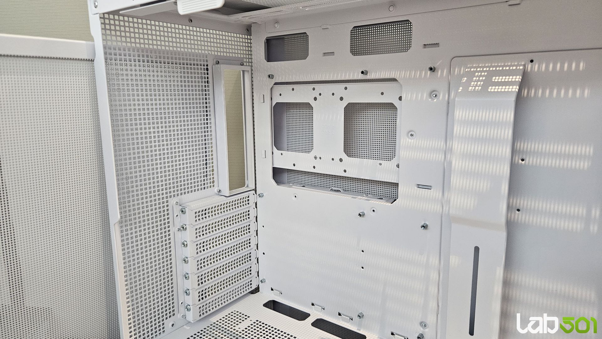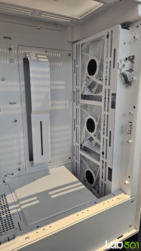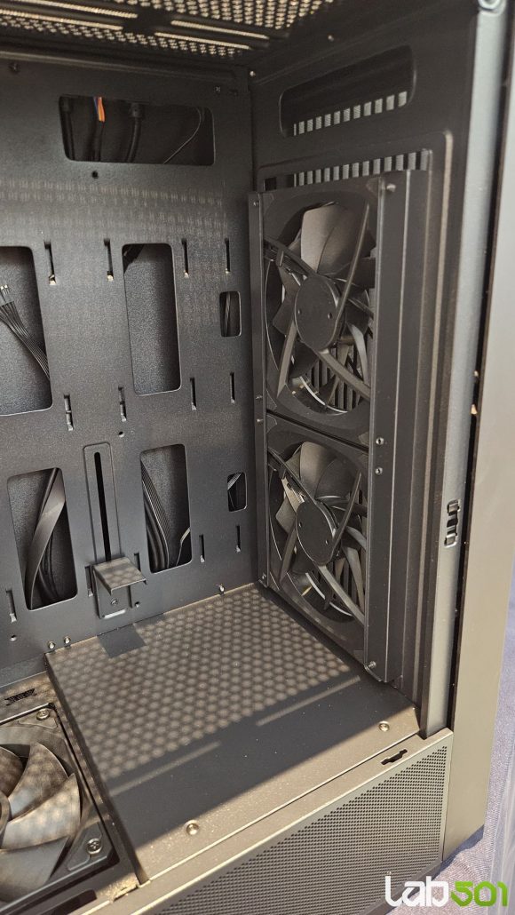 Pentru utilizatorii care au nevoie de mai mult spatiu si airflow superior, FSP propune U590 – o carcasa E-ATX Ultra Tower cu un design clar orientat spre ventilatie maxima. Suporta placi grafice de pana la 390 mm, inclusiv modele flagship precum RTX 5090, si foloseste un sistem toolless pentru montarea unitatilor de stocare si a filtrelor de praf. Un detaliu interesant este suportul frontal pentru ventilatoare, reversibil si detasabil, care faciliteaza instalarea radiatoarelor sau a solutiilor AIO de 360 mm. U590 include si un suport ajustabil pentru GPU, menit sa reduca solicitarea mecanica pe termen lung.