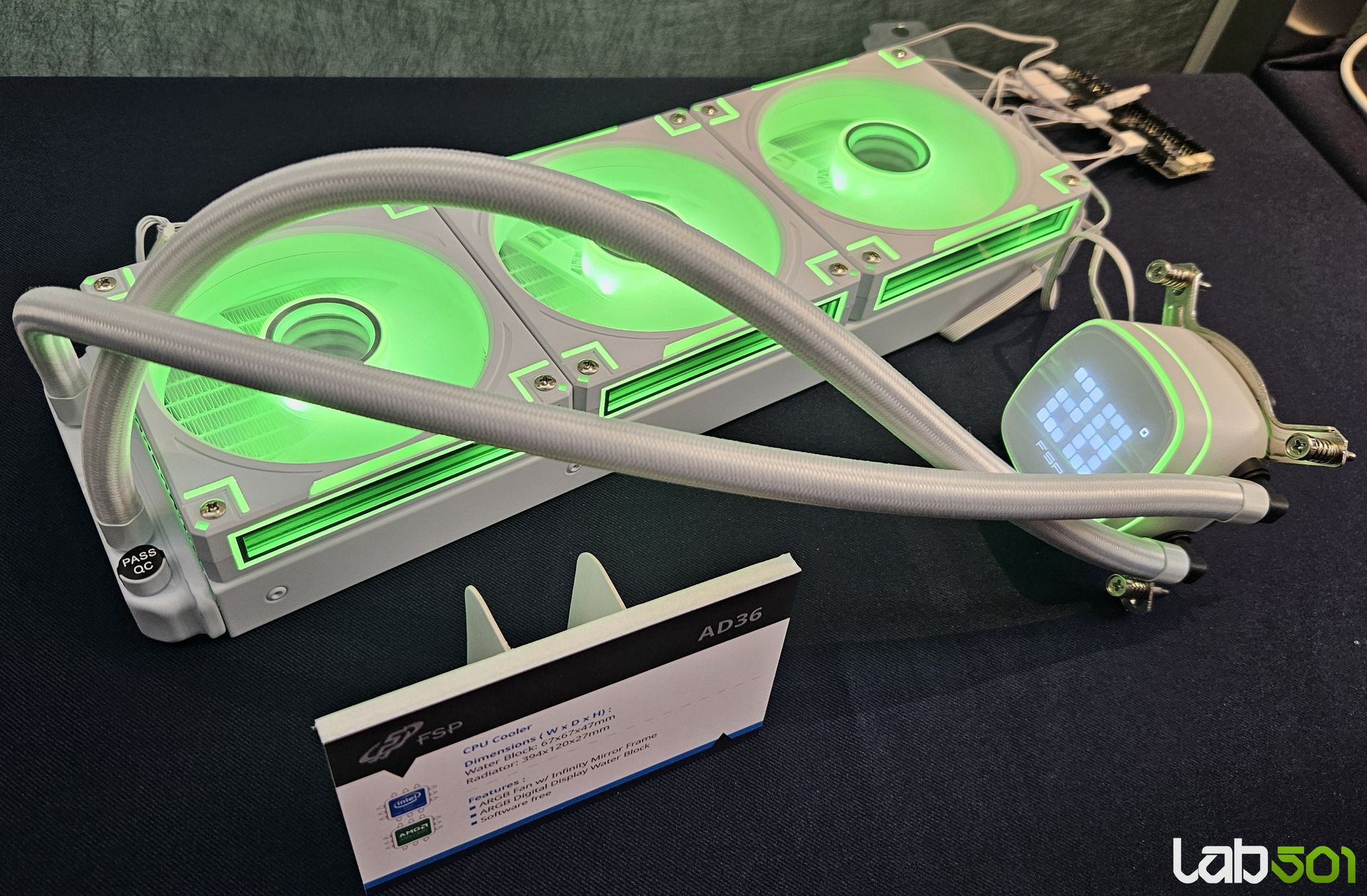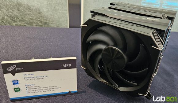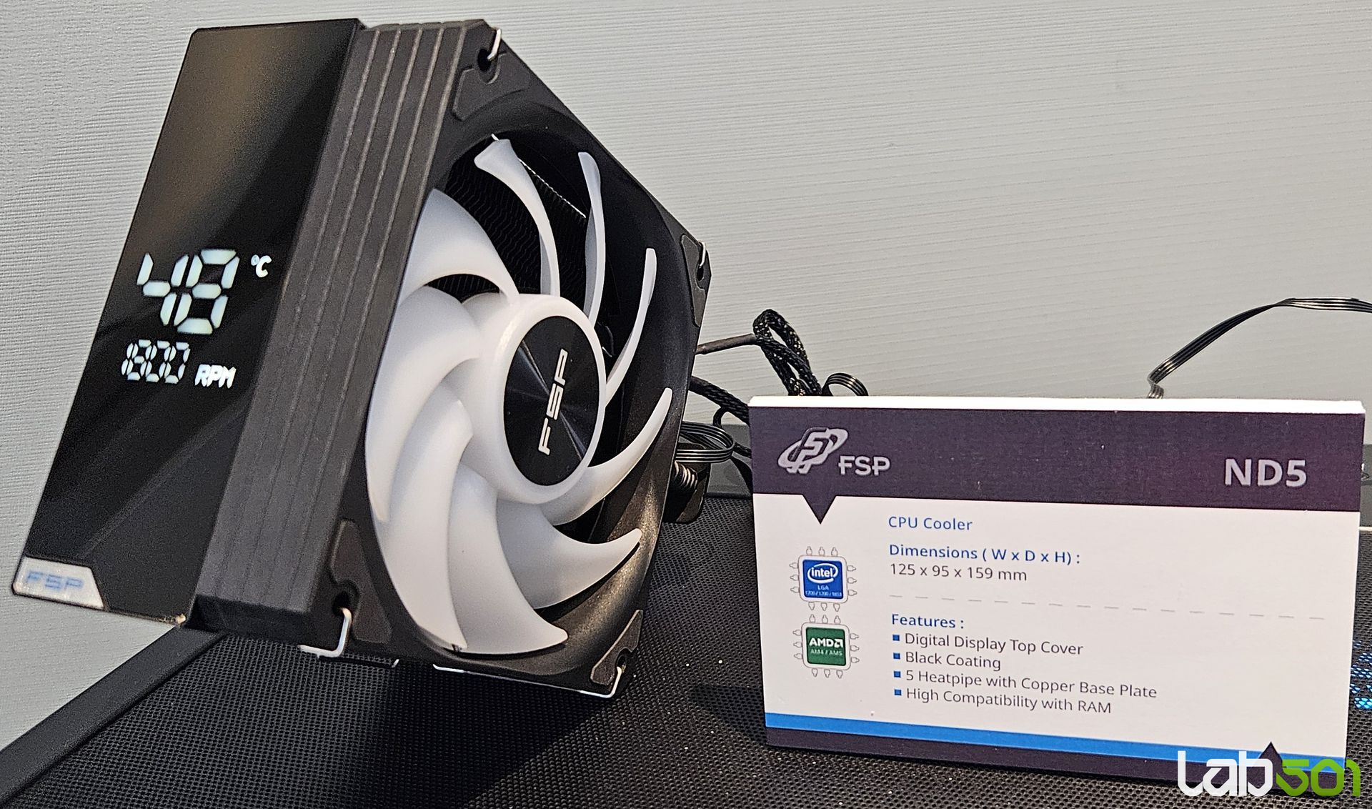 Pe langa carcase, FSP si-a extins considerabil portofoliul de solutii de racire pentru 2026, incluzand atat coolere pe aer, cat si AIO-uri cu elemente vizuale moderne. In zona coolerelor pe aer, ND5 este un model single tower cu baza din cupru, cinci heatpipe-uri de 6 mm, finisaj complet negru si un ventilator de 120 mm optimizat pentru performanta. Un detaliu distinctiv este capacul superior cu afisaj digital, care adauga atat valoare estetica, cat si functionalitate practica.