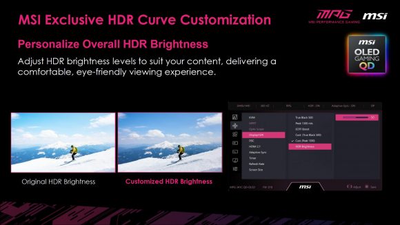 Avem desigur si noutati specifice MSI, cum ar fi posibilitatea de a personaliza curbele HDR (True Black 500 si Peak 1300), posibilitatea de a regla profilul de culoare pe 6 canale (RGBCMY), functie KVM si conector USB-C cu Display Port si Power Delivery 98W.