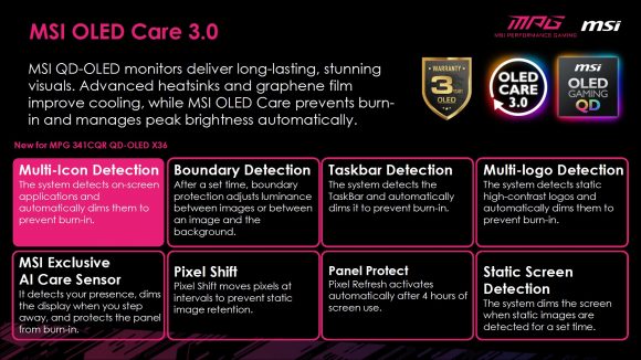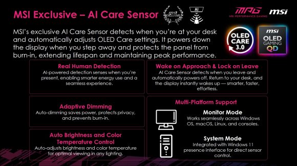 De asemenea, MSI OLED Care a ajuns la generatia a 3-a – masurile de baza (Pixel Sift, Pixel Refresh, Static Screen Detection, Boundary Detection, Taskbar Detection si Multi-logo Detection), prezente in primele doua versiuni fac parte in continuare din arsenalul de protectie MSI, insa MPG 341CQR QD-OLED X36 integreaza si o componenta hardware care face parte din acest mecanism de protectie. Astfel, este vorba despre un senzor CMOS denumit AI Care Sensor, pozitionat pe latura inferioara a monitorului, care scaneaza ce se afla in fata monitorului la fiecare 0.2s, detectand automat prezenta umana.