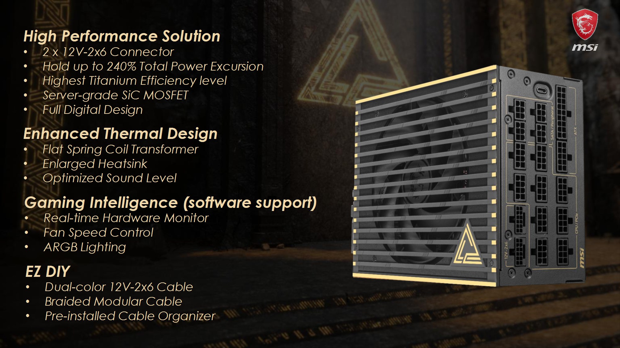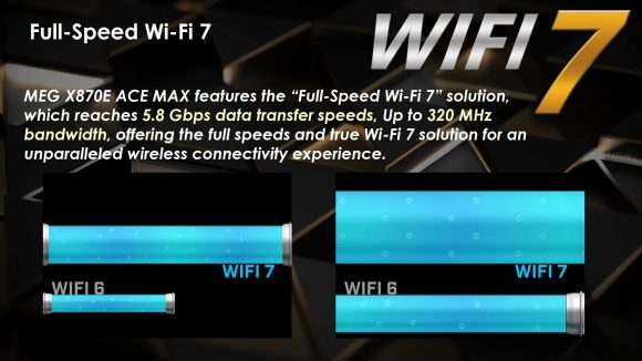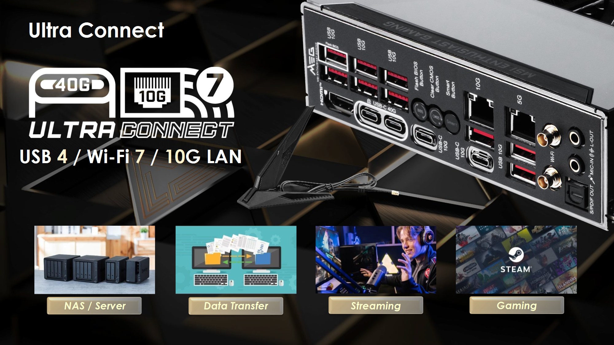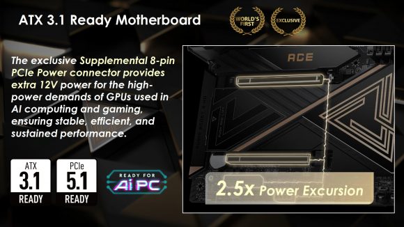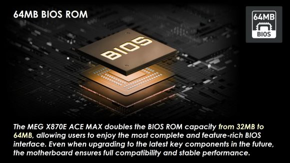 Nu in ultimul rand, avem de-a face cu un etaj de alimentare alcatuit din 18+2+1 faze de 110A, controlate de un PWM digital, conectivitate de ultima generatie (USB 4, WiFi 7, 10Gbe LAN), EZ-DIY design, BIOS Click X de 64MB si un conector PCI-E 8 pin dispus pe placa de baza, care acopera nevoia de putere in plus a celor mai recente placi grafice sau sisteme de racire.