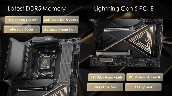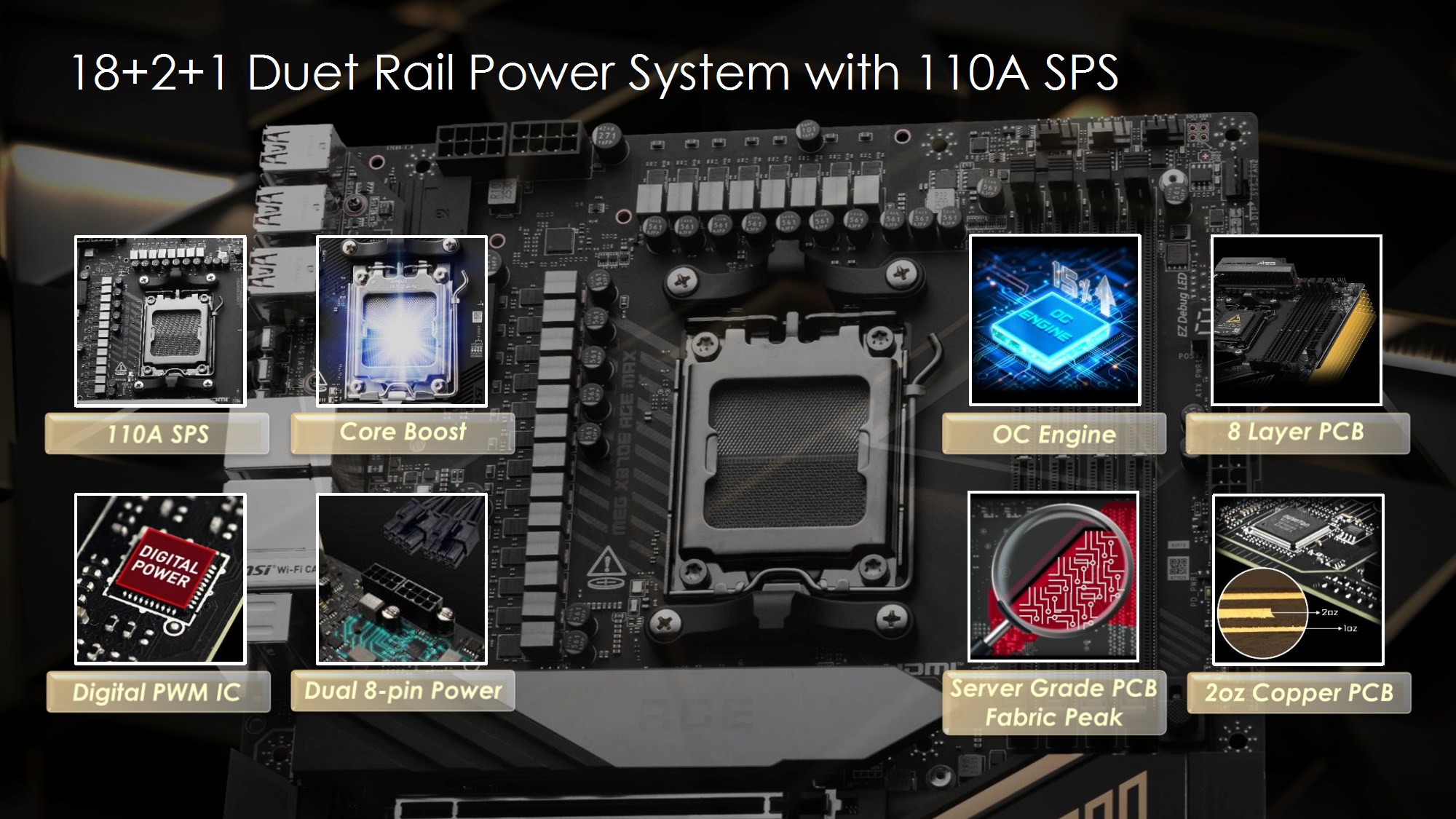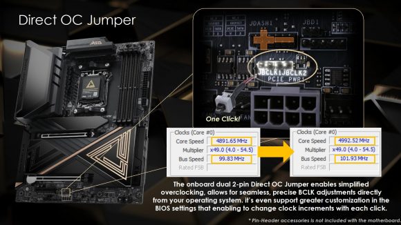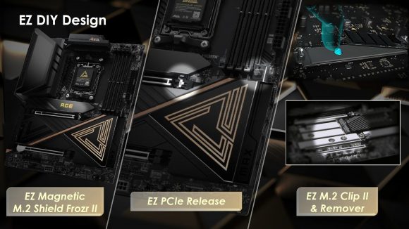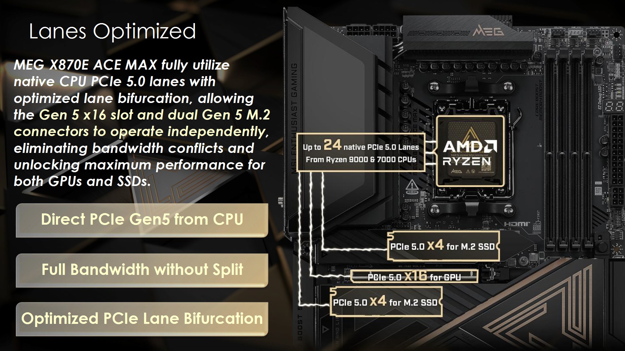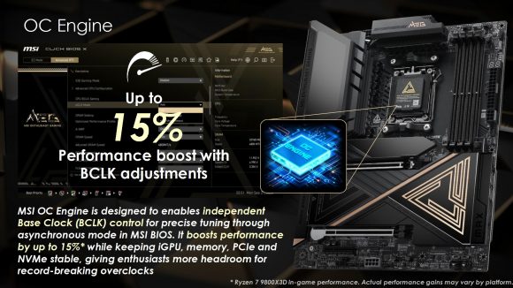 Noua serie aduce mai multe optimizari pentru procesoarele AMD Ryzen X3D din seria 9000, atat in cazul modelelor lansate, cat si in cazul modelelor care vor fi anuntate in curand. Astfel, OC Engine ofera control independent pentru BCLK, chiar si din Windows, cu ajutorul OC Jumper. Mai mult decat atat, placa de baza foloseste la maxim cele 24 de lane-uri PCI-E 5.0 disponibile din procesor, functionarea slot-ului PCI-E 5.0 x16 pentru placa grafica fiind independenta de cele doua slot-uri PCI-E 5.0 x4 pentru SSD-uri.