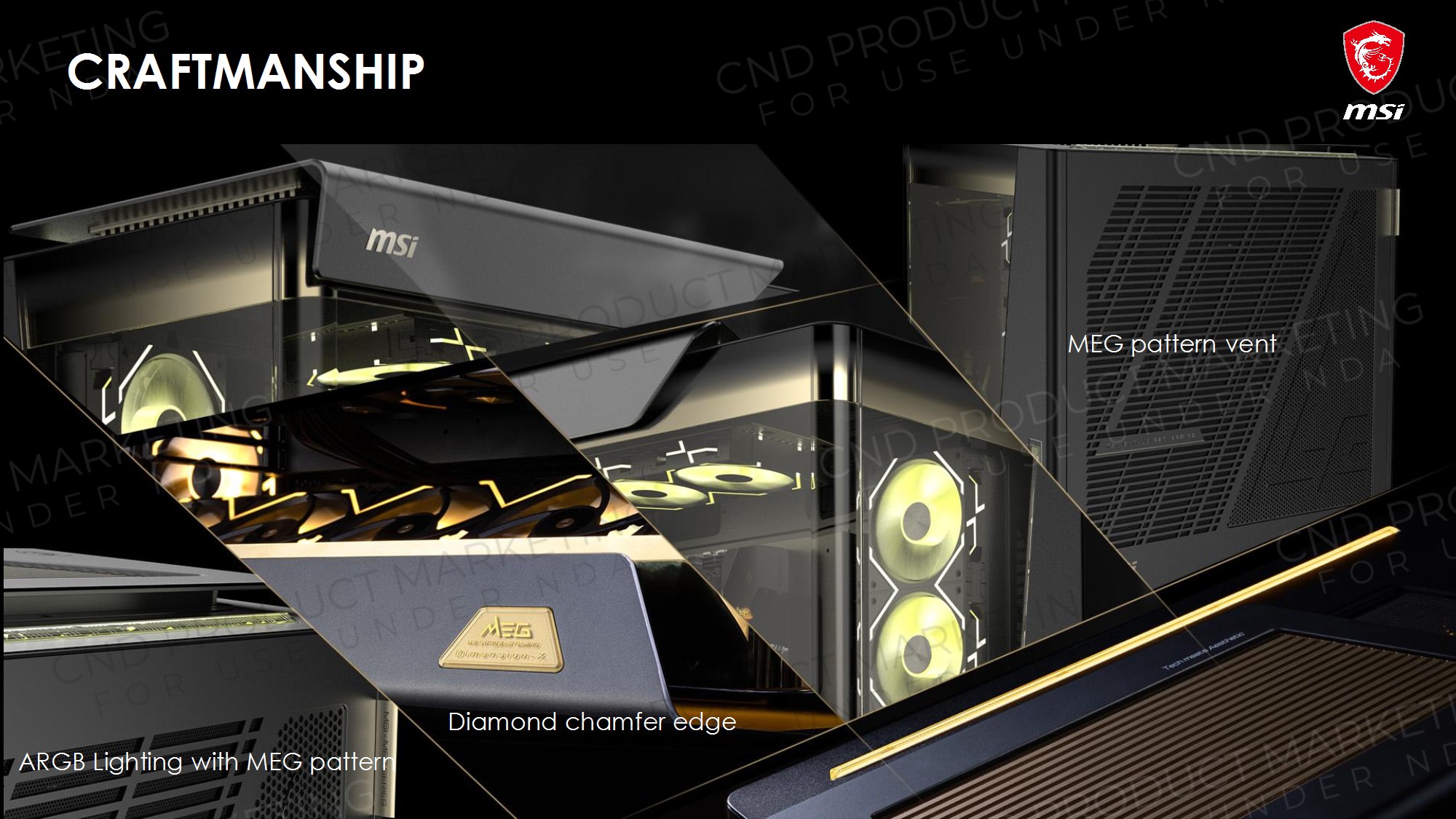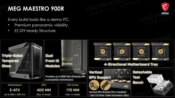 La capitolul carcasa, am vazut cum arata MSI MEG Maestro 900R, o carcasa panoramica echipata cu sticla securizata pe trei laturi, care accepta placi de baza in format E-ATX si placi video de pana la 400mm lungime, fiind echipata din fabrica cu sistem de montare verticala a placii video, inclusiv riser PCI-E 5.0.