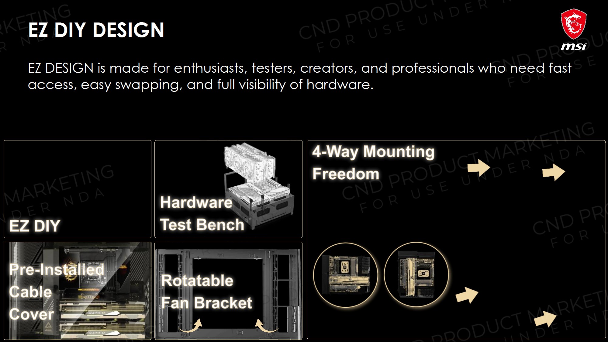 Mai mult decat atat, aceasta permite montarea placii de baza in 4 pozitii, practic in orice orientare ne dorim noi, suporta doua placi video high-end montate in pozitie clasica si nu in ultimul rand, motherboard tray-ul poate fi folosit pe post de masa de teste, o functie extrem de interesanta din punctul meu de vedere. Nu in ultimul rand, MSI MEG Maestro 900R suporta nu mai putin de 4 radiatoare simultan, intr-un circuit de racire cu lichid.