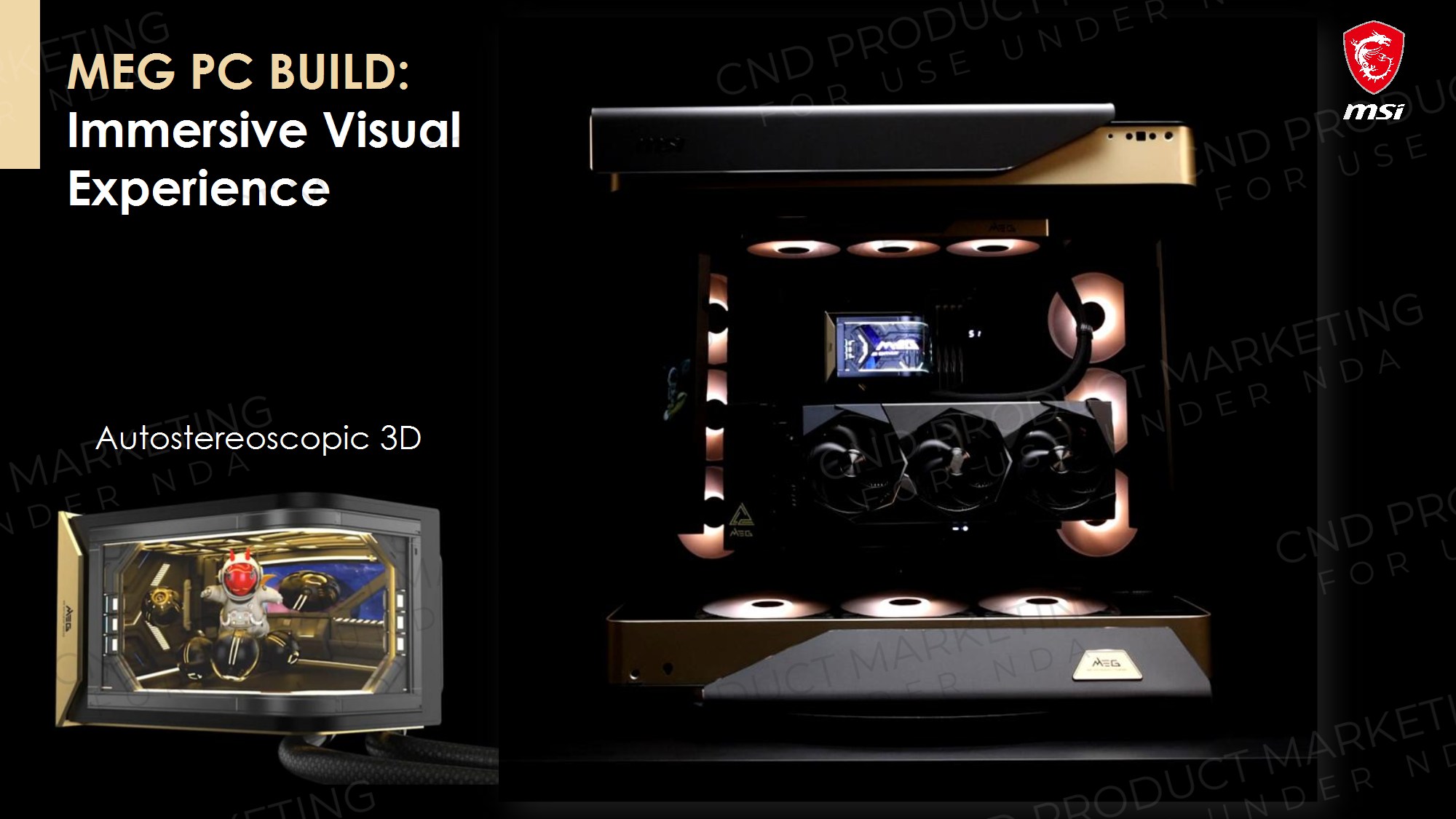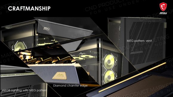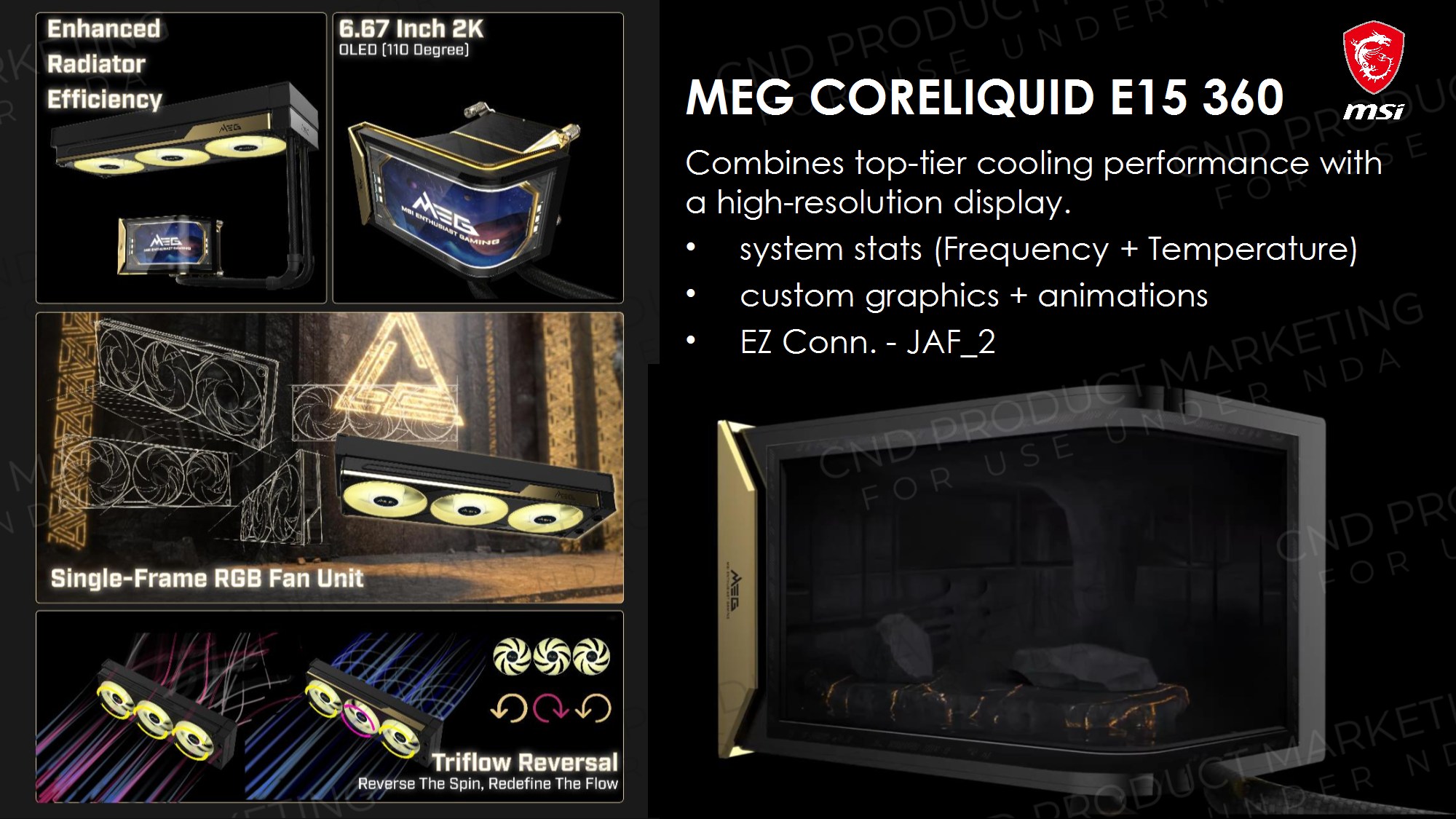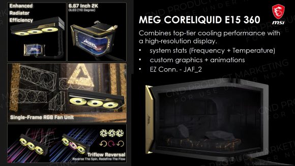 Si daca tot am discutat despre racire, o alta componenta importanta in acest sistem este MSI MEG Coreliquid E15 360, un AIO de ultima generatie, echipat cu un display OLED panoramic curbat la 110 grade, cu o diagonala de 6.67″ si rezolutie 2K. Acesta este echipat cu conector JAF_2, ventilatoare care isi pot schimba sensul si un sistem de iluminare RGB inclus in rama AIO-ului.