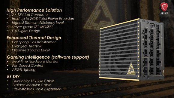 Nu in ultimul rand, sursa MSI MEG Ai1600T PCIE5 sta la baza acestui sistem, oferind certificare 80PLUS/Cybenetics/PPLP.Info Titanium, respectiv Cybenetics A++ la capitolul silentiozitate. Discutam despre o sursa complet digitala, capabila sa sustina spike-uri de pana la 240%, echipata cu 2 conectori 12V-2×6 nativi si cabluri matisate individual.