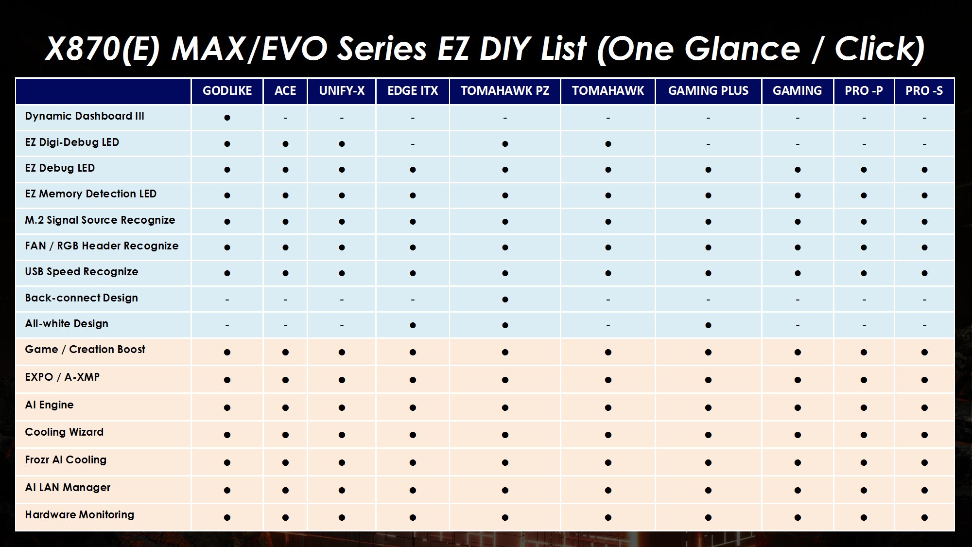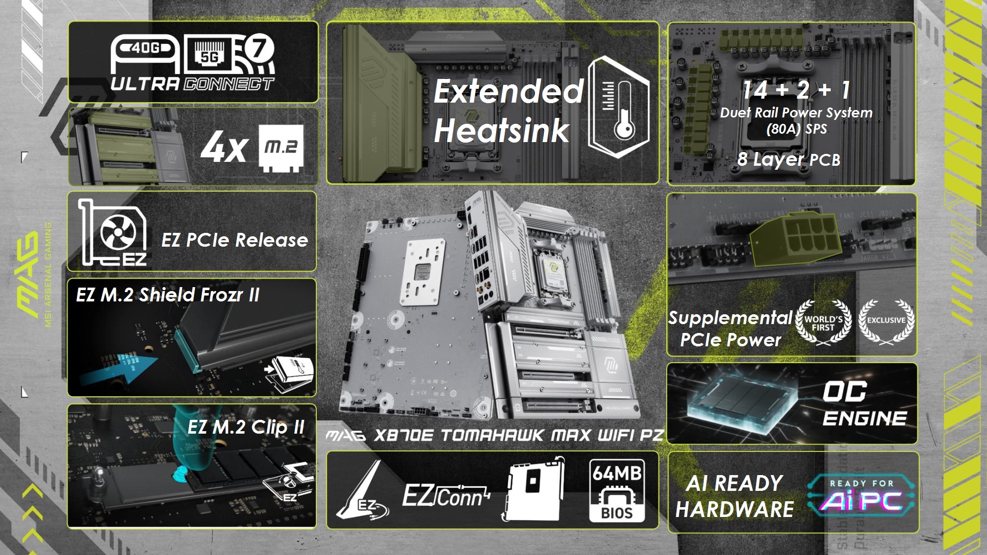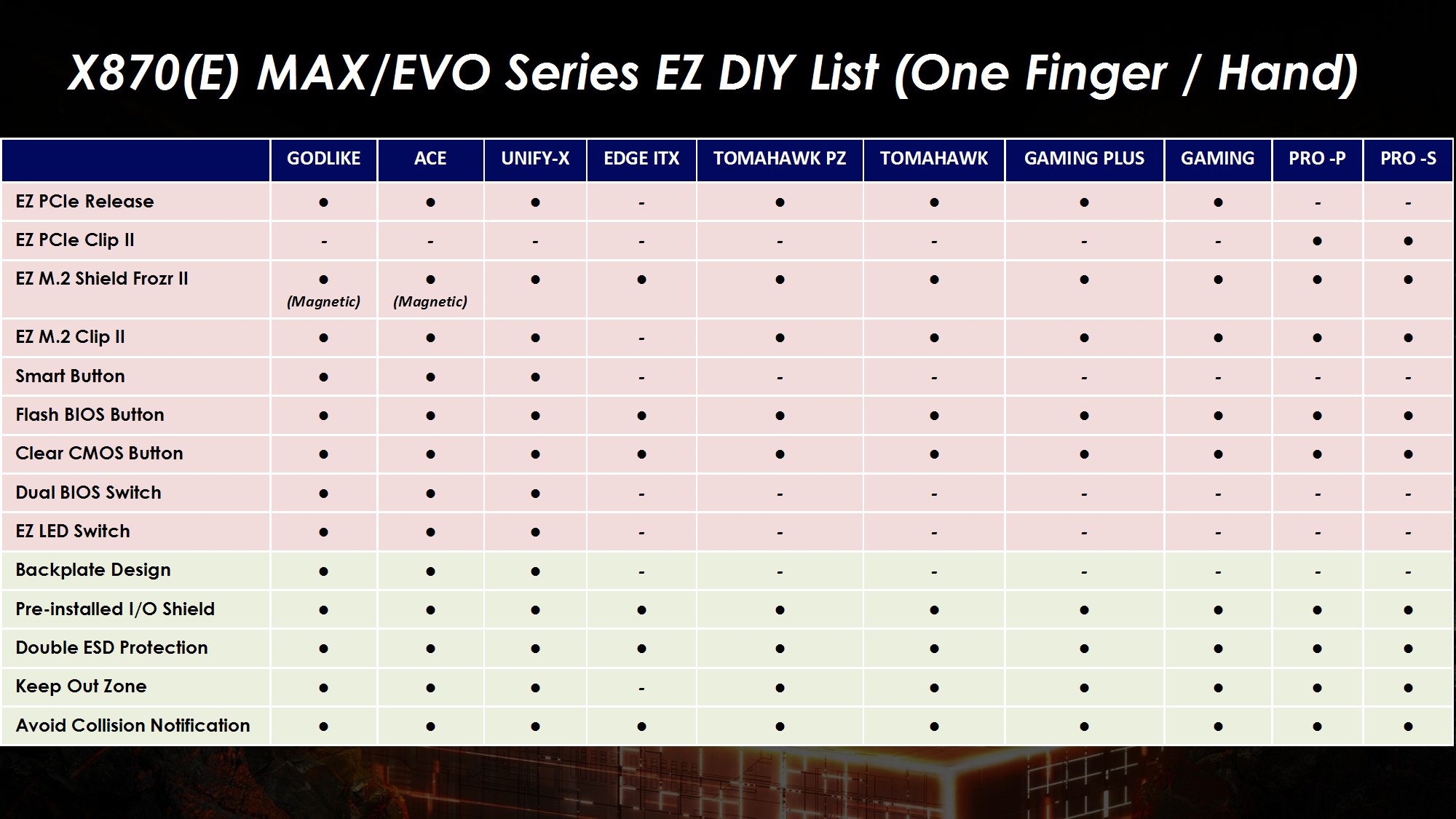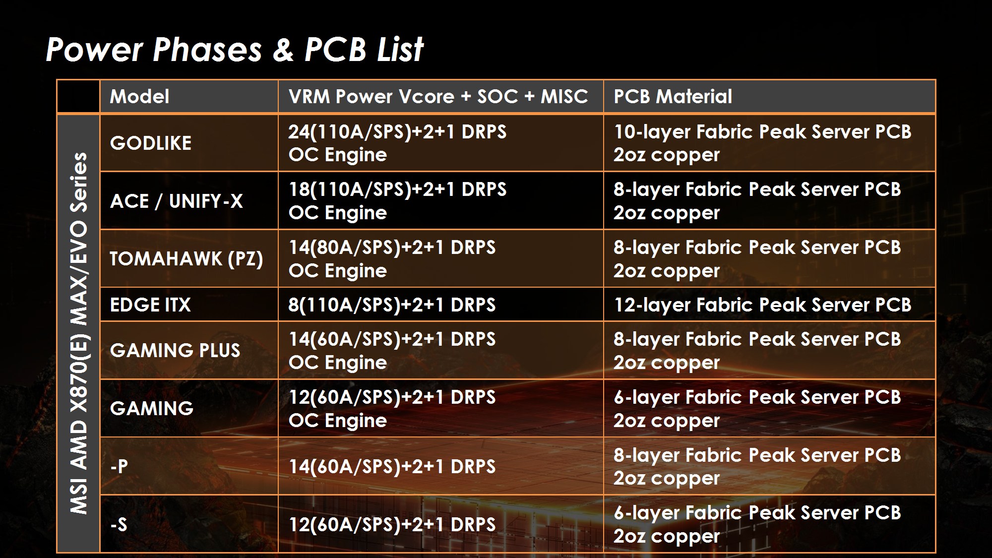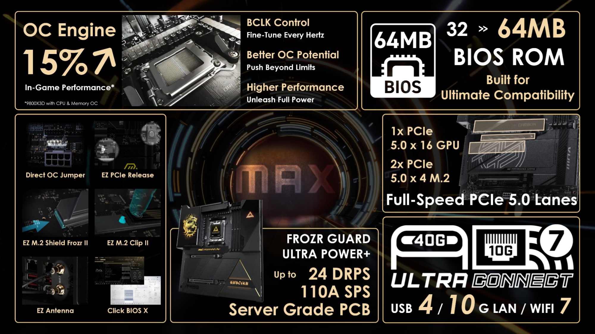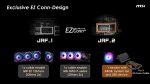 Toate modelele folosesc 2oz PCB, in 10 straturi pentru Godlike, 6 straturi pentru Gaming, respectiv 8 straturi pentru celelalte modele din serie. Noutatile constau in functia OC Engine imbunatatita cu control independent pentru BCLK, Direct OC Jumper, suportul pentru frecvente DDR5 10000, functiile EZ DIY prezente pe toate placile, utilizarea unor chip-uri de BIOS de 64MB, conectivitatea PCI-E 5.0 separata pentru placa grafica si solutii de stocare, precum si prezenta conectivitatii de ultima generatie.