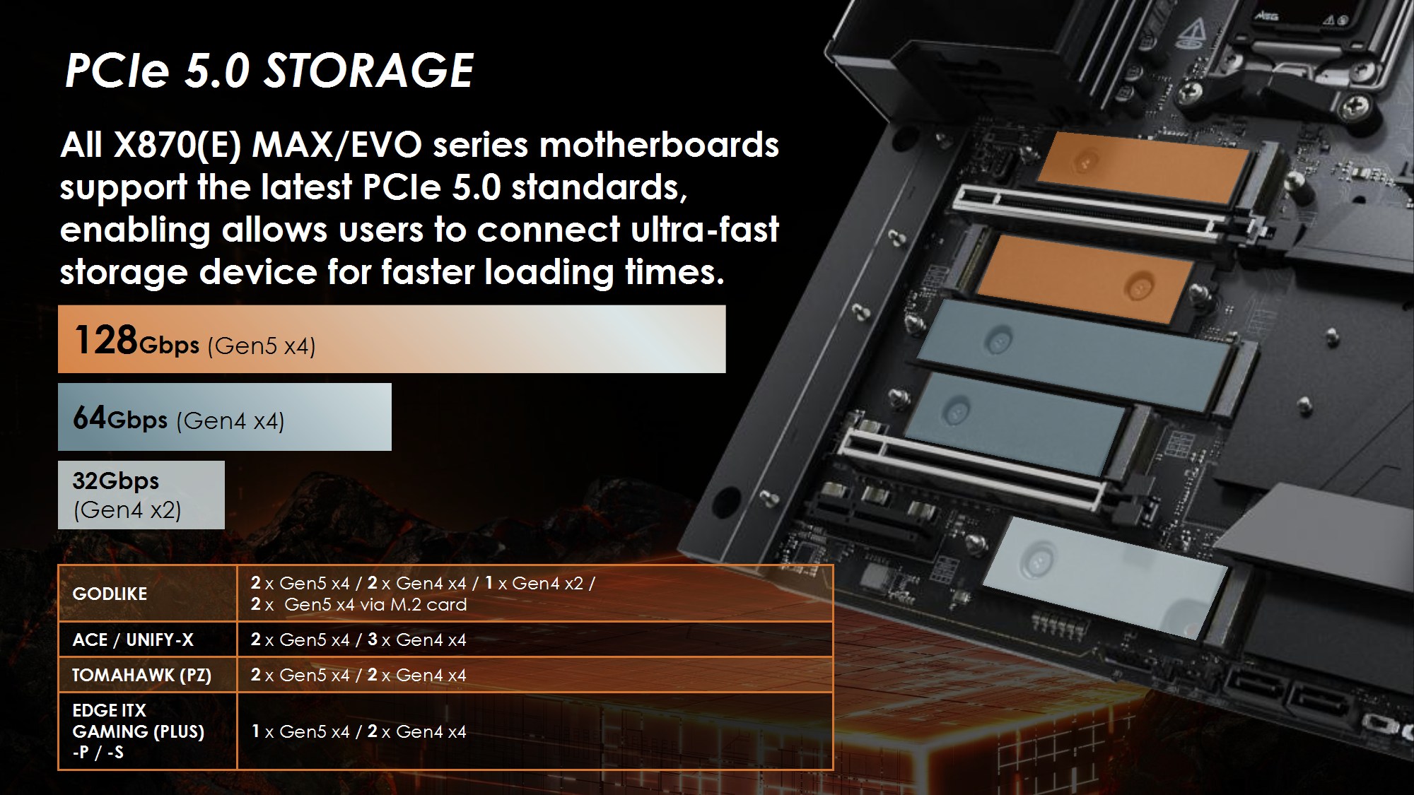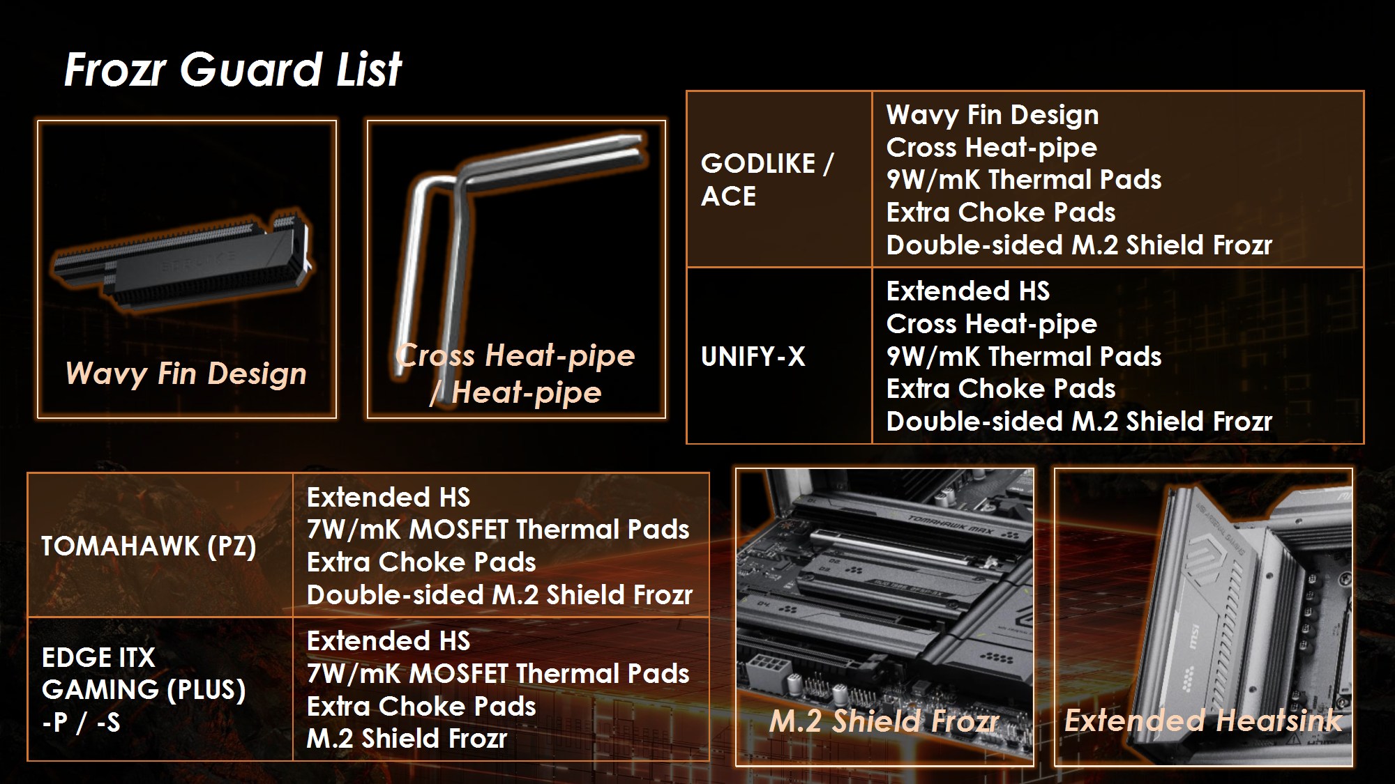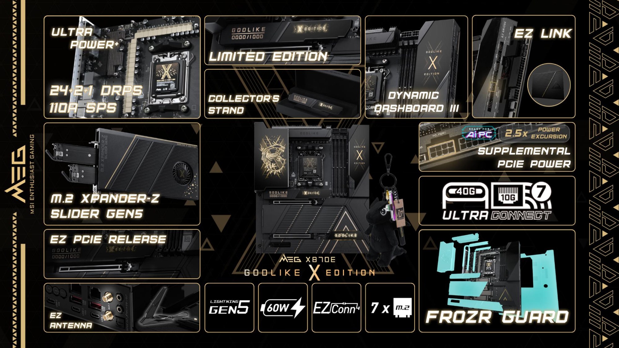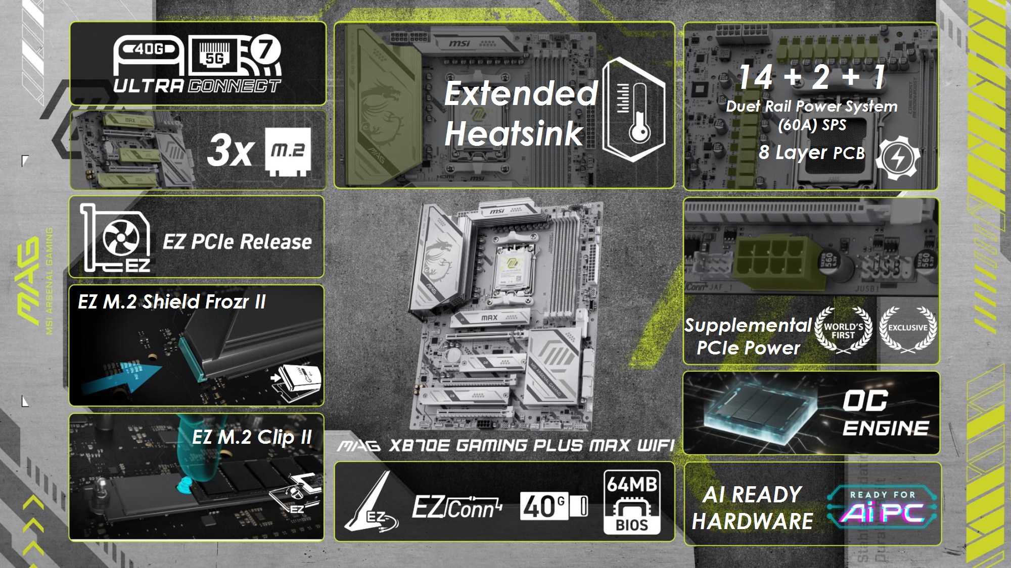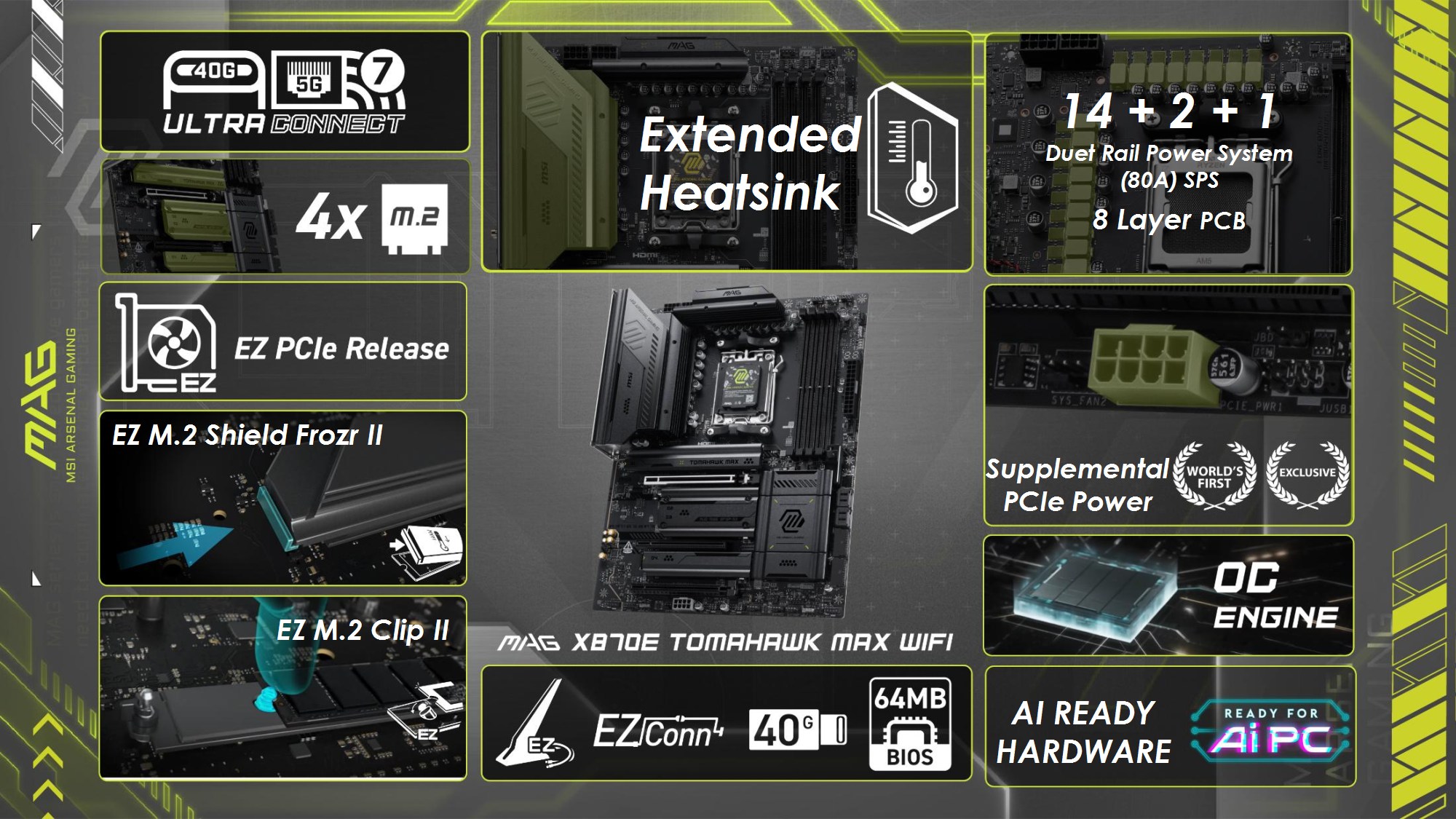 Toate modelele folosesc 2oz PCB, in 10 straturi pentru Godlike, 6 straturi pentru Gaming, respectiv 8 straturi pentru celelalte modele din serie. Noutatile constau in functia OC Engine imbunatatita cu control independent pentru BCLK, Direct OC Jumper, suportul pentru frecvente DDR5 10000, functiile EZ DIY prezente pe toate placile, utilizarea unor chip-uri de BIOS de 64MB, conectivitatea PCI-E 5.0 separata pentru placa grafica si solutii de stocare, precum si prezenta conectivitatii de ultima generatie.
