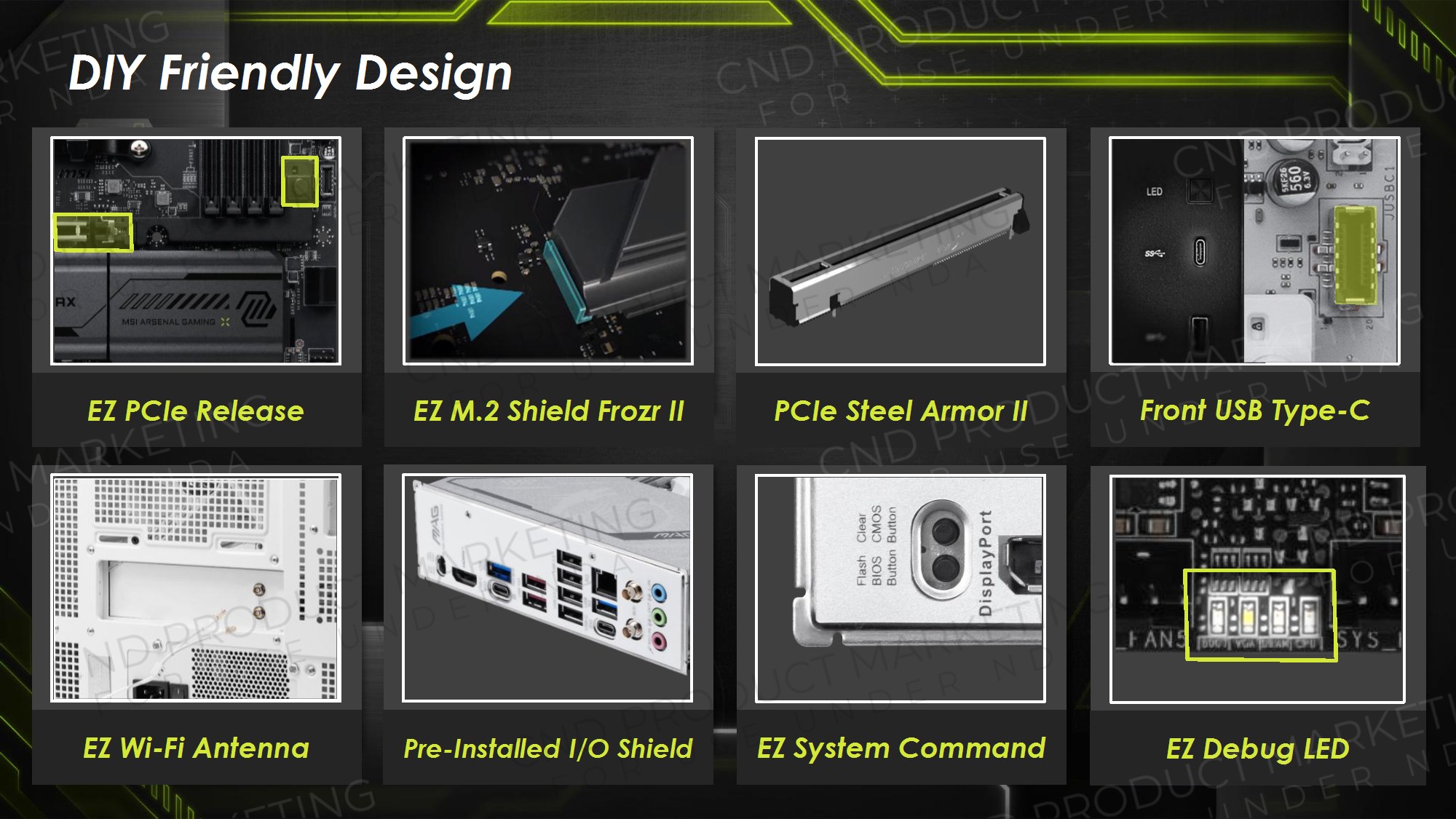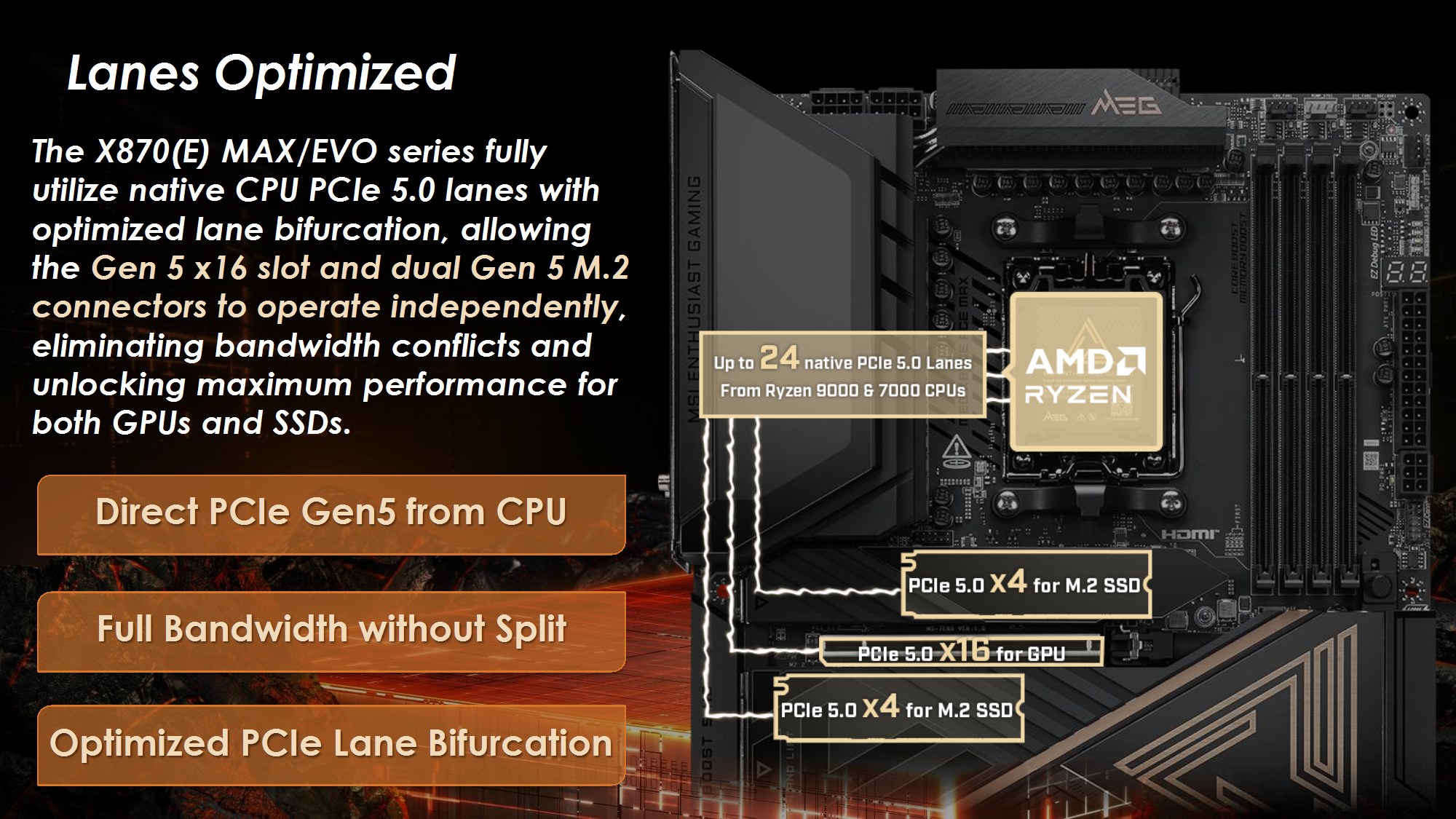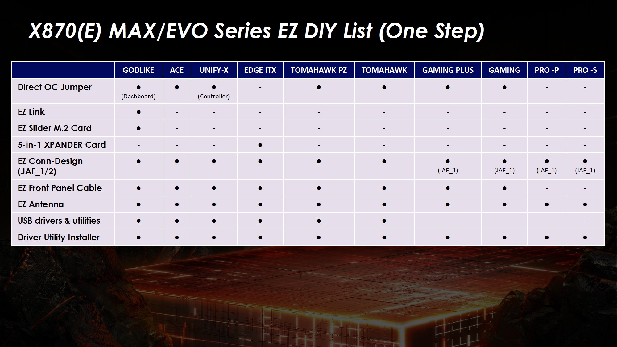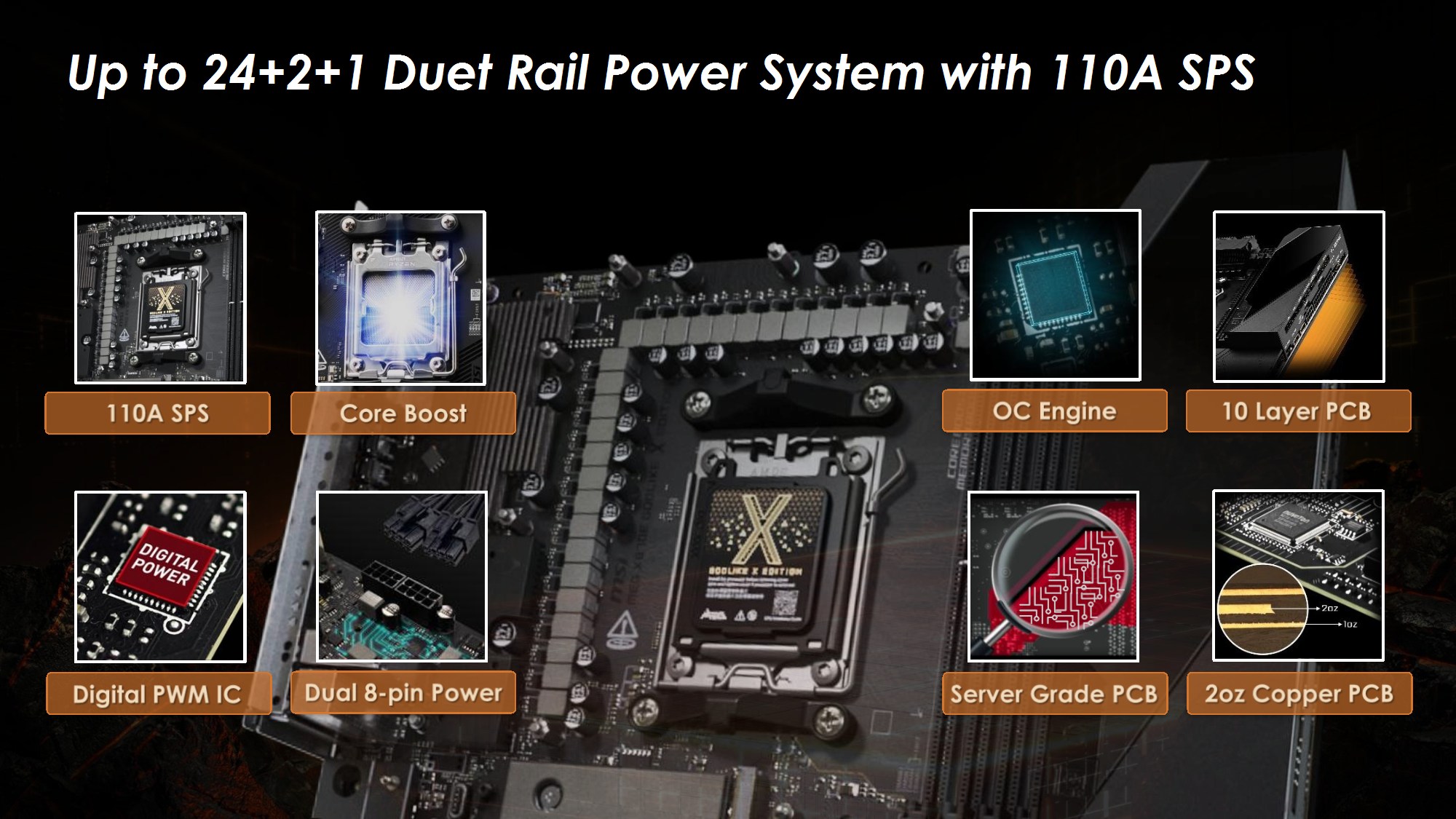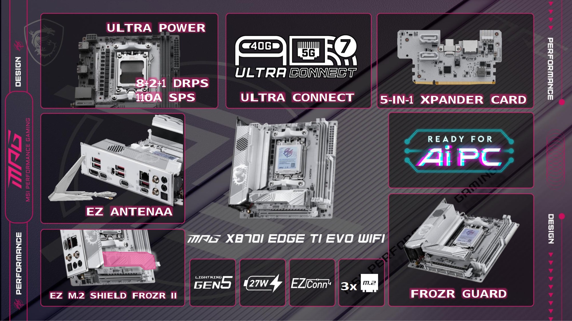 Toate modelele folosesc 2oz PCB, in 10 straturi pentru Godlike, 6 straturi pentru Gaming, respectiv 8 straturi pentru celelalte modele din serie. Noutatile constau in functia OC Engine imbunatatita cu control independent pentru BCLK, Direct OC Jumper, suportul pentru frecvente DDR5 10000, functiile EZ DIY prezente pe toate placile, utilizarea unor chip-uri de BIOS de 64MB, conectivitatea PCI-E 5.0 separata pentru placa grafica si solutii de stocare, precum si prezenta conectivitatii de ultima generatie.