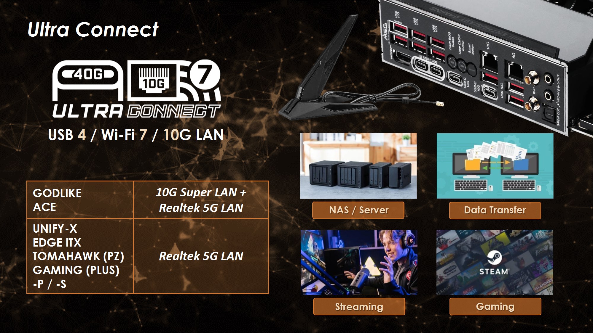 Astfel, toate modelele sunt echipate cu conectori USB 4 si conexiune WiFi 7. Godlike si Ace au doua conexiuni LAN, mai precis 10Gbe + 5Gbe, in timp ce restul modelelor sunt echipate cu o conexiune 5Gbe LAN. Mai mult decat atat, MSI MEG X870E Unify-X MAX ne aduce aminte de vremurile de aur ale overclocking-ului, fiind livrata impreuna cu un controller extern pentru cele mai importante functii (BCLK, OC Retry, OC Fail Save, Clr_CMOS, Power si Reset).
