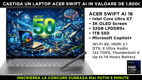 Pe de alta parte, pentru ca timpul vostru este pretios, in semn de apreciere pentru cei care completeaza chestionarul, punem la bataie un premiu consistent, oferit de ACER si European Hardware Association. Premiile sunt oferite la nivel european, pentru toti cititorii site-urilor EHA care vor completa chestionarul pana pe 10 mai, si vor fi acordate prin tragere la sorti. European Hardware Association, prin partenerii Parsec Media S.L., pune la bataie un ACER Swift 16 AI 16″ Laptop, Copilot+ PC cu procesor Intel Core Ultra X7 si 1 TB SSD, in valoare de 1800€.