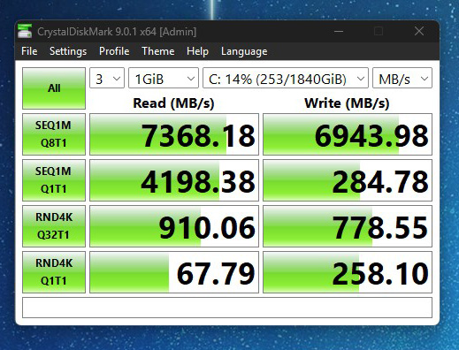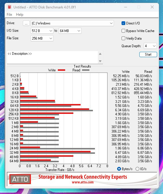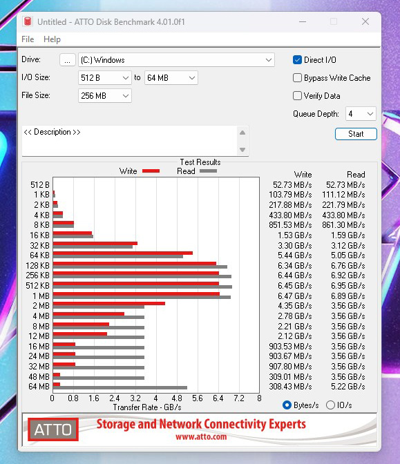 SSD-ul GIGABYTE face parte din cea de-a doua generatie a SSD-urilor PCI-E 4.0, oferind performante ridicate in Crystal Disk Mark, pe masura sistemului testat. Problema este ca producatorul nu a montat un radiator pe SSD, ceea ce se vede in ATTO de exemplu, unde SSD-ul intra in throttle.