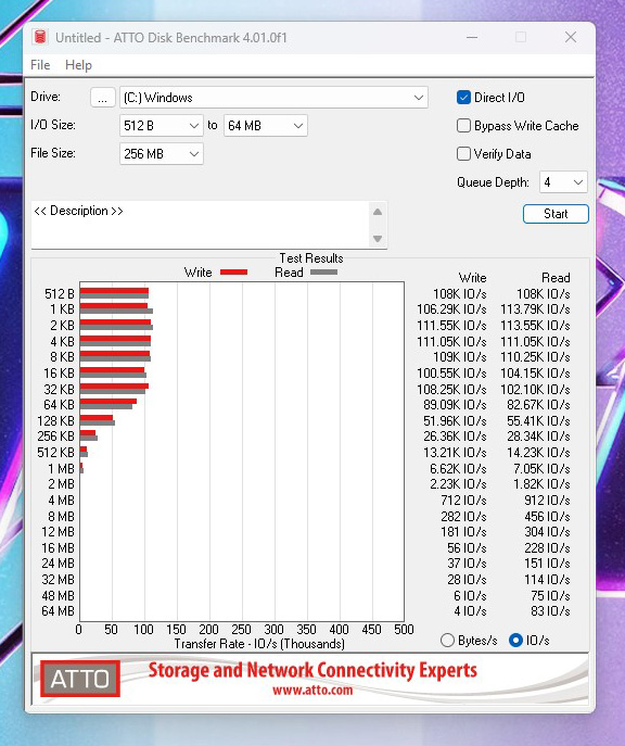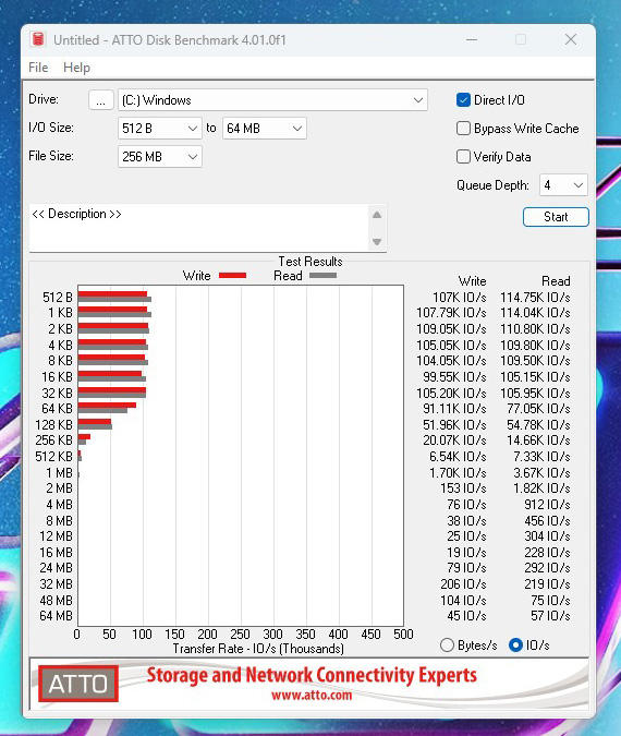 Asa cum puteti vedea, am rulat de doua ori ATTO, in doua conditii diferite. Astfel, prima oara l-am rulat in cadrul secventei de teste, dupa Crystal Disk Mark, SSD-ul intrand in throttle la mijlocul testului. A doua oara, am pornit sistemul la rece, l-am lasat 5 minute in idle si apoi am rulat din nou testul, SSD-ul intrand in throttle spre final.