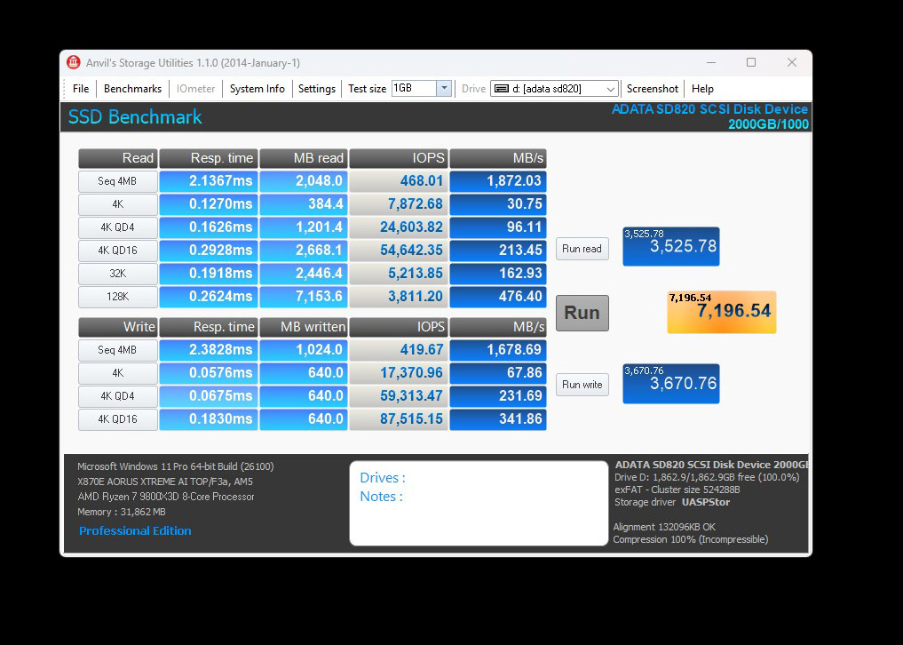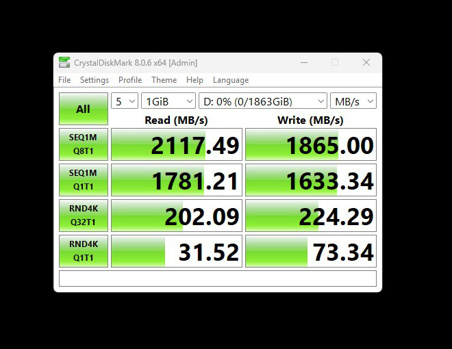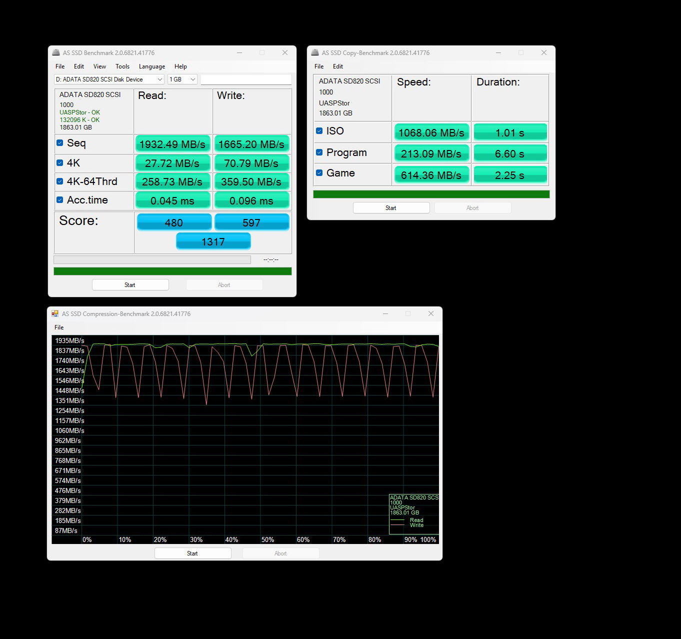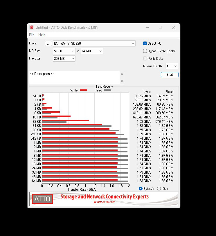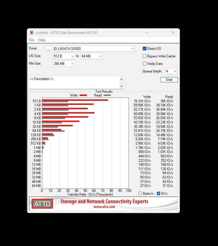 Nu avem parte de surprize majore, ADATA SD820 obtinand viteze secventiale de citire de peste 2100 MB/s in testele noastre, respectiv viteze de scriere de peste 1850 MB/s, numarul de operatii pe secunda (75K IO/s) fiind de asemenea impresionant pentru o solutie de stocare externa.