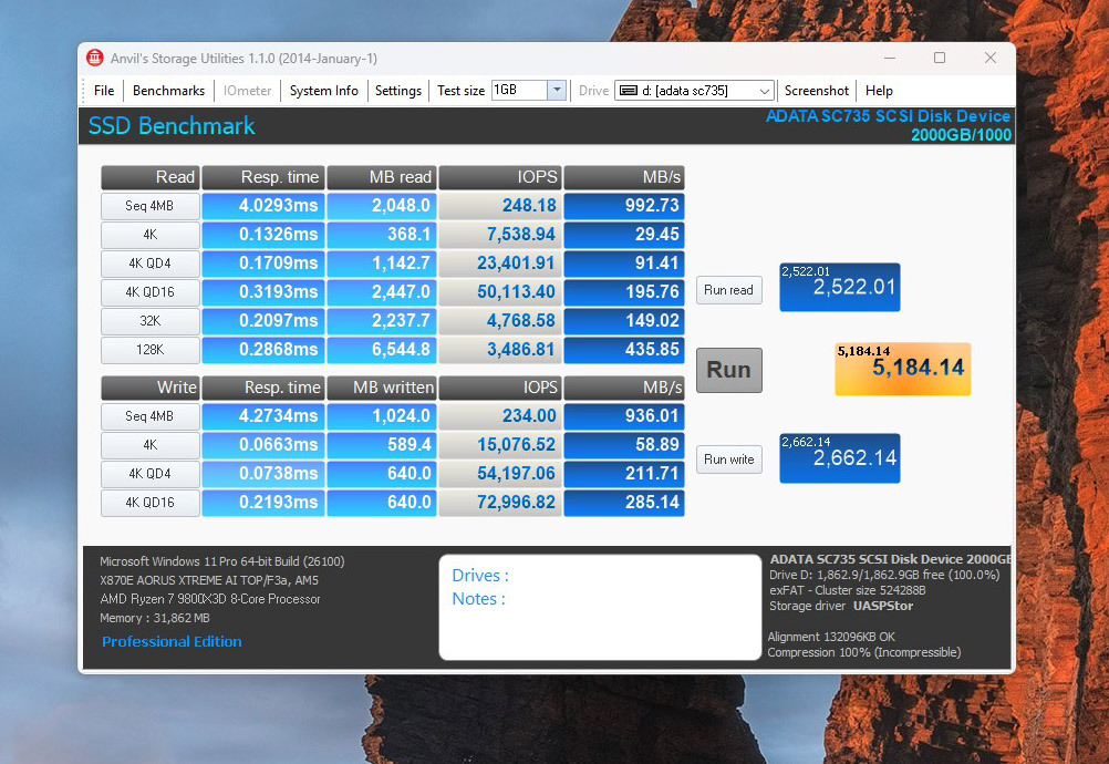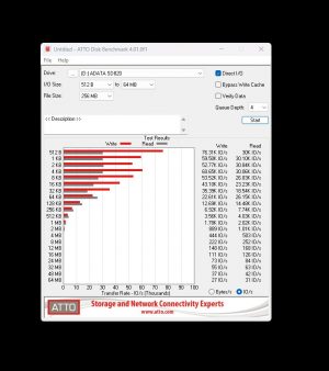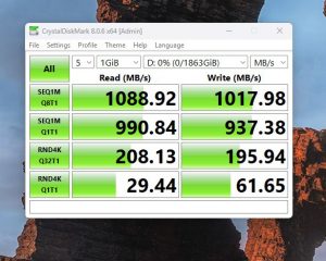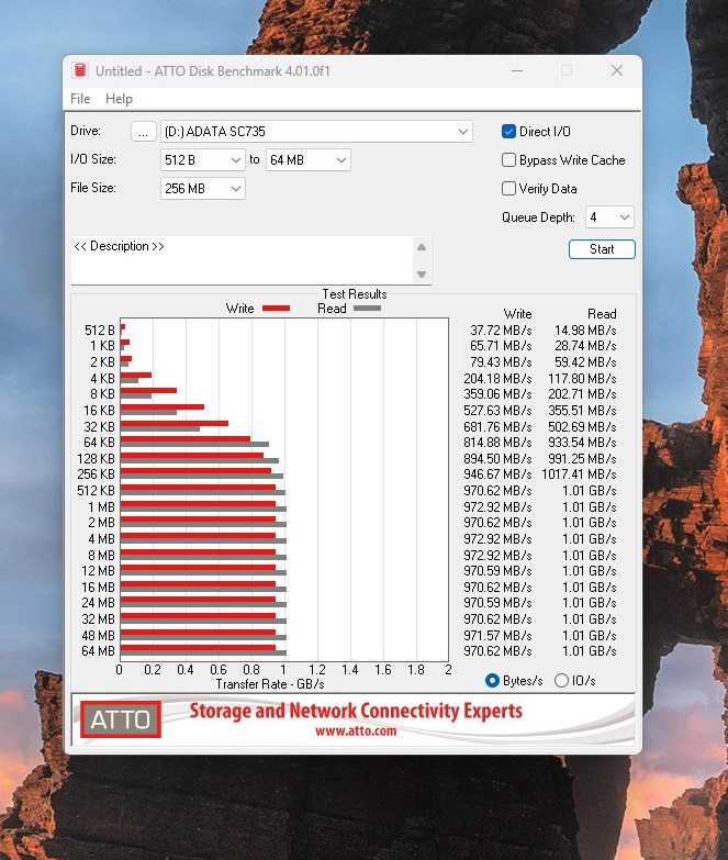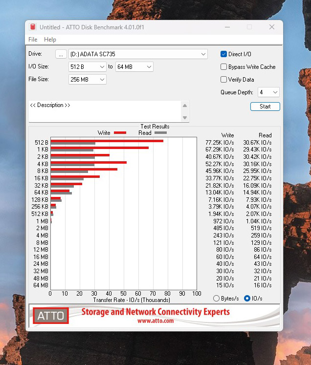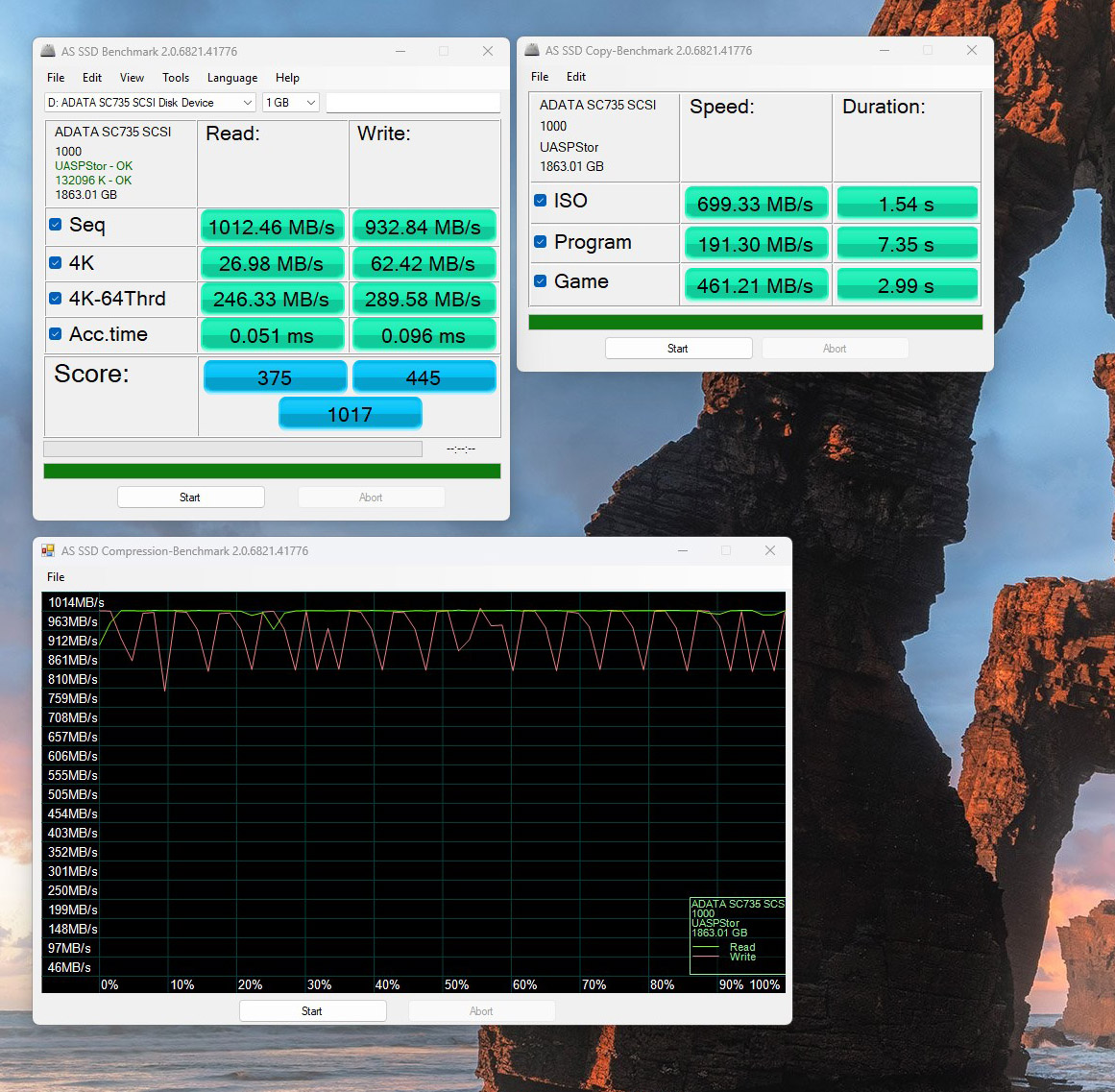 La randul sau, ADATA SC735 obtine viteze secventiale de citire de peste 1050 MB/s si viteze de scriere de peste 1000 MB/s. Merita mentionat faptul ca discutam despre SSD-uri fara IC-uri de RAM dedicate pentru cache, drept urmare trebuie sa fim atenti la raportul dintre cantitatea de date pe care dorim sa o transferam intr-o singura operatiune si procentul din memoria QLC alocat caching-ului.