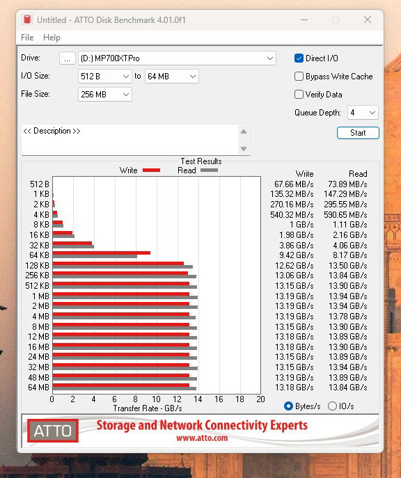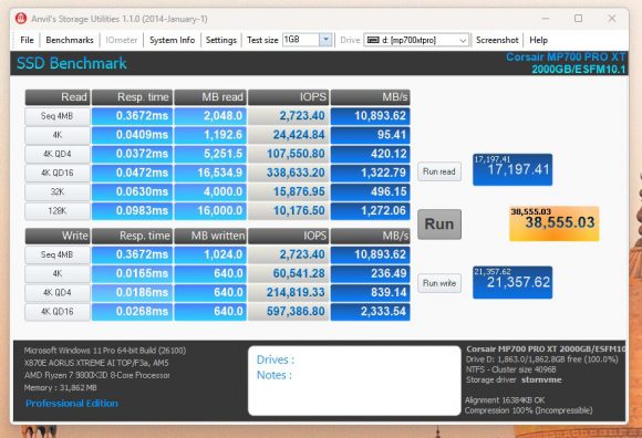 Ca de fiecare data, SSD-ul a fost montat in primul slot de pe placa de baza X870E AORUS Xtreme AI Top, utilizand heatsink-ul acesteia. Mai jos puteti vedea rezultatele obtinute de modelul de 2TB, pe platforma noastra de teste, acaltuita dintr-o placa de baza X870E AORUS Xtreme AI Topsi un procesor AMD Ryzen 7 9800X3D.