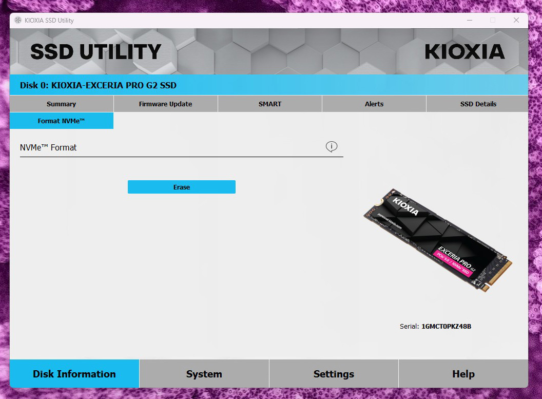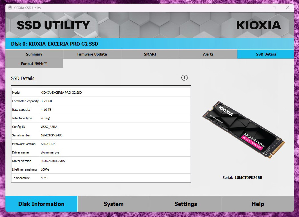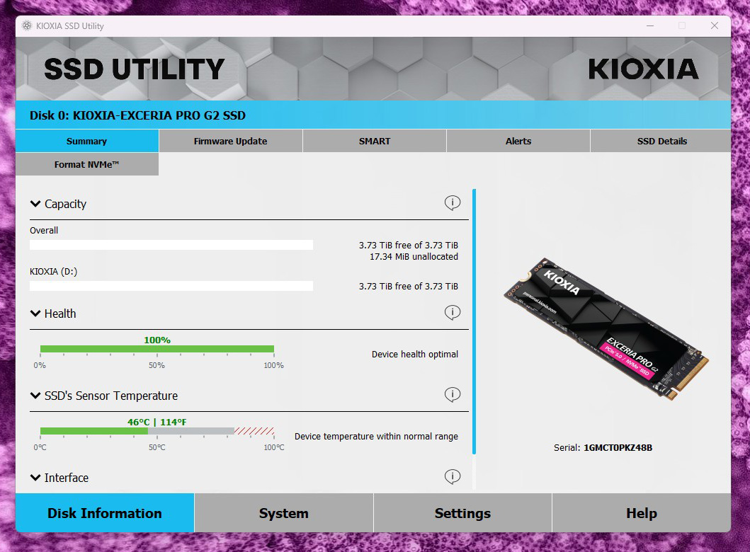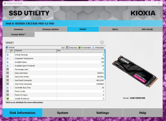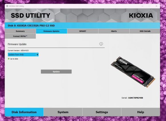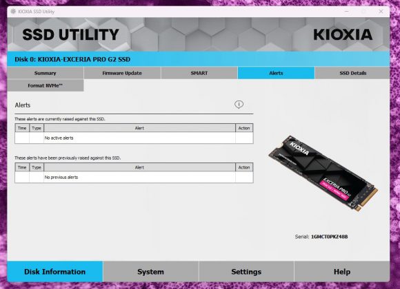 Utilizatorii de SSD-uri KIOXIA au la dispozitie o solutie dedicata de management a SSD-urilor instalate in sistem, denumita KIOXIA SSD Utility. Acesta ne ofera o imagine de ansamblu asupra sanatatii SSD-ului nostru, monitorizand parametrii cum ar fi temperatura si gradul de incarcare, oferind de asemenea posibilitatea de a efectua update-uri de firmware pentru SSD, sau operatiuni cum ar fi Secure Erase.