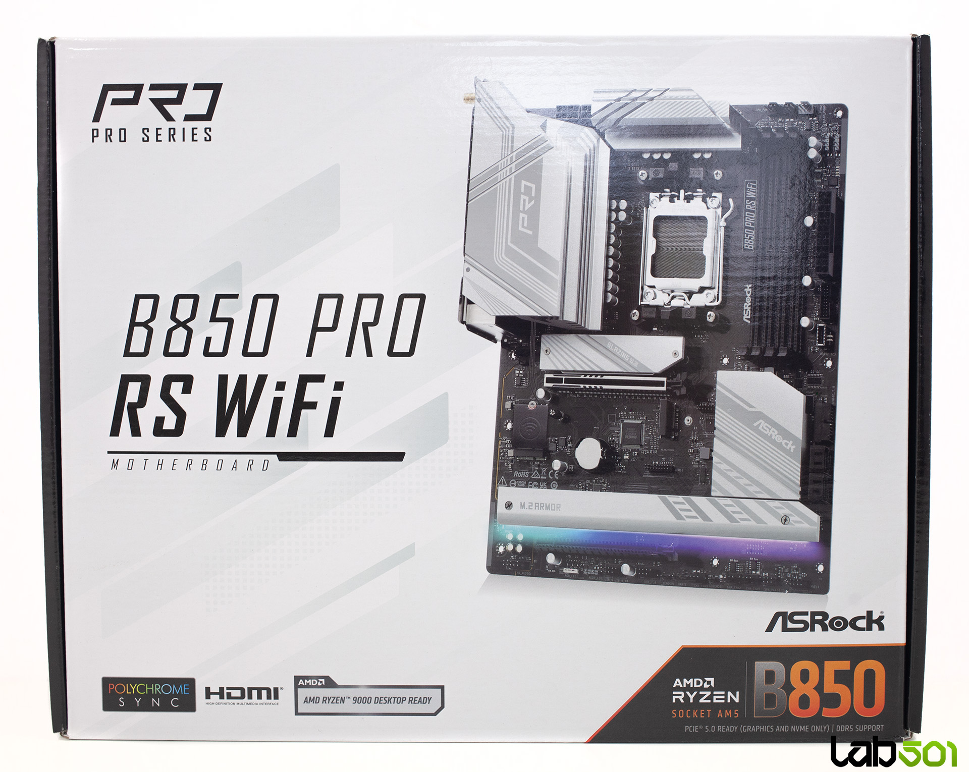 ASRock pastreaza pentru seria Pro RS o abordare simpla si functionala, iar B850 Pro RS WiFi nu face exceptie. Cutia este marcata de un design minimalist, dominat de alb si negru, fara accente agresive sau elemente de marketing excesiv, fiind genul de ambalaj care transmite clar faptul ca avem de-a face cu un produs orientat spre functionalitate.