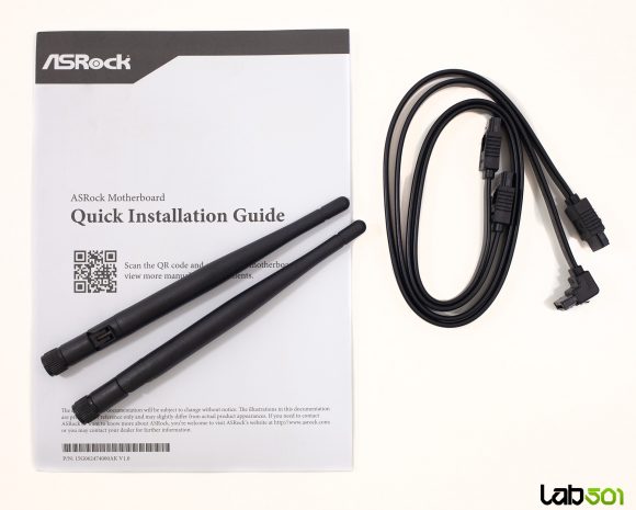La interior, placa este protejata corespunzator, iar accesoriile sunt exact cele de care ai nevoie pentru a pune sistemul in functiune si… cam atat. Gasim doua cabluri SATA, antenele pentru modulul WiFi si un ghid rapid de punere in functiune. Se observa curentul general din industrie: lipsa unui DVD cu drivere si mutarea intregii experiente de instalare in zona online.