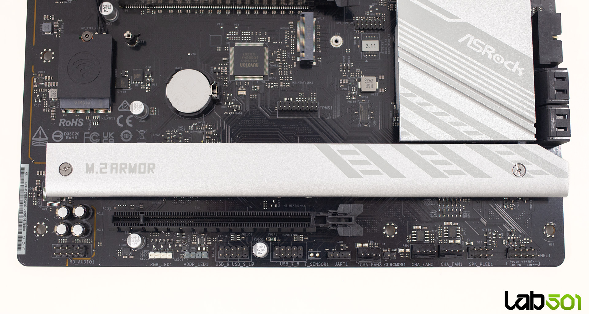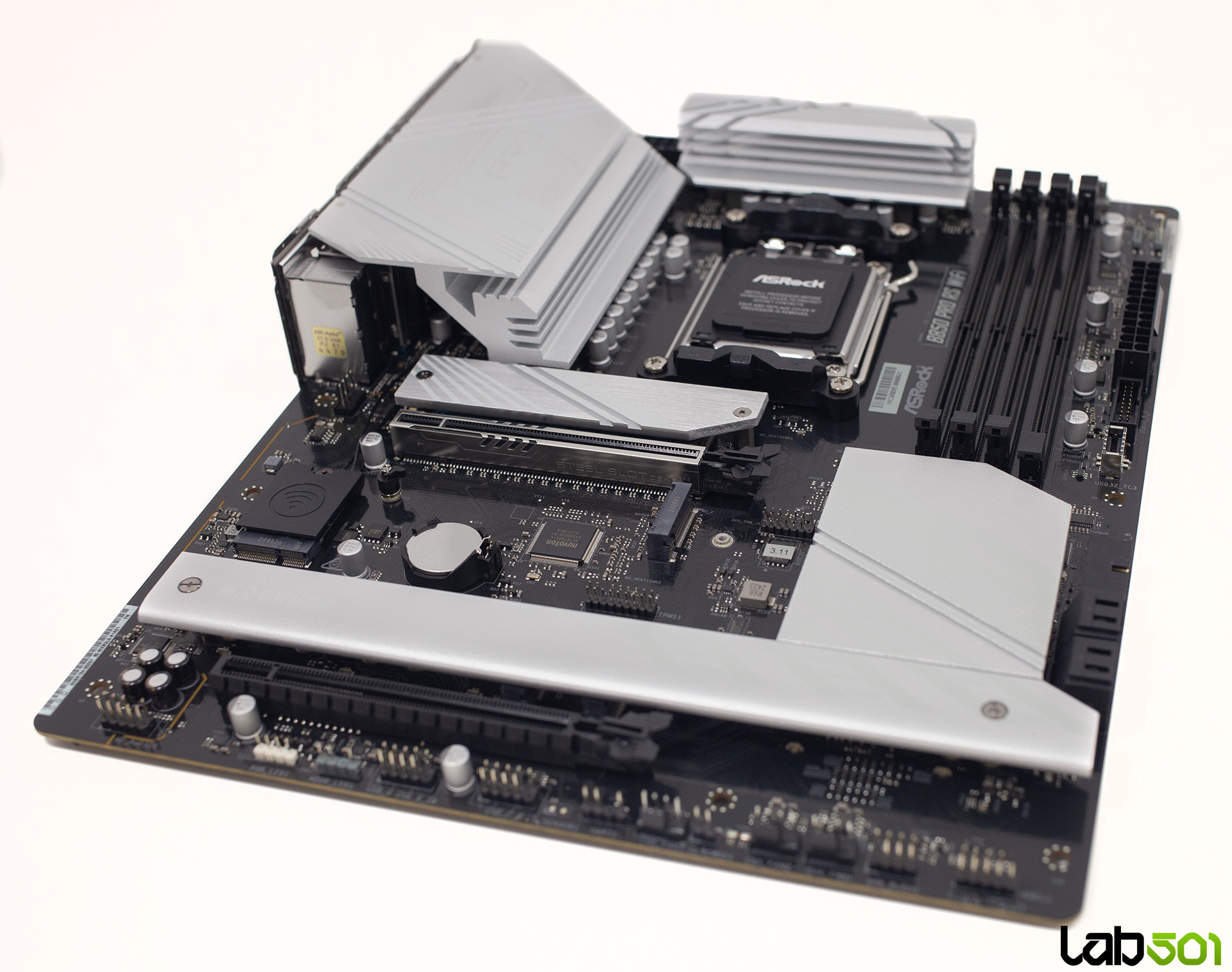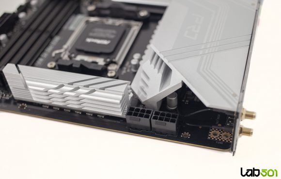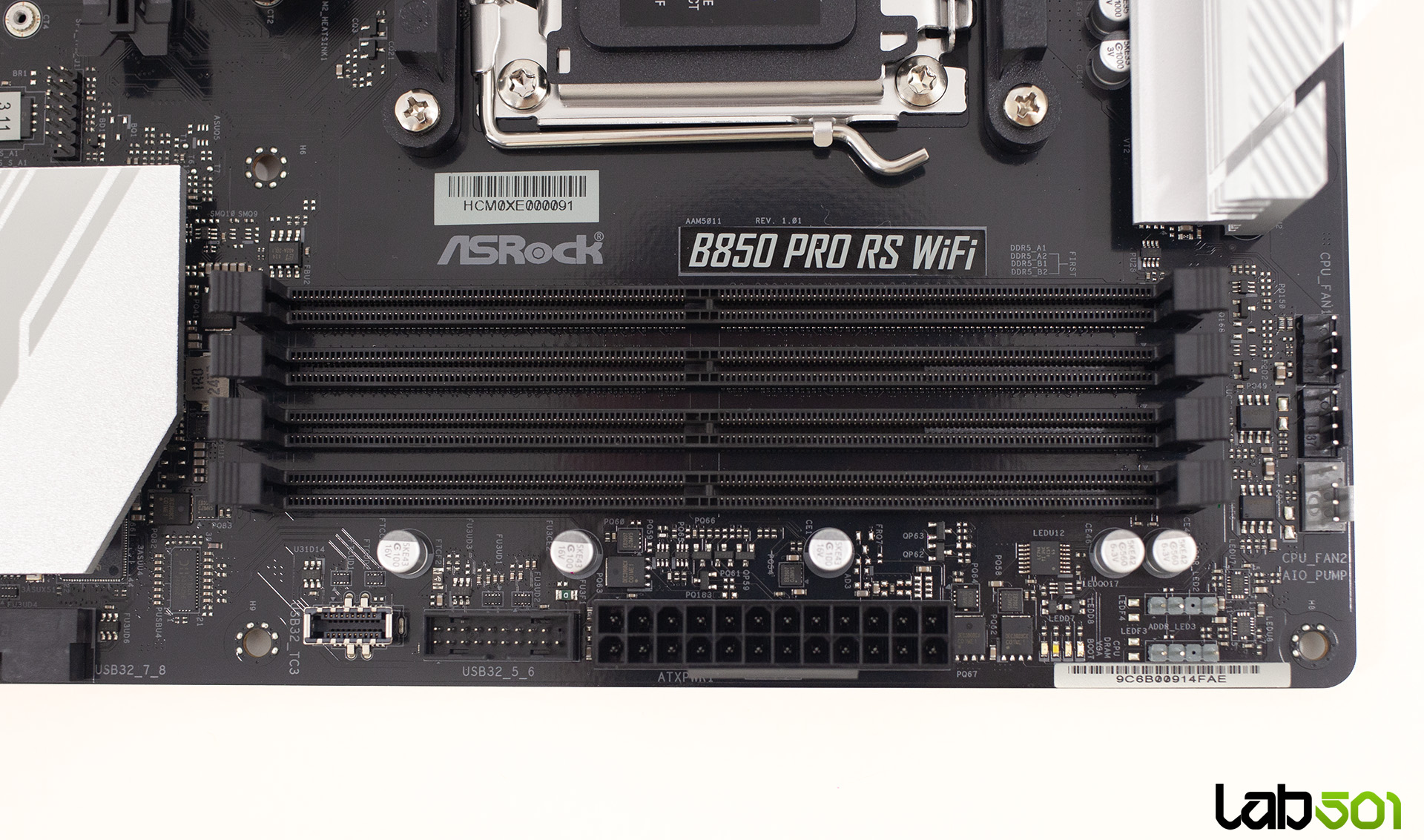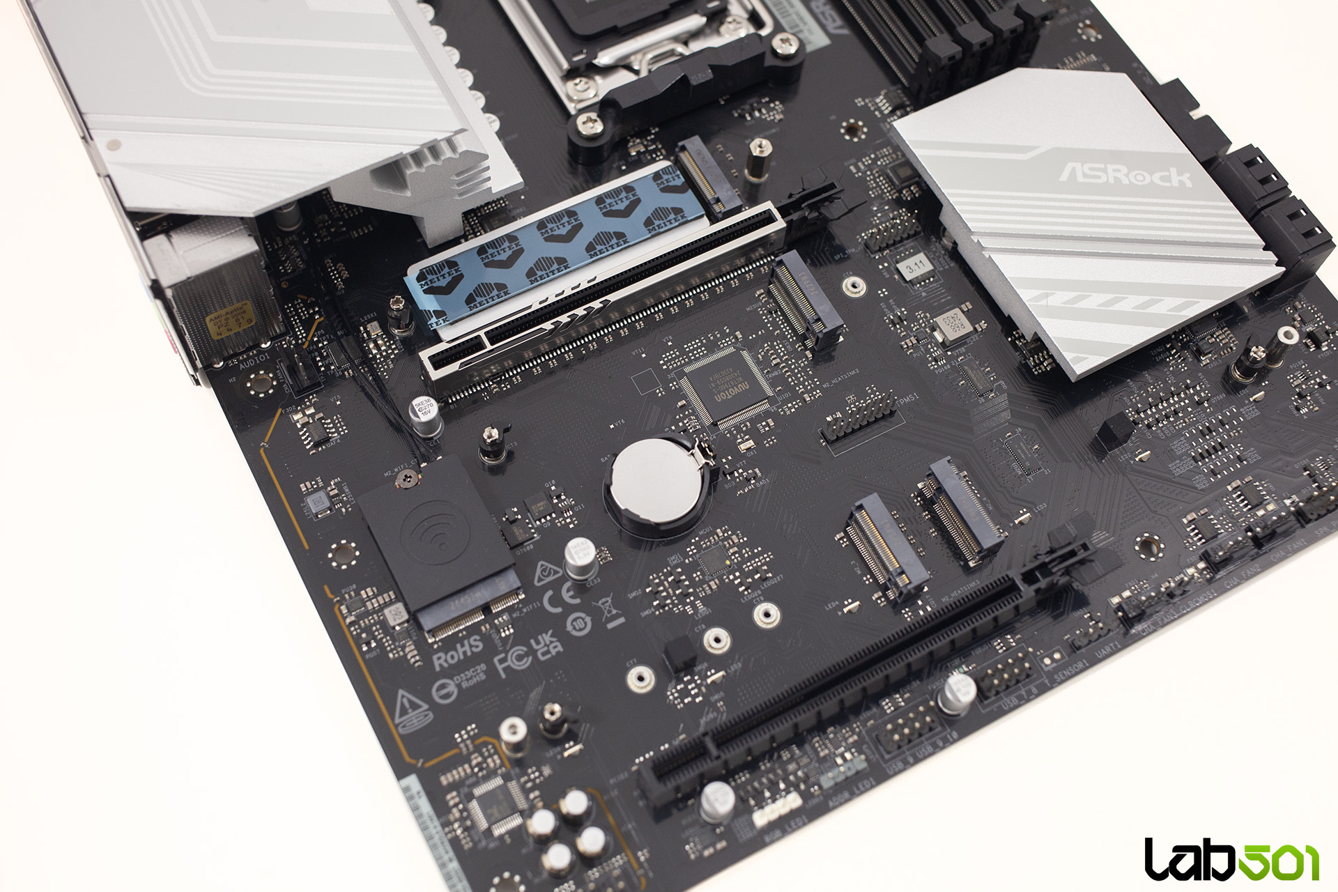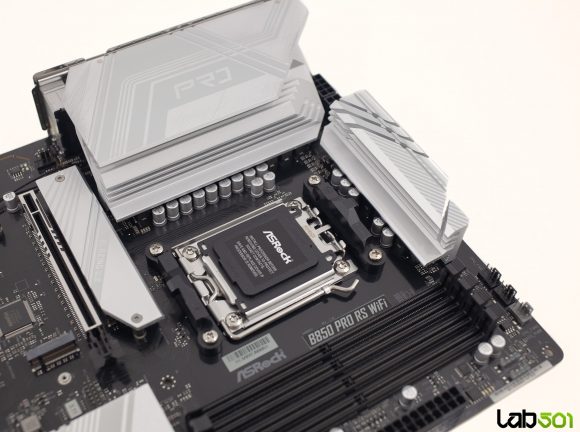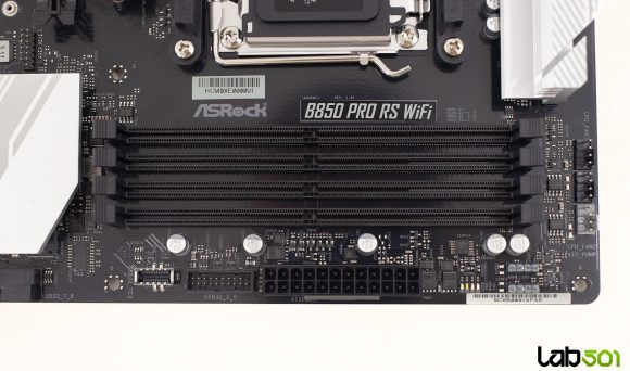 La nivel de constructie, ASRock B850 Pro RS WiFi se bazeaza pe un PCB cu 8 straturi, un aspect important mai ales in contextul DDR5 si PCIe Gen5, unde integritatea semnalului devine critica. Layout-ul este clasic si bine gandit, conectorii principali fiind pozitionati logic, ceea ce faciliteaza un cable management curat, iar zona sloturilor M.2 este distribuita eficient in partea inferioara a PCB-ului.