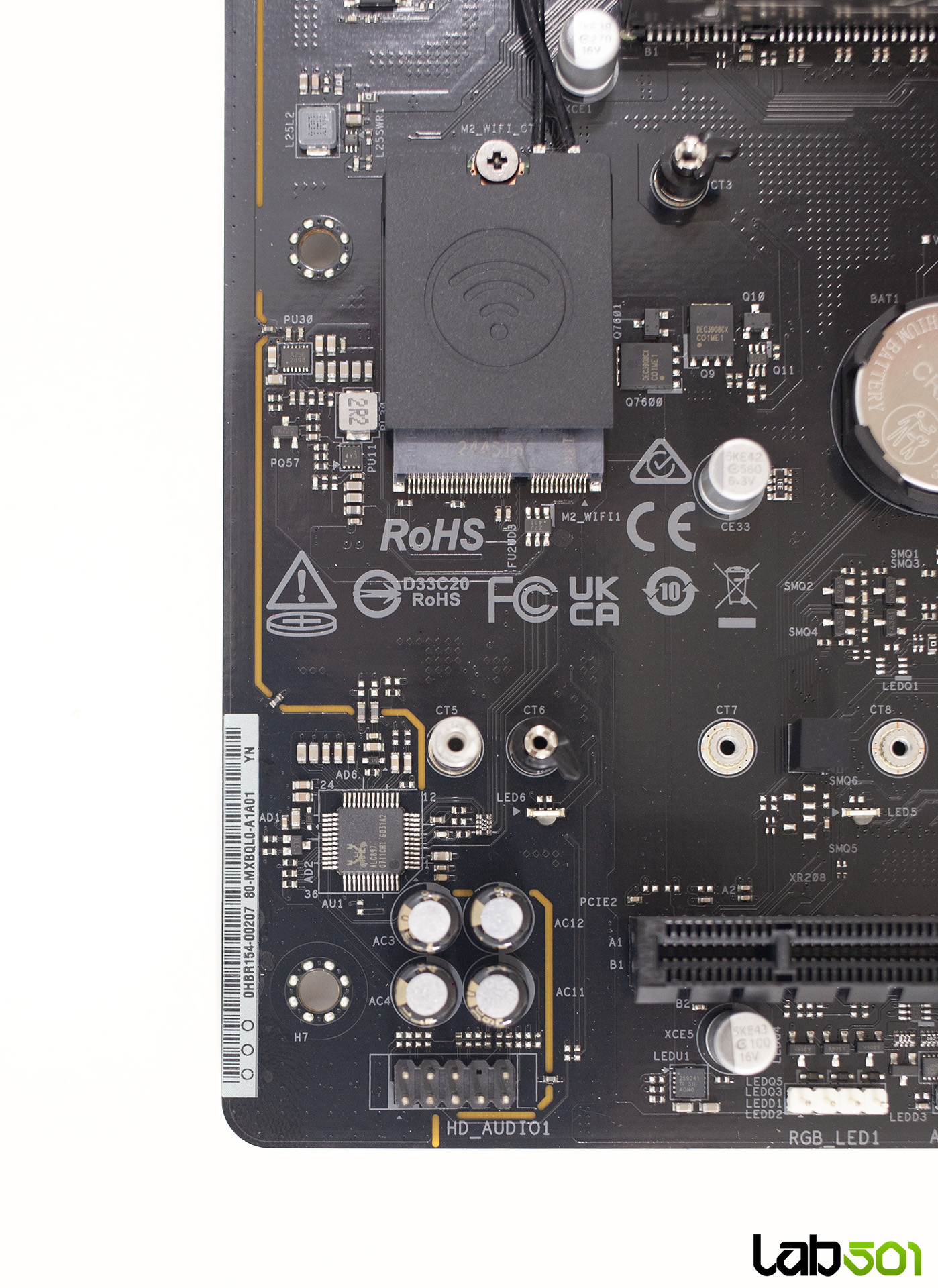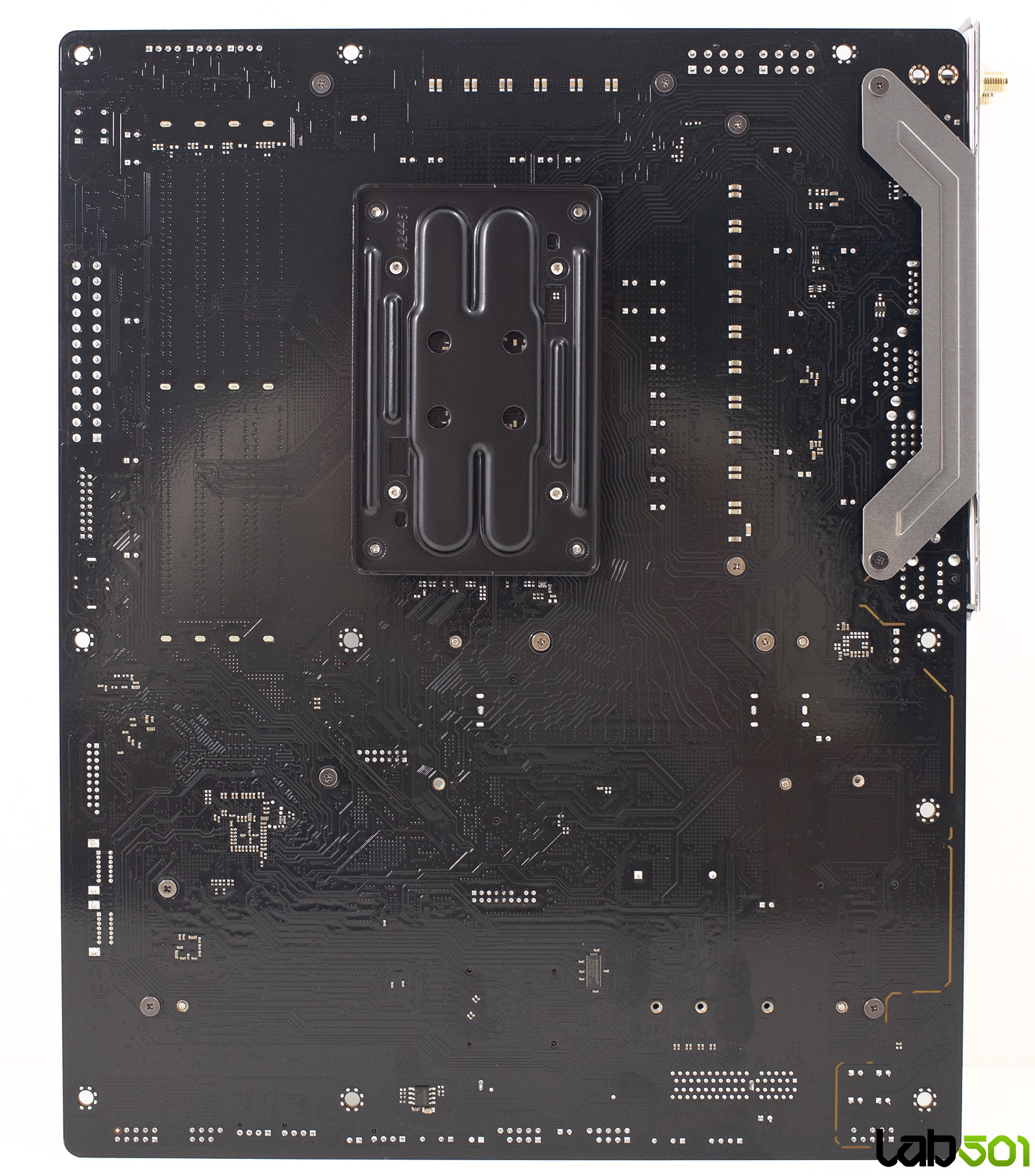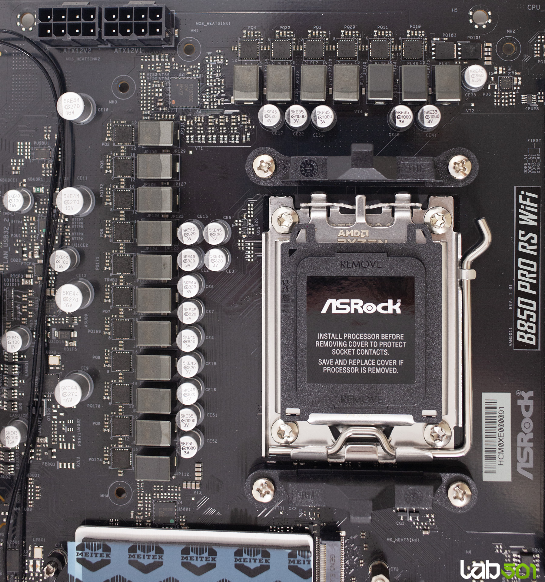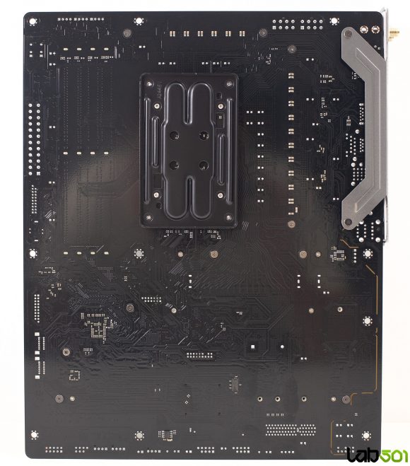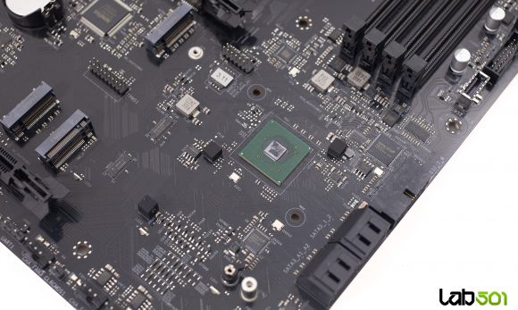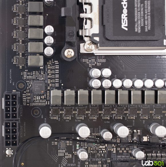 VRM-ul este alcatuit din 18 faze, mai mult decat suficient pentru procesoarele care pot fi montate pe acest socket. Majoritatea etajului de alimentare este asigurata de integrate Vishay SiC659 de 80A, care deservesc vCore (14 faze), SoC (2 faze) si MISC (1 faza), o faza suplimentara fiind realizata cu ajutorul unei perechi de MOSFET-uri Potens Semiconductor DEC3908CX si DC39F2BX. Controlul acestora este realizat de RT3672EE si RT3678BE, ambele produse de Richtek.