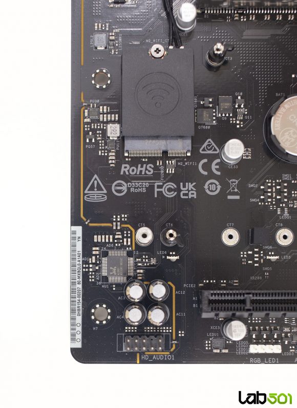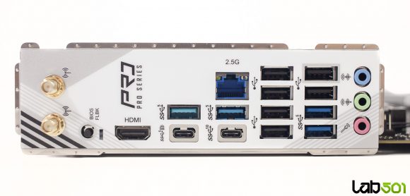 Backpanel-ul este bine echilibrat si acopera toate necesitatile uzuale. Gasim multiple porturi USB, inclusiv doua Type-C (unul USB 3.2 Gen2, iar celalalt USB 3.2 Gen1), precum si patru porturi USB 3.2 Gen1 (doua direct din CPU, de culoare bleu, si doua din PCH, de culoare albastru inchis), conectorul RJ-45 pentru reteaua 2.5G, precum si cei doi conectori pentru antenele WiFi 6E. Pe partea video avem HDMI si iesire prin USB-C (DP Alt Mode), dar acestea depind, evident, de prezenta unui procesor cu iGPU, fiind o implementare standard pentru platforma AM5.