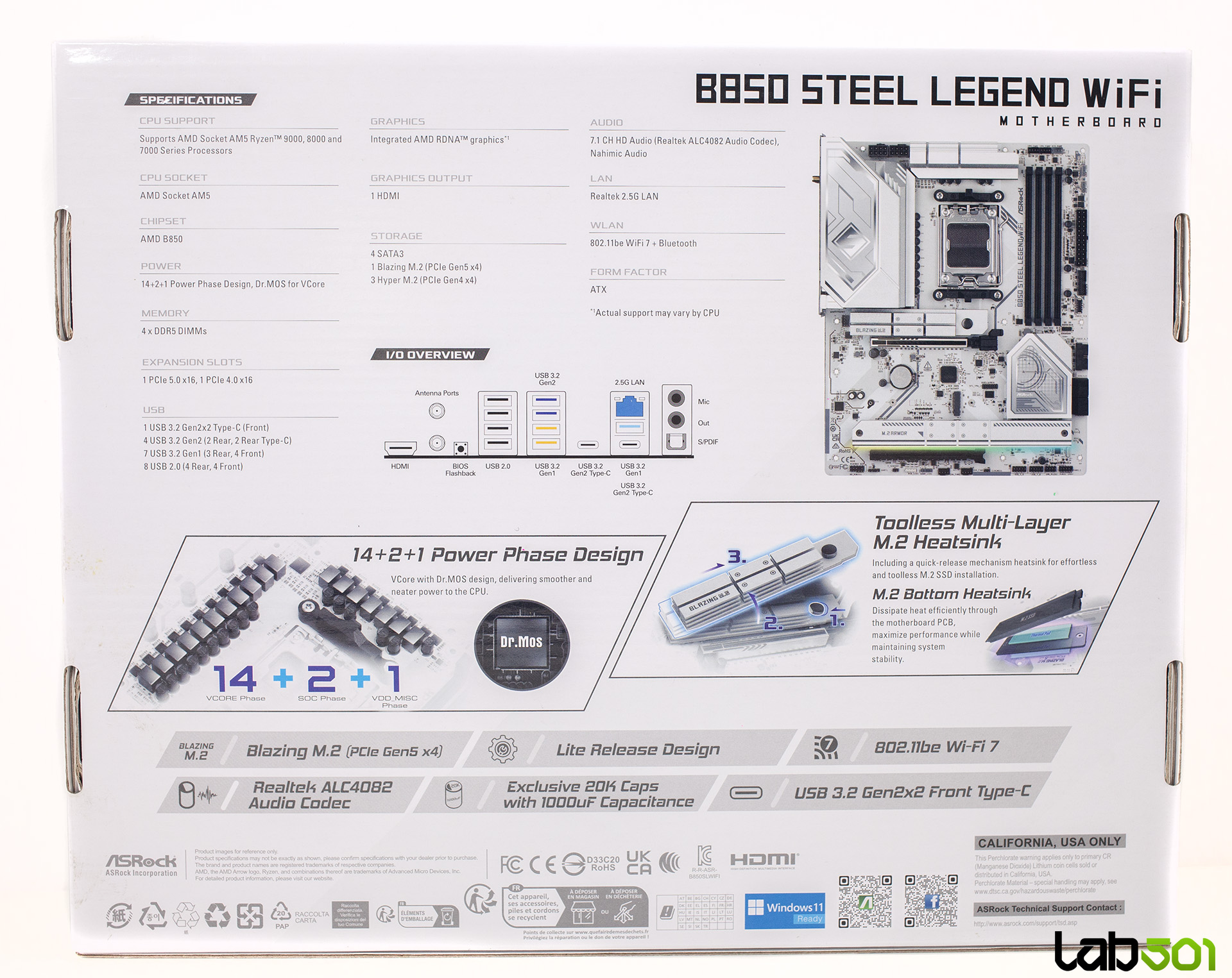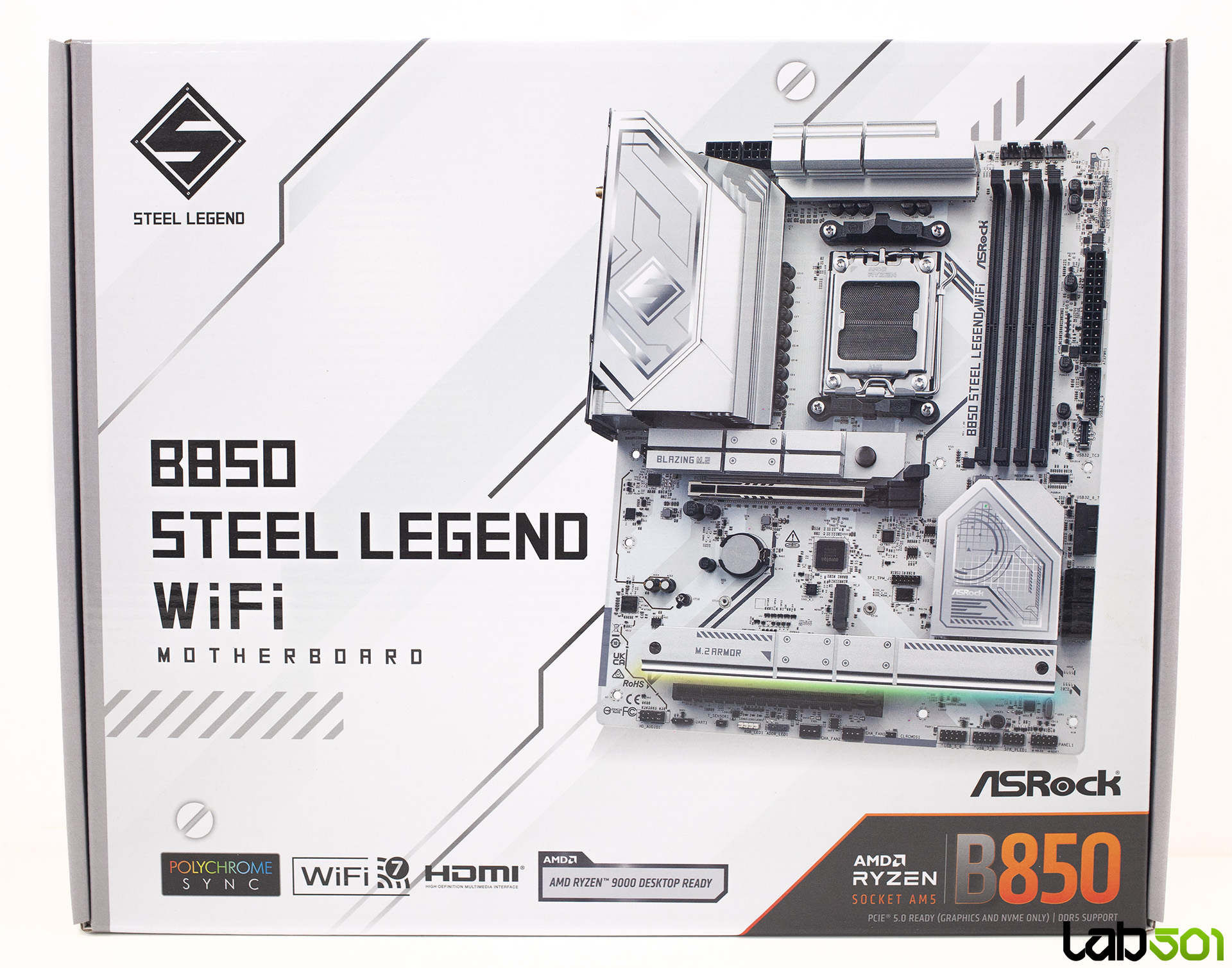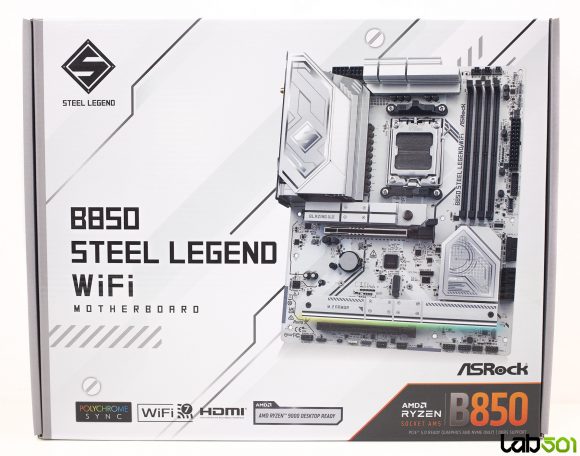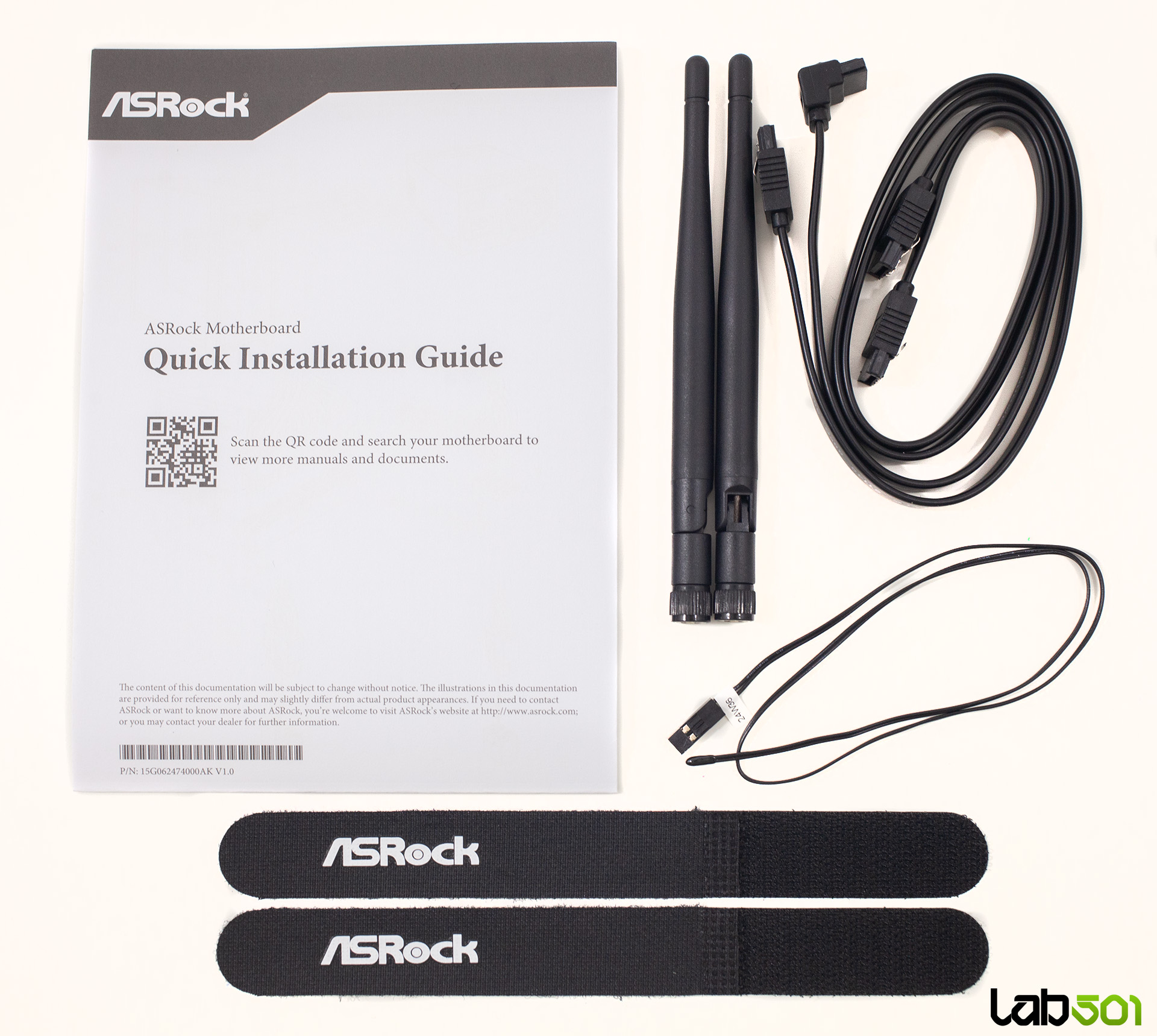 Ambalajul respecta linia vizuala a seriei Steel Legend, cu grafica in tonuri de alb si gri metalizat, in care sunt evidentiate principalele caracteristici ale produsului. Cutia ofera o protectie adecvata continutului, iar placa de baza este ambalata intr-o punga antistatica si fixata intr-un suport din carton. Accesoriile sunt organizate separat, intr-un compartiment dedicat, unde gasim doua cabluri SATA, antenele pentru modulul WiFi, un senzor de temperatura, doua benzi velcro pentru managementul cablurilor, precum si un ghid rapid de instalare.