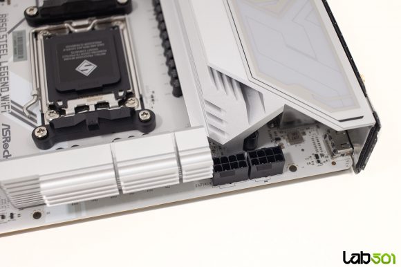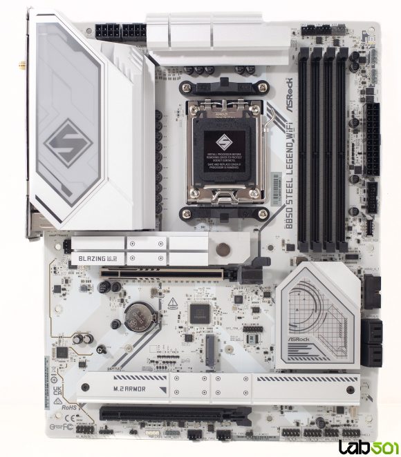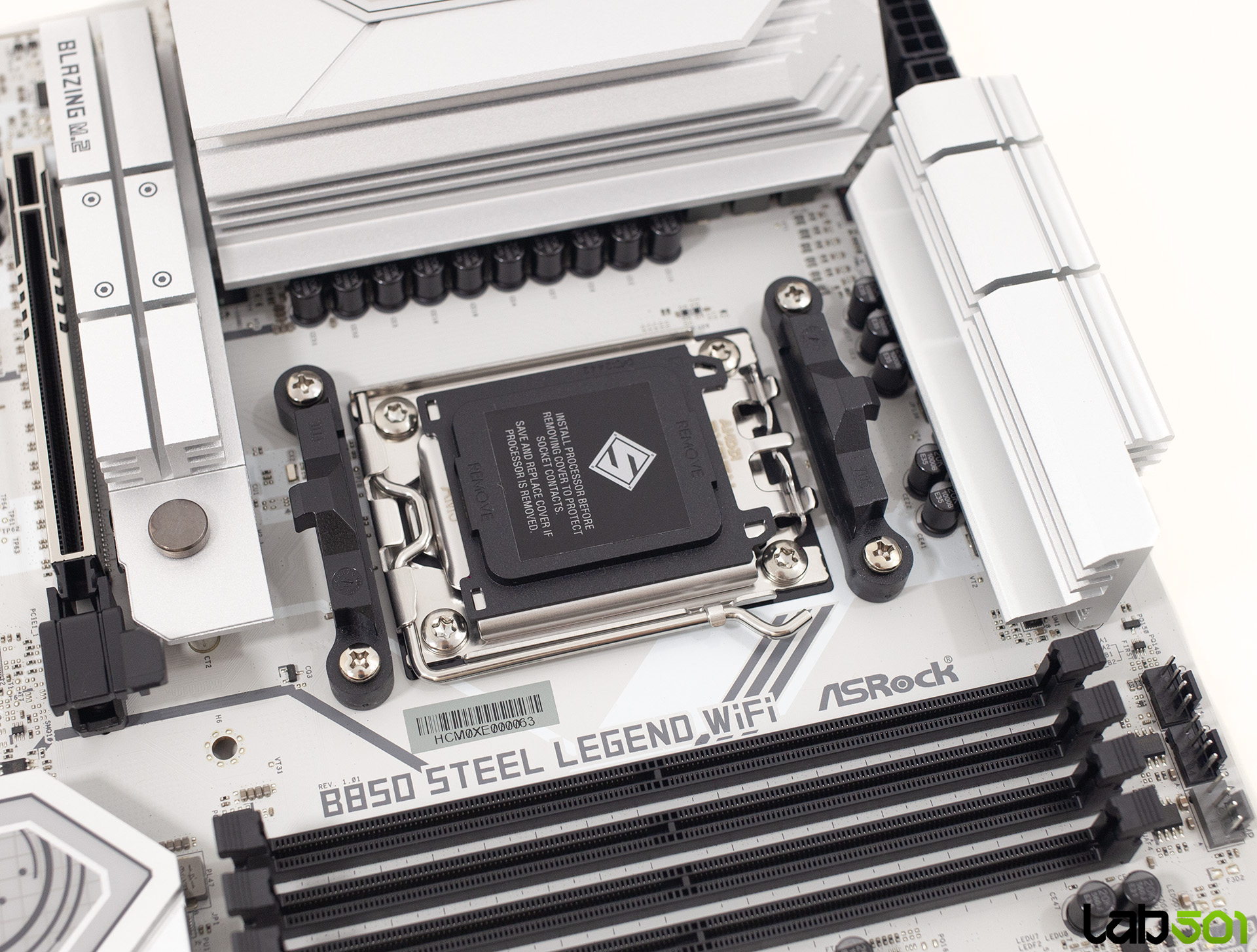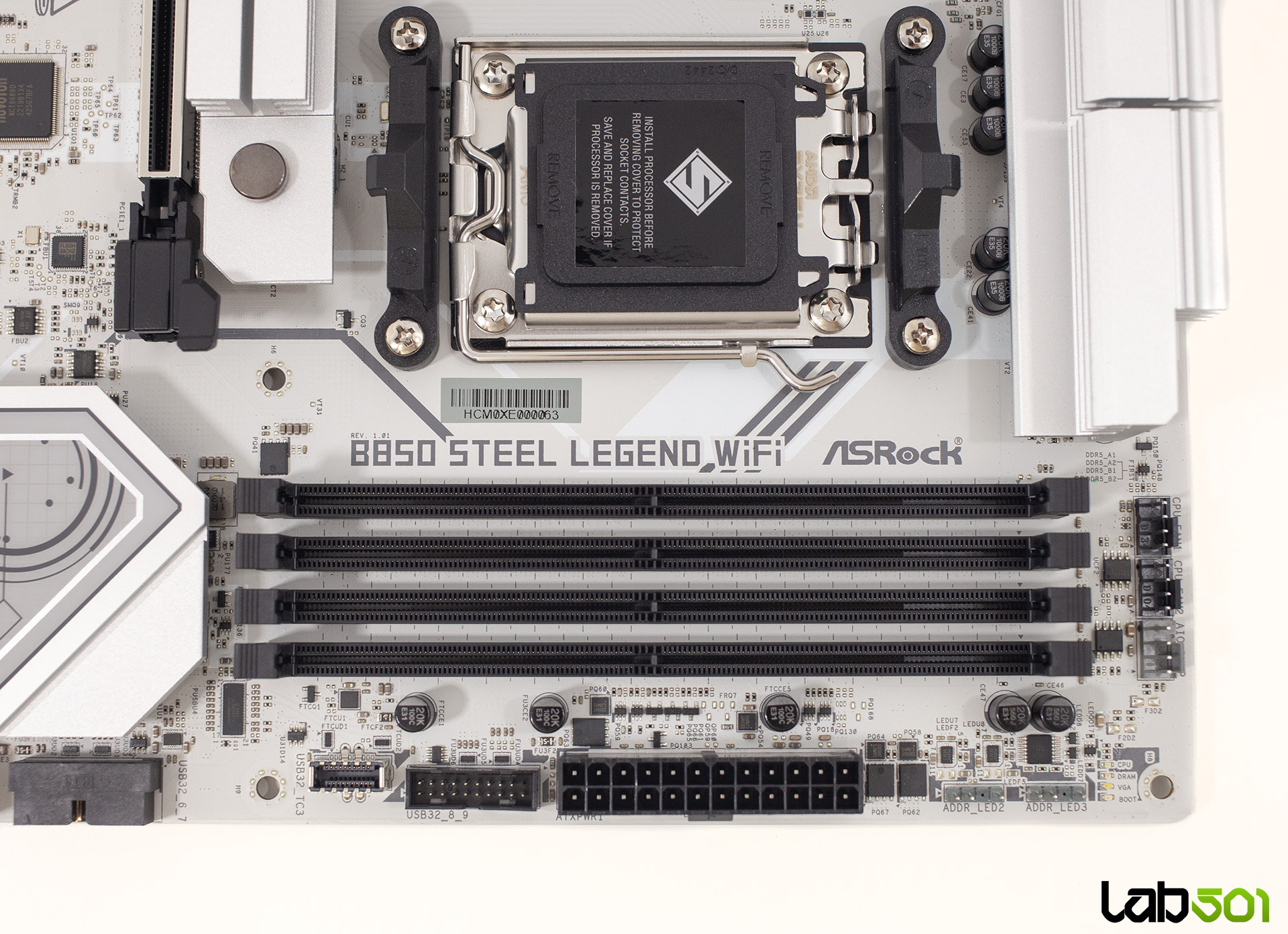 ASRock B850 Steel Legend WiFi utilizeaza un PCB cu 8 straturi, un aspect important mai ales in contextul standardelor DDR5 si PCIe Gen5, unde integritatea semnalului devine critica. Layout-ul este clasic si bine gandit, conectorii principali fiind pozitionati logic, ceea ce faciliteaza un cable management curat, iar zona sloturilor M.2 este distribuita eficient in partea inferioara a PCB-ului.