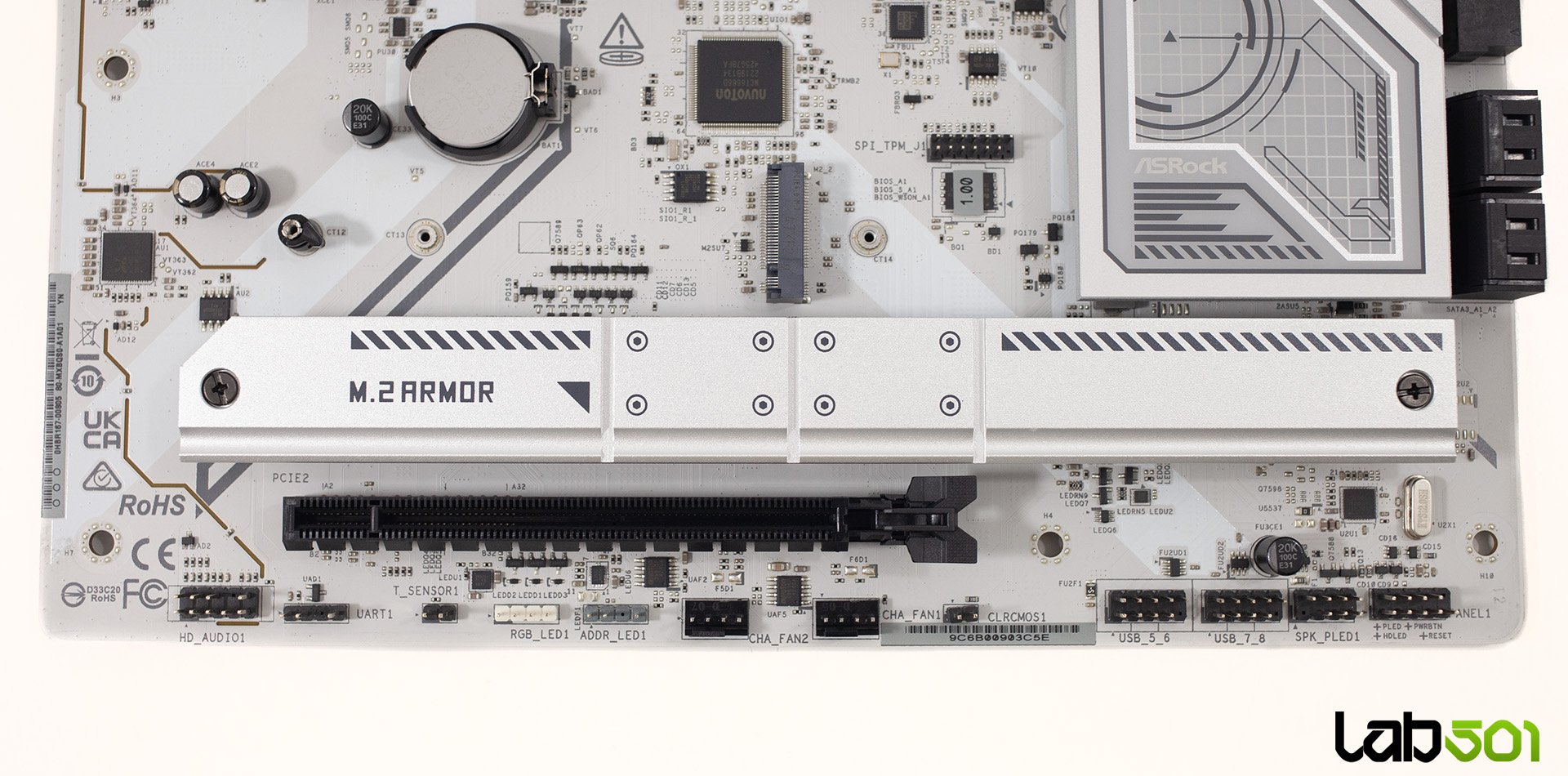 Pe partea de stocare clasica avem patru porturi SATA3, suficiente pentru majoritatea sistemelor moderne. Toate cele patru porturi sunt gestionate de un controller dedicat ASMedia ASM1061, ceea ce ofera o flexibilitate sporita in alocarea resurselor PCH-ului B850. Implementarea USB este generoasa, atat pe backpanel, cat si prin headere interne. Exista suport pentru panoul frontal atat pentru USB Type-C (USB 3.2 Gen2x2), cat si pentru doua headere care pot deservi pana la patru porturi USB 3.2 Gen1, aliniind astfel placa la cerintele actuale ale carcaselor moderne.