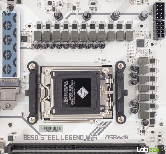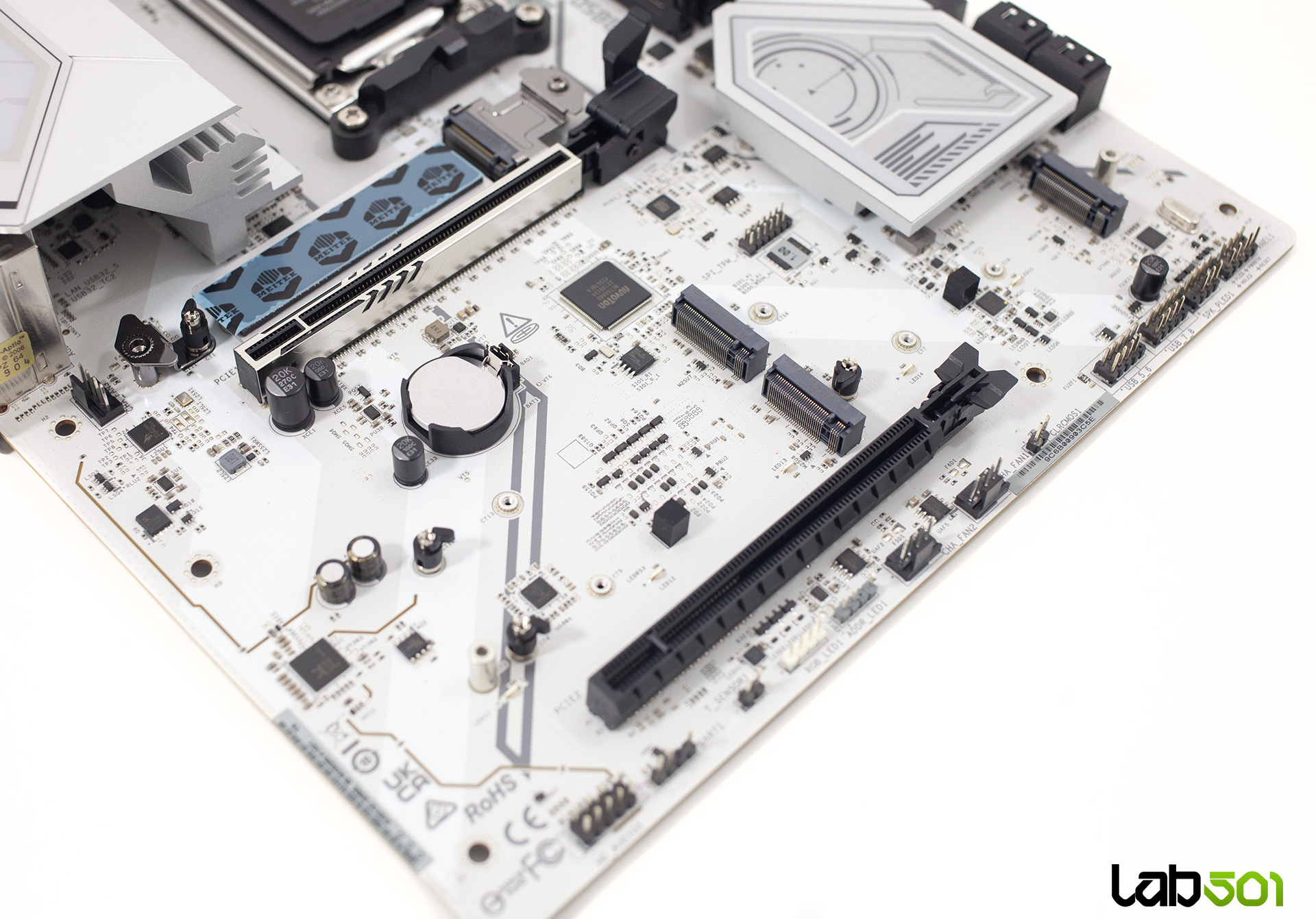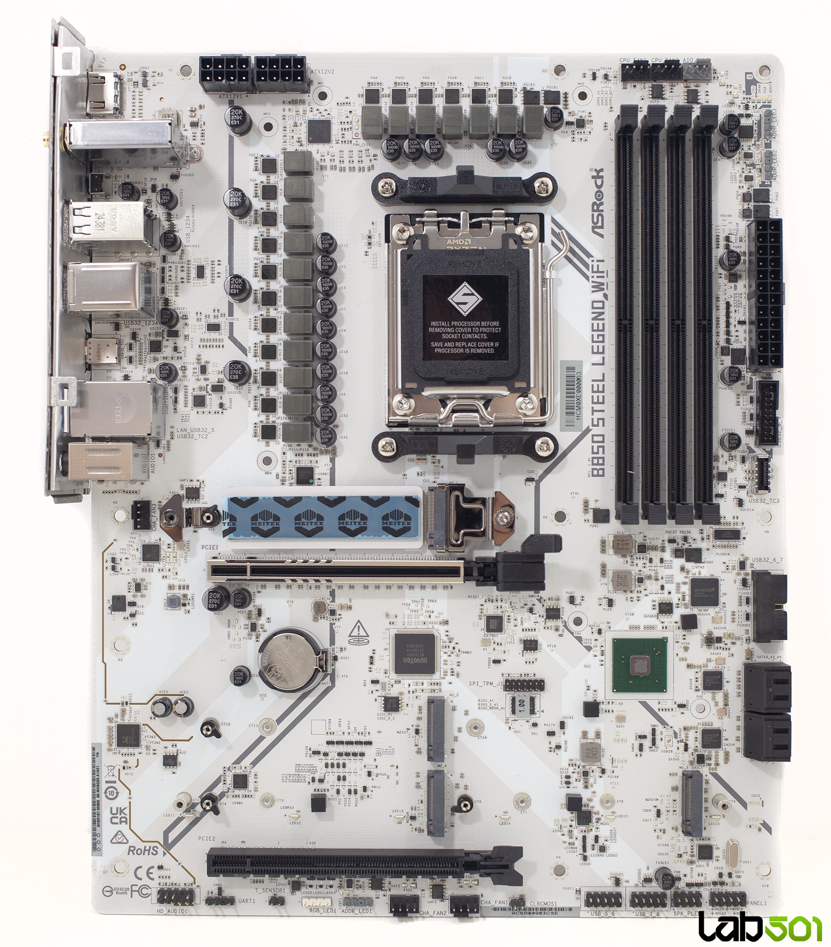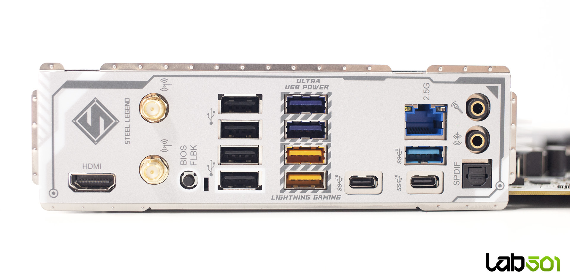 Backpanel-ul este bine echilibrat si acopera toate necesitatile uzuale, fiind inclus si un buton de BIOS Flashback. Avem la dispozitie multiple porturi USB, inclusiv doua USB 3.2 Gen2 Type-C, trei USB 3.2 Gen1 – dintre care doua sunt etichetate Lightning Gaming si colorate in galben, fiind optimizate pentru latenta redusa (unul conectat direct la CPU, celalalt la PCH) – precum si doua porturi USB 3.2 Gen2 de culoare albastru inchis (unul din CPU si unul din PCH). Lista este completata de patru porturi USB 2.0 (culoare negru), conectorul RJ-45 pentru reteaua 2.5G si cei doi conectori pentru antenele modulului 2×2 WiFi 7. Pe partea video regasim o iesire HDMI 2.1, functionala evident doar in prezenta unui procesor echipat cu iGPU, o implementare standard pentru platforma AM5.