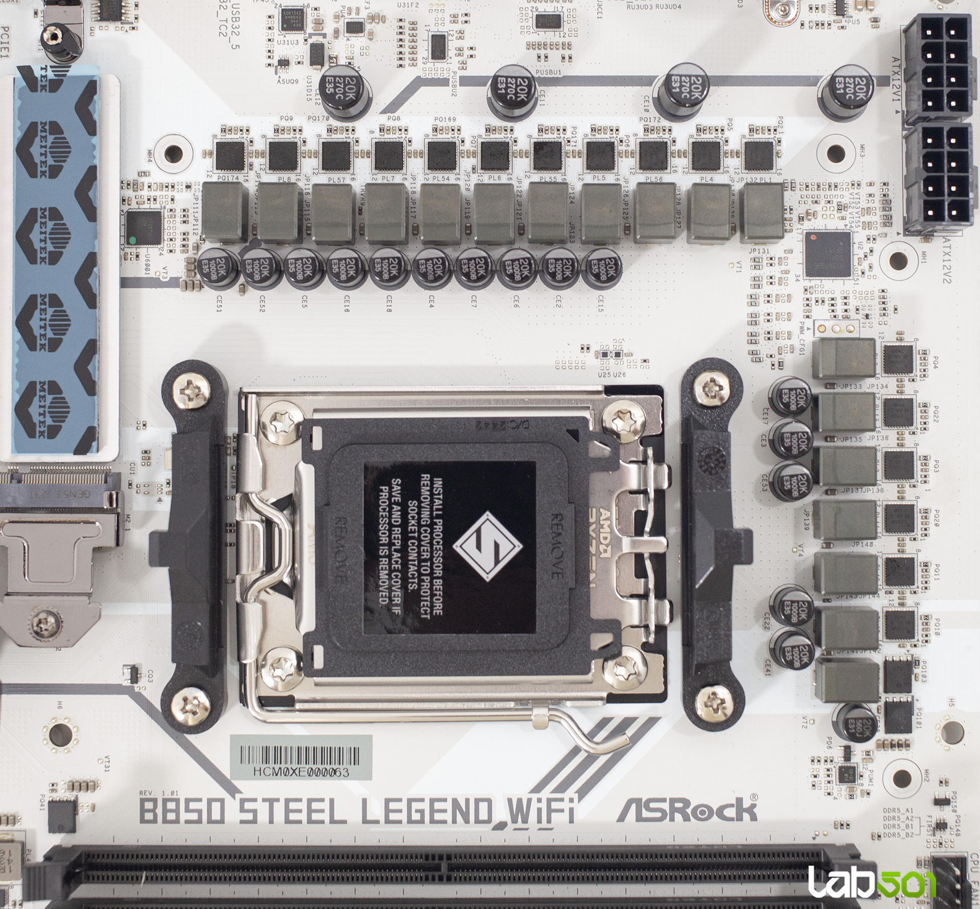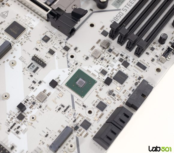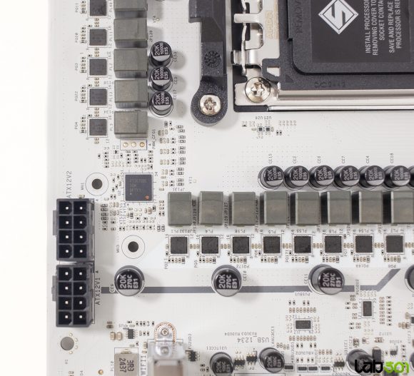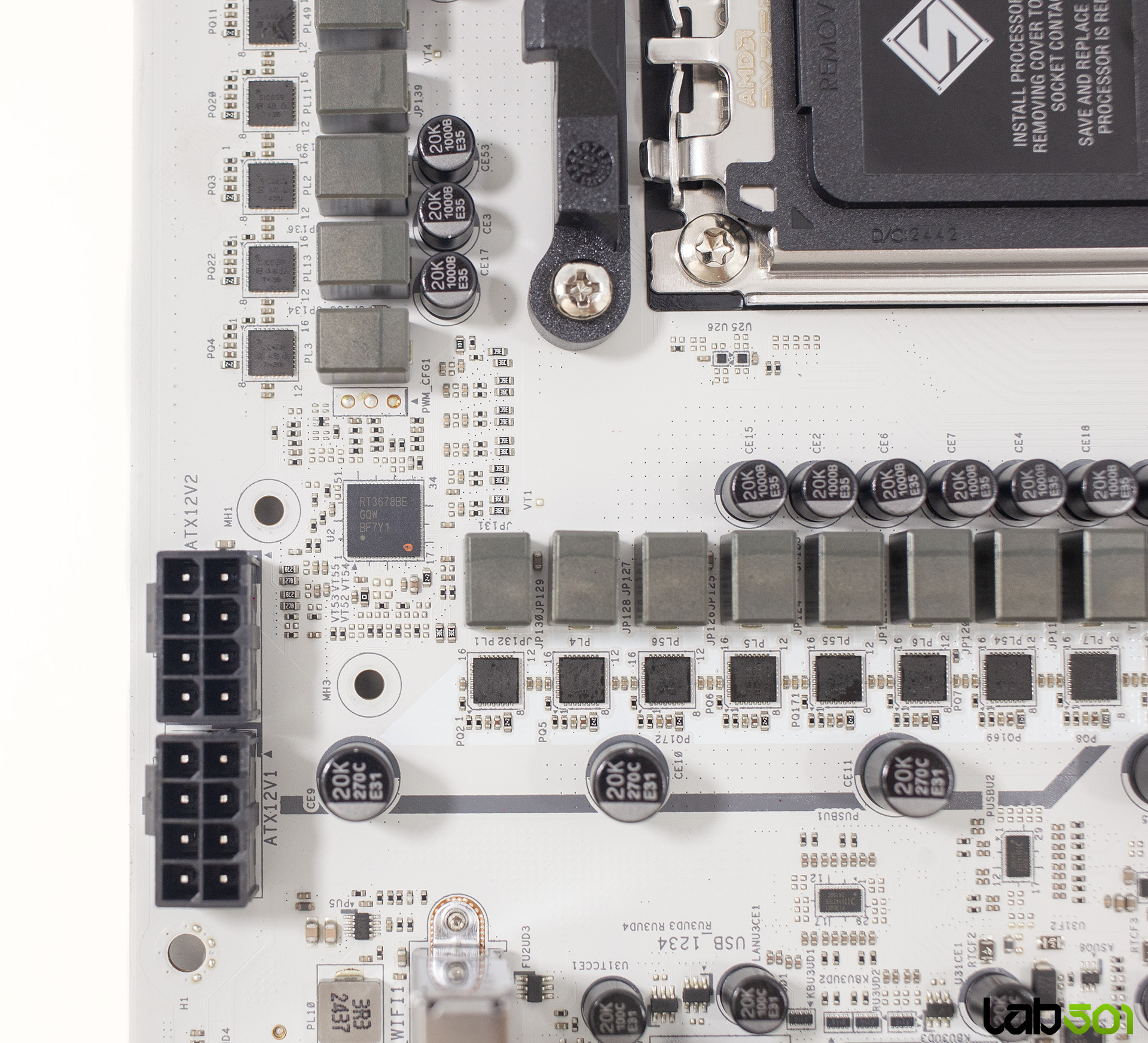 VRM-ul este alcatuit din 18 faze, mai mult decat suficient pentru orice procesor compatibil cu acest socket. Majoritatea etajului de alimentare este bazata pe integrate Vishay SiC659 de 80A, care deservesc vCore (14 faze), SoC (2 faze) si MISC (1 faza), o faza suplimentara fiind implementata cu ajutorul unei perechi de MOSFET-uri Sinopower 4508NH, capabile sa sustina pana la 48A. Controlul este asigurat de doua controllere Richtek, RT3672EE si RT3678BE.