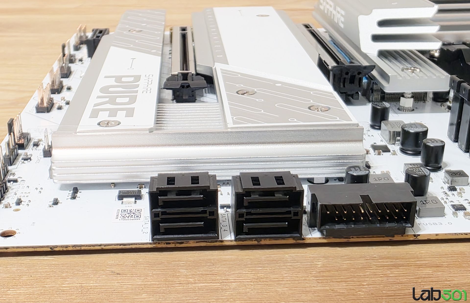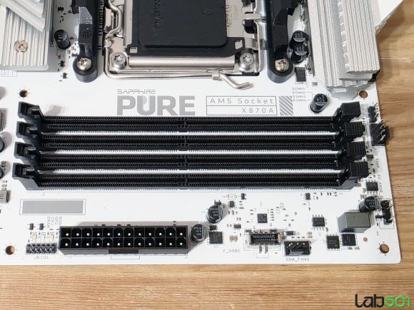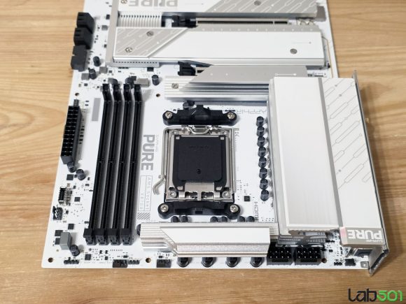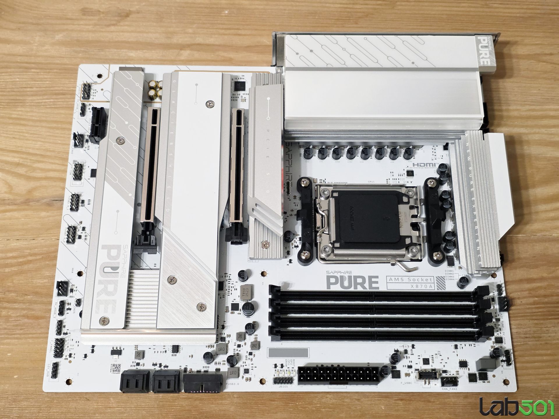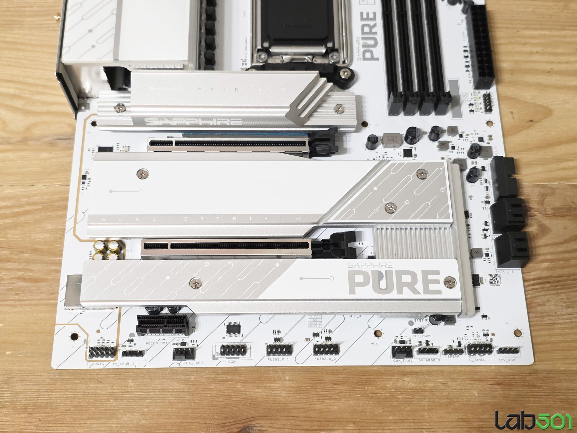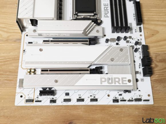 Avem de-a face cu o placa de baza alba, eleganta, cu un PCB aerisit si un sistem de racire capabil (Frosty Cooling), chiar daca discutam despre o implementare accesibila. Sapphire PURE X870A WIFI 7 este echipata cu 1 slot PCI-E 5.0 x16 conectat la procesor, 1 slot PCI-E 4.0 x16 (x4) si 1 slot PCI-E 3.0 x1 (x1) conectate la chipset, 1 conector M.2 PCI-E 5.0 x4 conectat la procesor, 2 conectori M.2 PCI-E 4.0 x 4 si 4 conectori S-ATA 3 conectati la chipset. Conectorii M.2 sunt echipati cu heatsink-uri din aluminiu, fiecare SSD fiind protejat de un radiator dedicat.