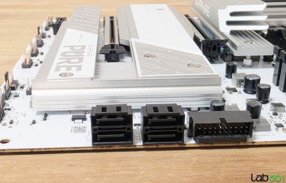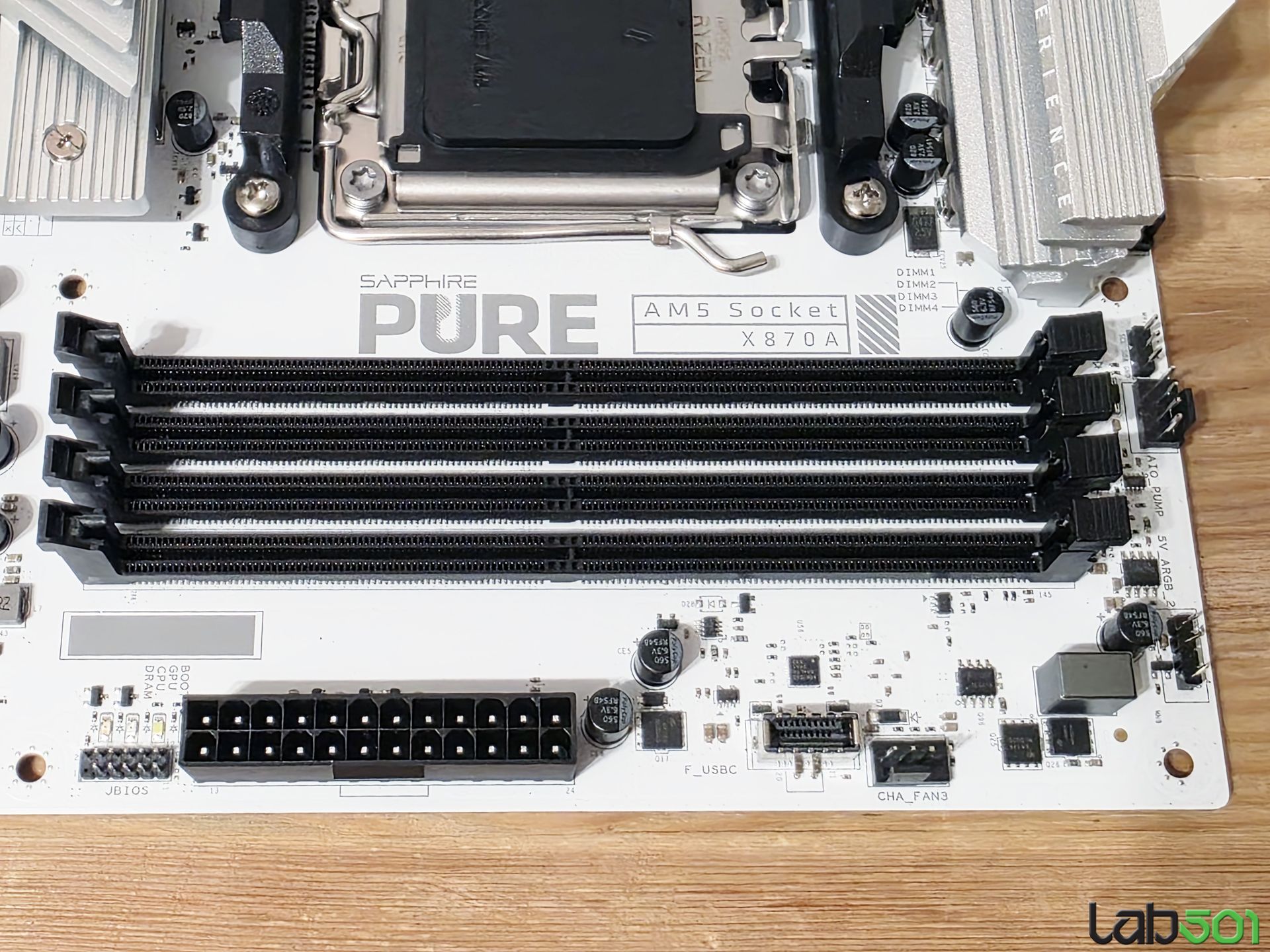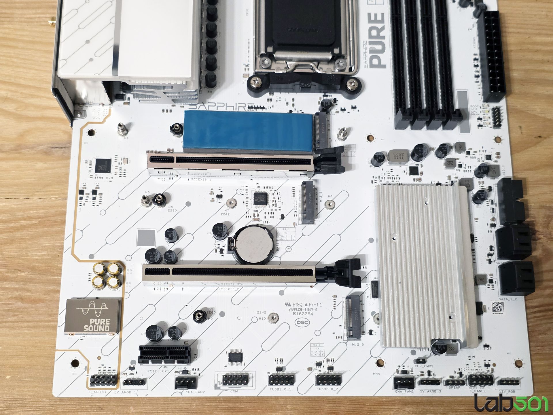 Partea de conectivitate este completata de 2 header-e USB 10Gbps, doua header-e USB 2.0 si un header USB 5Gbps Type-C pentru panoul frontal, in timp ce conectivitatea la retea este asigurata de o solutie Realtek RTL8125BG 2.5Gbe, respectiv o solutie wireless WiFi 7 + Bluetooth 5.4. La capitolul audio avem de-a face cu o solutie 7.1, bazata pe anticul Realtek ALC897. Chiar daca nu avem de-a face cu o placa de baza scumpa si implicit nu avem butoane on-board, Sapphire PURE X870A WIFI 7 este echipata cu un de-bug led simplu (DRAM: galben, CPU: rosu, GPU: alb, Boot: verde)