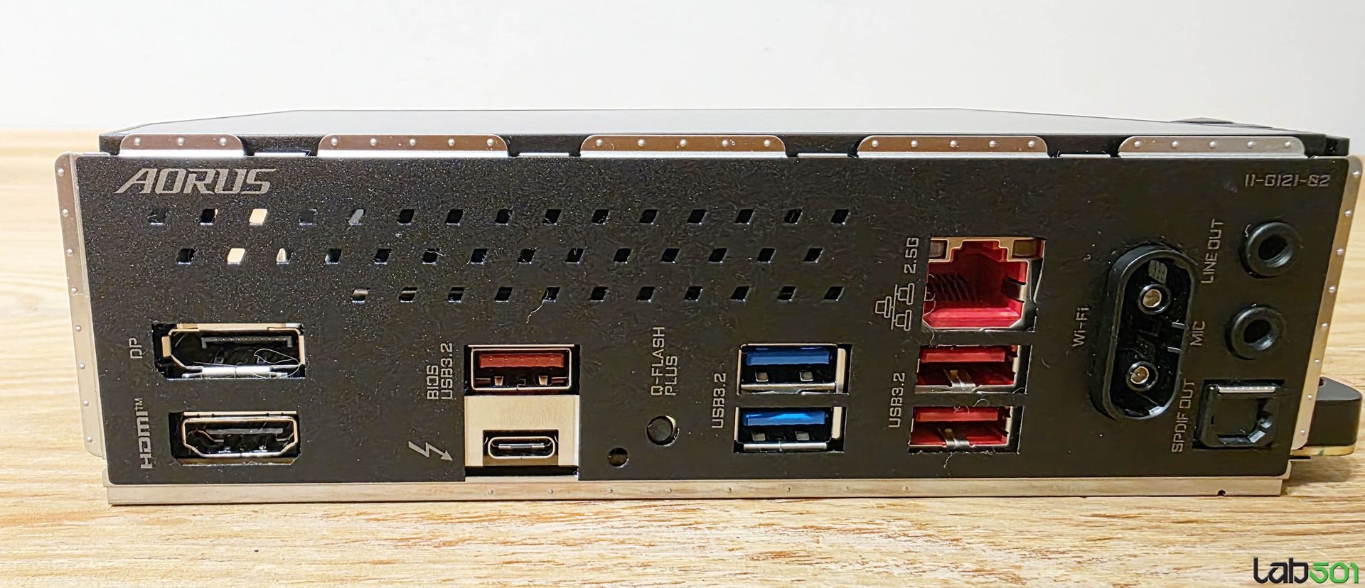 Back-panel-ul adaposteste 1 conector HDMI, 1 conector Display Port, 1 buton Q-Flash Plus, 2 conectori USB 3.2 Gen 1 (5G), 3 conectori USB 3.2 Gen 2 (10G), 1 conector USB-C Thunderbolt 4 / USB 40G, 1 conector RJ-45, conectorul 2T2R pentru antena WiFi, un conector audio IN, un conector audio OUT si un conector SPDIF OUT.