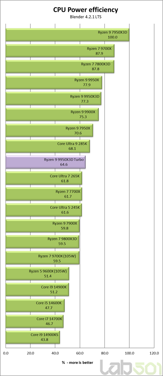 Nu puteam trece mai departe fara sa analizam si eficienta energetica a procesoarelor. Pentru acest test, am calculat energia totala consumata (in Jouli) de fiecare procesor in timpul randarii din Blender 4.2.1 LTS, inmultind timpul de executie (in secunde) cu consumul mediu al procesorului. Eficienta a fost apoi determinata calculand inversul energiei si aplicand un factor de corectie, astfel incat cel mai eficient procesor sa aiba valoarea de 100%.
