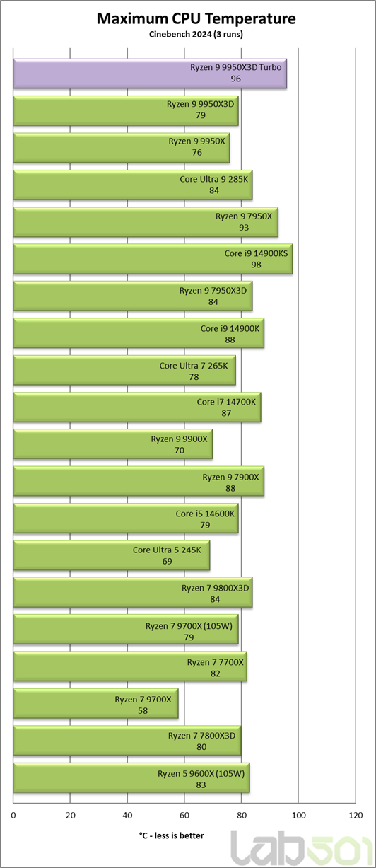 Asa cum era de asteptat, avand in vedere consumul mediu mai ridicat, Ryzen 9 9950X3D ruland pe profilul Max Performance este semnificativ mai fierbinte decat acelasi procesor in modul Standard, temperatura maxima atingand acum 96°C.