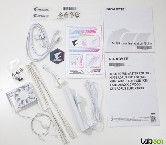 X870E AORUS Master X3D ICE este livrata intr-un ambalaj premium, cu un design grafic futurist, in care tema de culoare alba subliniaza identitatea vizuala a seriei “ICE”. In interior, pachetul de accesorii este generos, similar cu cel al modelului X870E AORUS Master. Gasim aici doua cabluri SATA, adaptorul front-panel G-Connector, doi senzori termici (utili pentru monitorizarea temperaturilor in zone critice), antena Wi-Fi 7 de noua generatie – echipata cu baza magnetica si sistem Wi-Fi EZ-Plug pentru conectare rapida – precum si elemente de branding AORUS – stickere si un badge metalic.