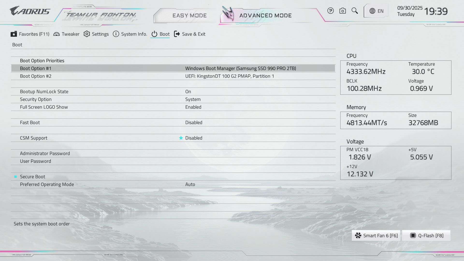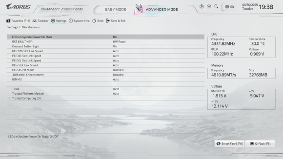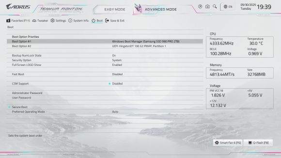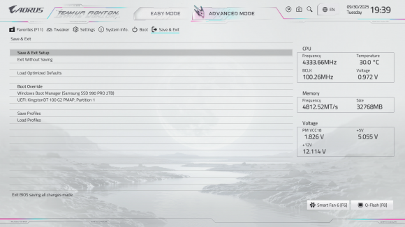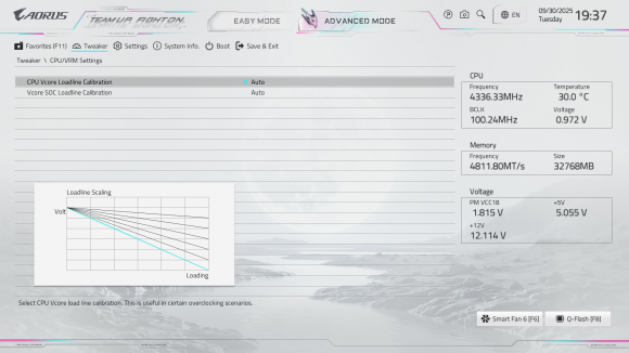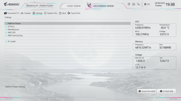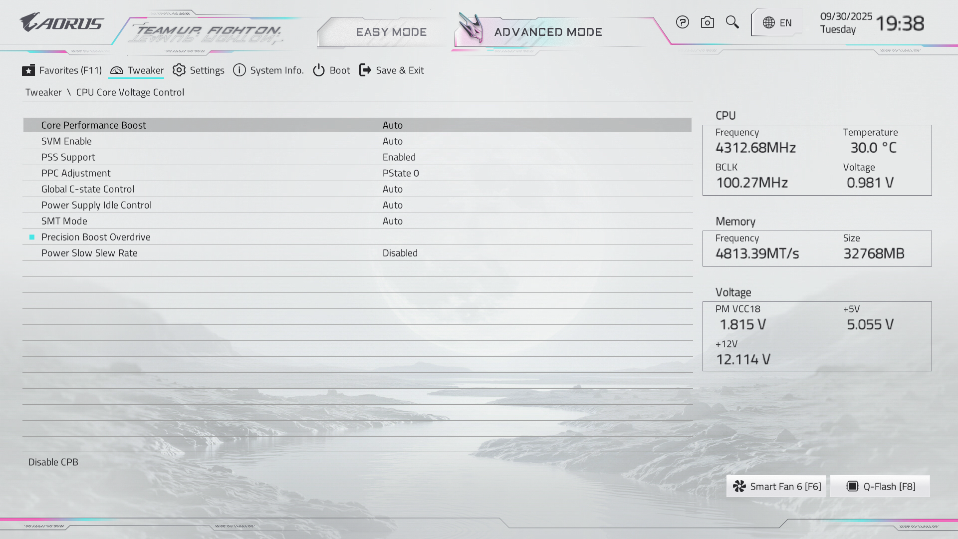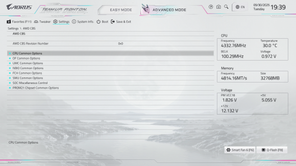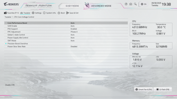 - Max Performance mentine active toate nucleele si firele de executie, activand suplimentar functia PBO Advanced (doar in cazul in care este detectat un procesor Ryzen 9950X3D, 9900X3D sau 9800X3D). Pentru a evita eventualele probleme de stabilitate, GIGABYTE au implementat un mecanism de siguranta: daca sistemul detecteaza instabilitate in configuratia curenta, acesta revine automat la setarile implicite, cu PBO dezactivat.