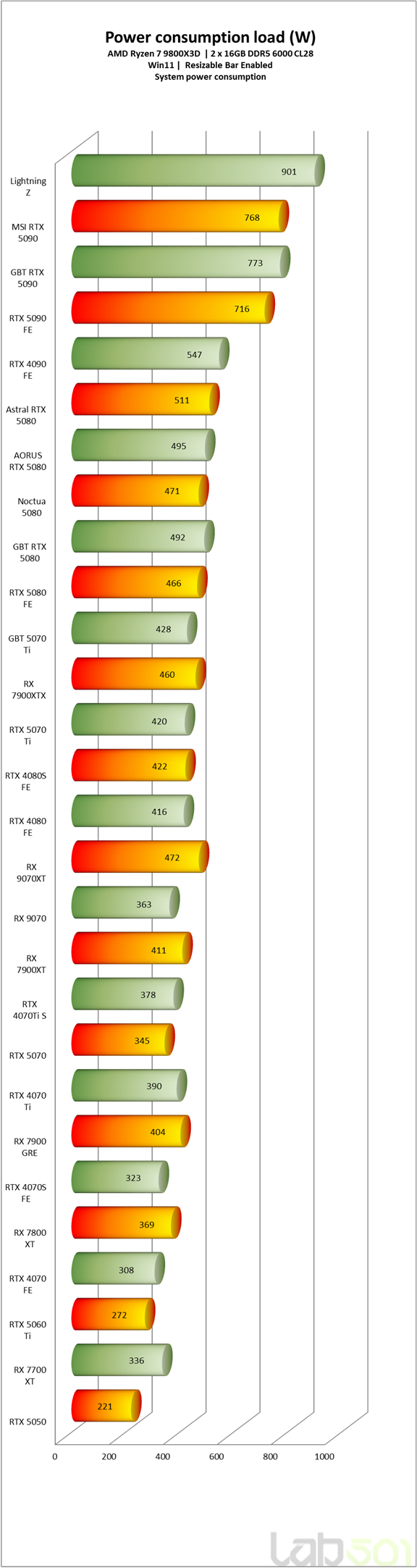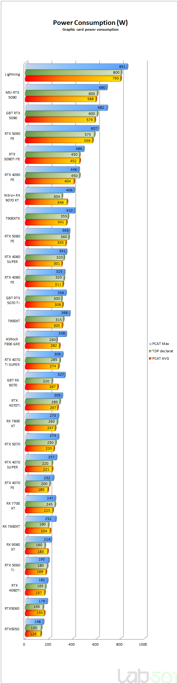 Aparatul pentru masura consumului la priza indica un maxim de 901W trasi din priza, iar PCAT-ul ne indica un consum maxim de 851W si o medie de 795W. Practic, avem de-a face cu un consum mediu cu 236W mai ridicat fata de RTX 5090 FE.