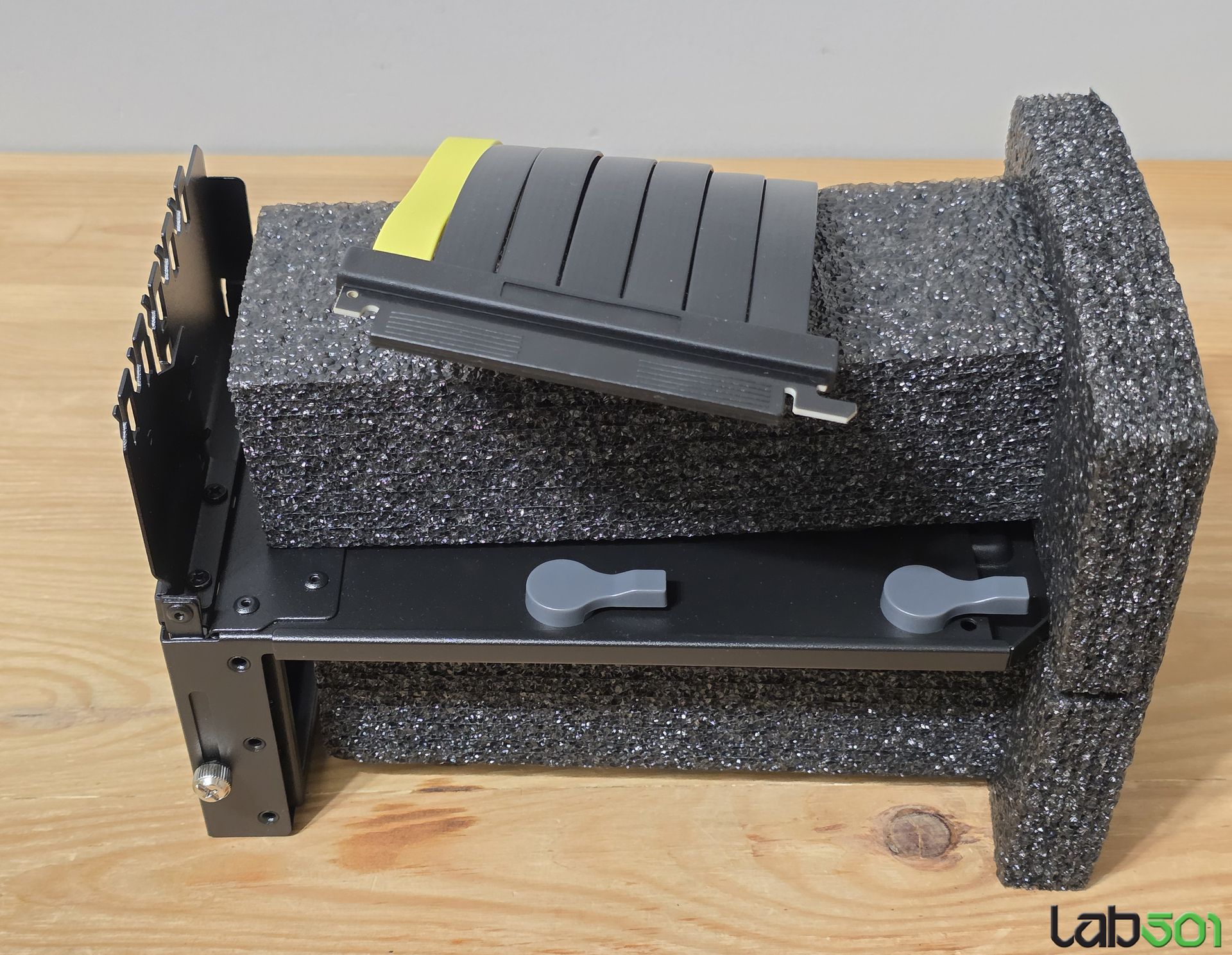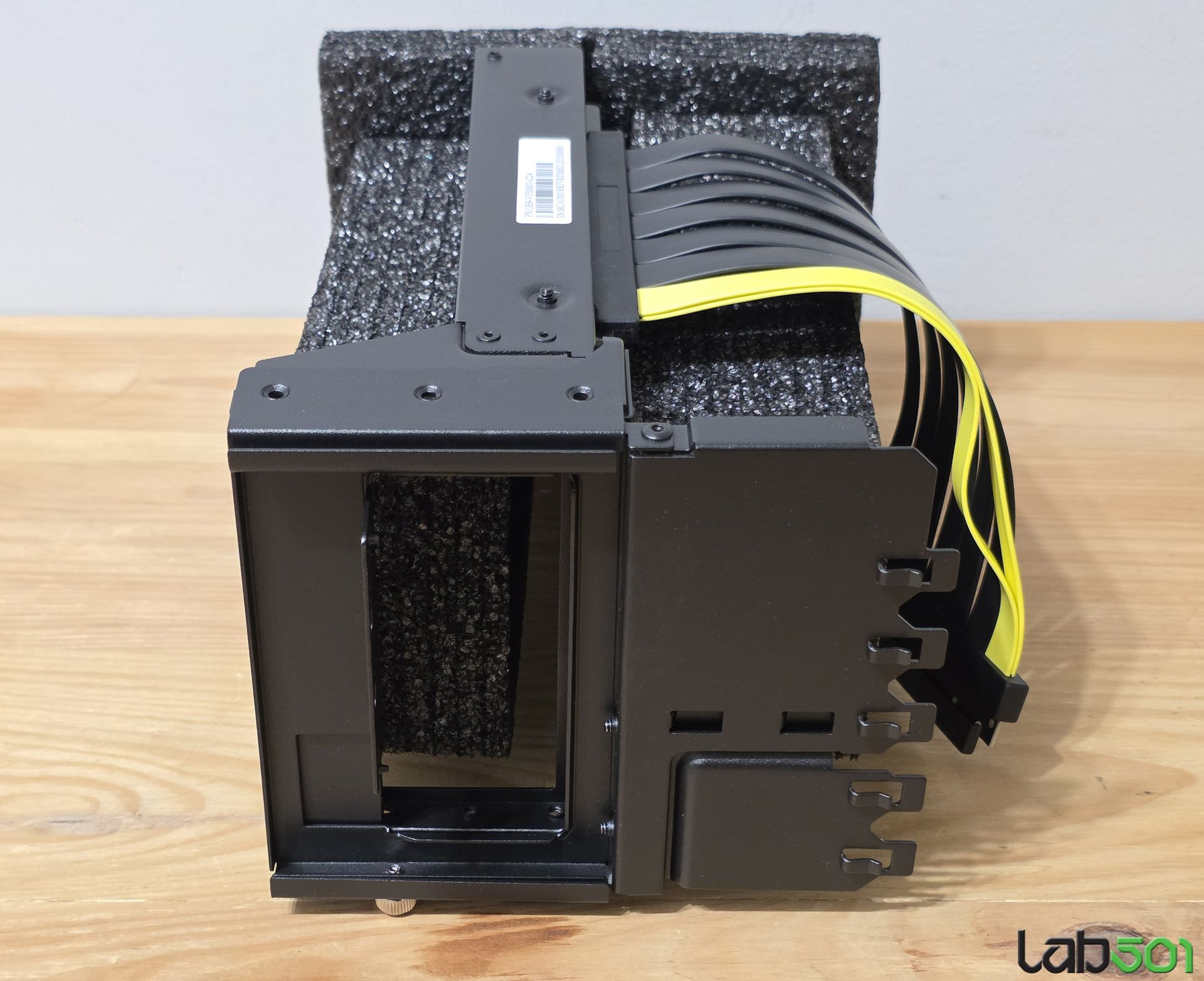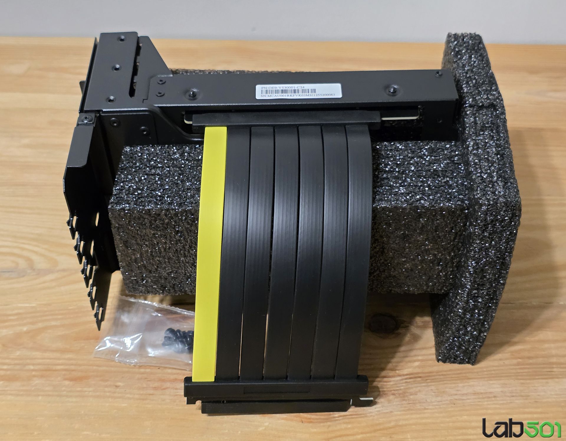 Cea de-a treia cutie contine un riser PCI-E si montantul aferent, care ne permite sa montam placa video in pozitie verticala intr-o multitudine de carcase, in deplina siguranta.