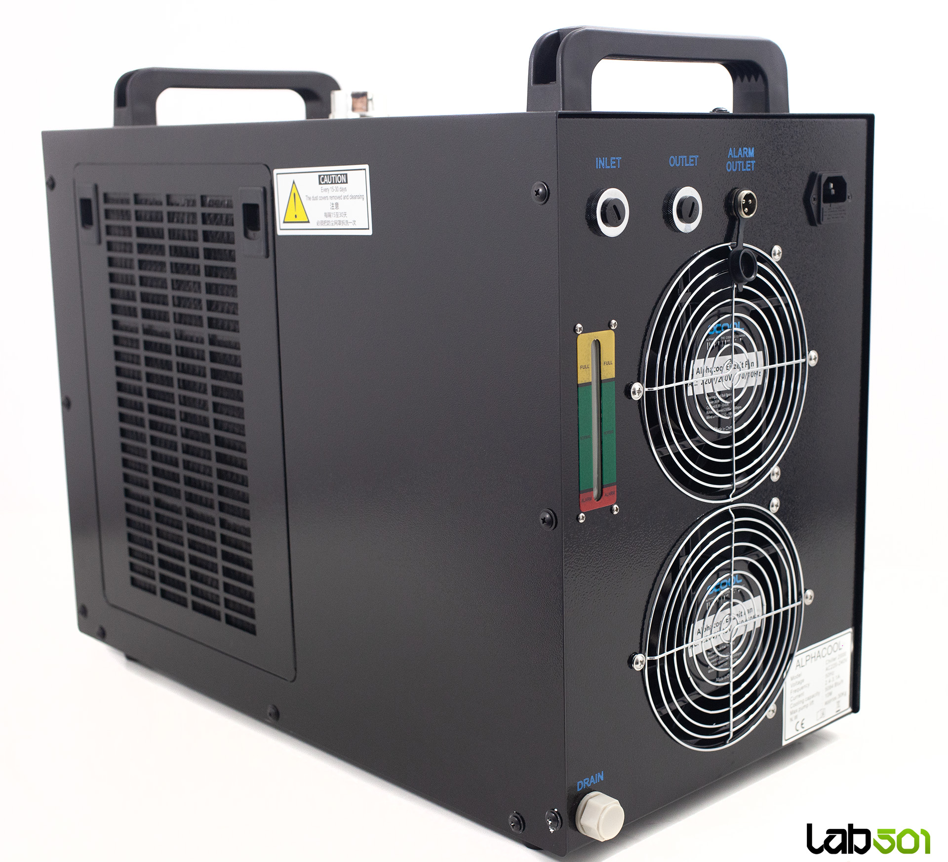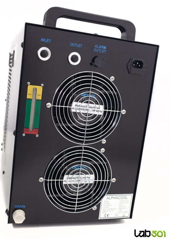 Pe panoul posterior regasim cele doua ventilatoare de 160 mm responsabile de evacuarea aerului prin condensator, precum si conexiunile G1/4, standardul utilizat in majoritatea sistemelor de watercooling. Orice sistem de racire cu schimbare de faza functioneaza pe baza a patru componente esentiale: compresor, condensator, supapa de expansiune si evaporator. Daca in cazul sistemelor single-stage evaporatorul este amplasat direct pe procesor, in cazul unui chiller acesta are forma serpentina si este integrat in rezervor pentru a reduce temperatura lichidului din bucla de racire.