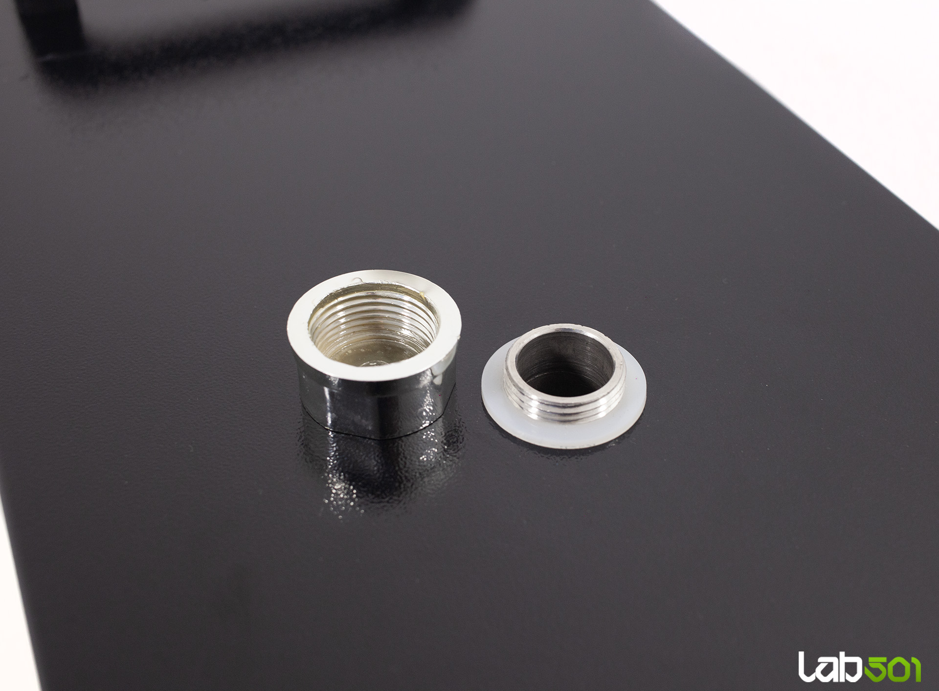 Panoul frontal include un ecran LCD pentru setarea si vizualizarea parametrilor de functionare, un buton de pornire si doua LED-uri (verde si rosu) care semnalizeaza eventuale probleme. Pentru monitorizarea nivelului de lichid, Alphacool au montat o fereastra de vizualizare in partea din spate, unde nivelul optim este marcat in zona verde. Tot aici regasim si un dop pentru golirea circuitului.