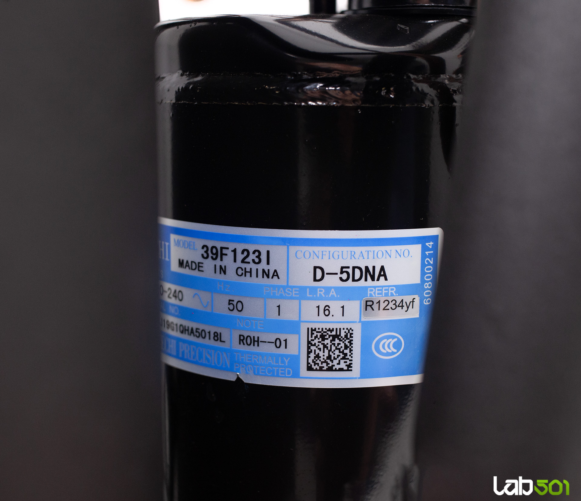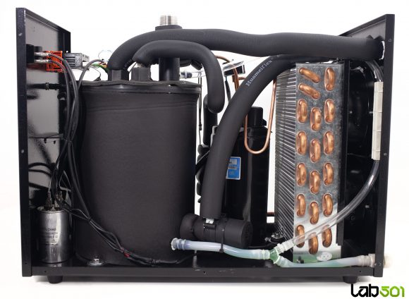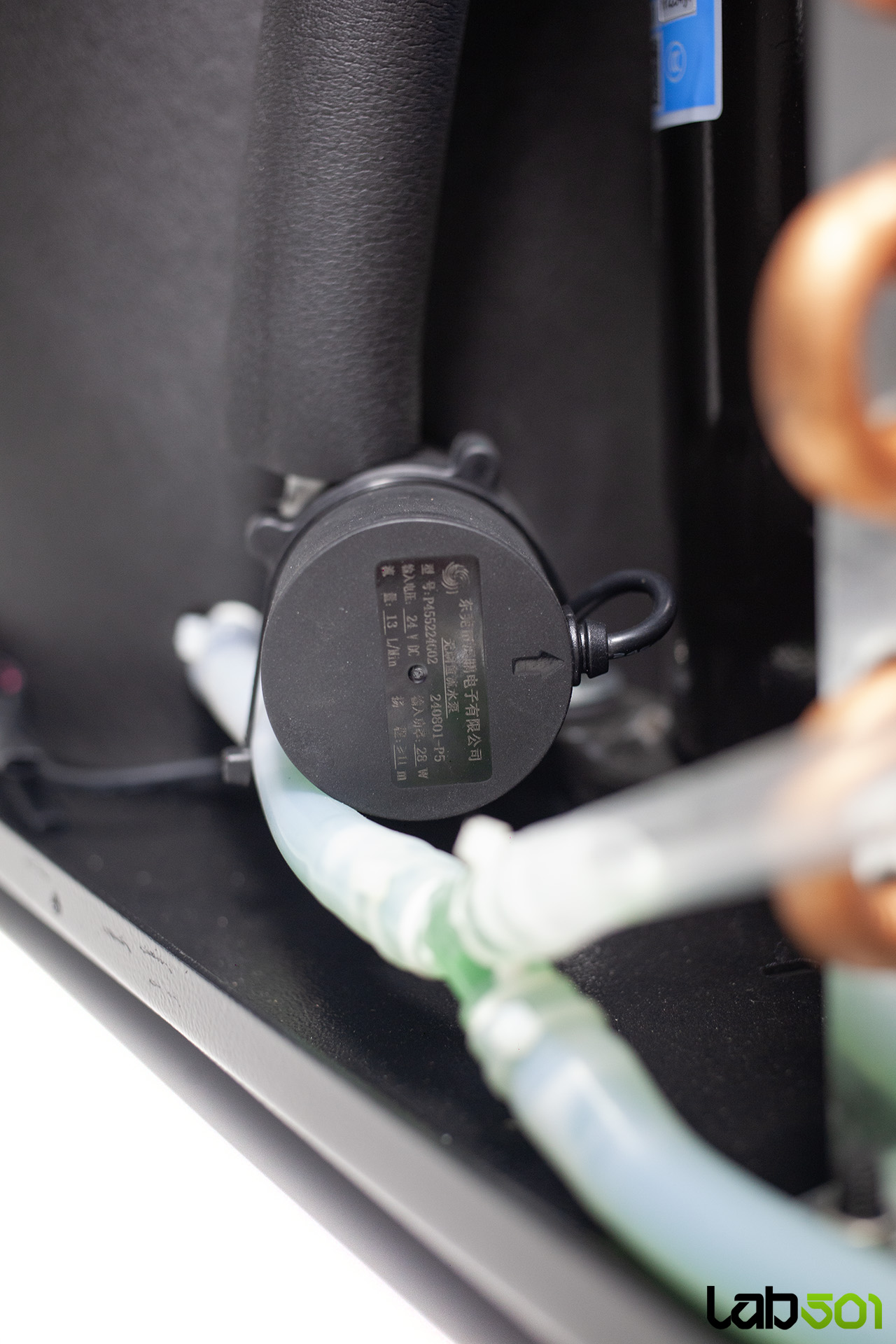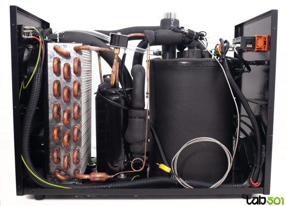 Indepartand carcasa exterioara putem observa mai bine organizarea interna si atentia la detalii acordata de Alphacool. In spatele rezervorului este amplasat compresorul, cu o putere de 0.49 / 0.57 kW (0.66 / 0.77 HP), iar agentul frigorific utilizat este R1234YF. De asemenea, putem observa condensatorul de dimensiuni generoase (190 x 310 x 80 mm), prin care aerul este trecut si evacuat cu ajutorul celor doua ventilatoare din partea din spate.