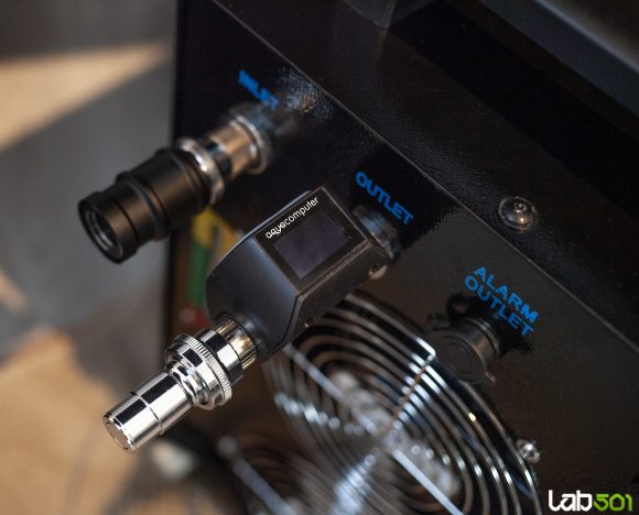 Pentru o utilizare ulterioara mai facila, am montat atat pe tur, cat si pe retur, cuple rapide Alphacool ES Quick Release, care afecteaza foarte putin debitul. Furtunul utilizat este Alphacool EPDM 13/10, acesta fiind imbracat intr-un tub izolator pentru a preveni formarea condensului. In vederea utilizarii viitoare in review-uri, am montat si un flowmeter de la Aquacomputer.