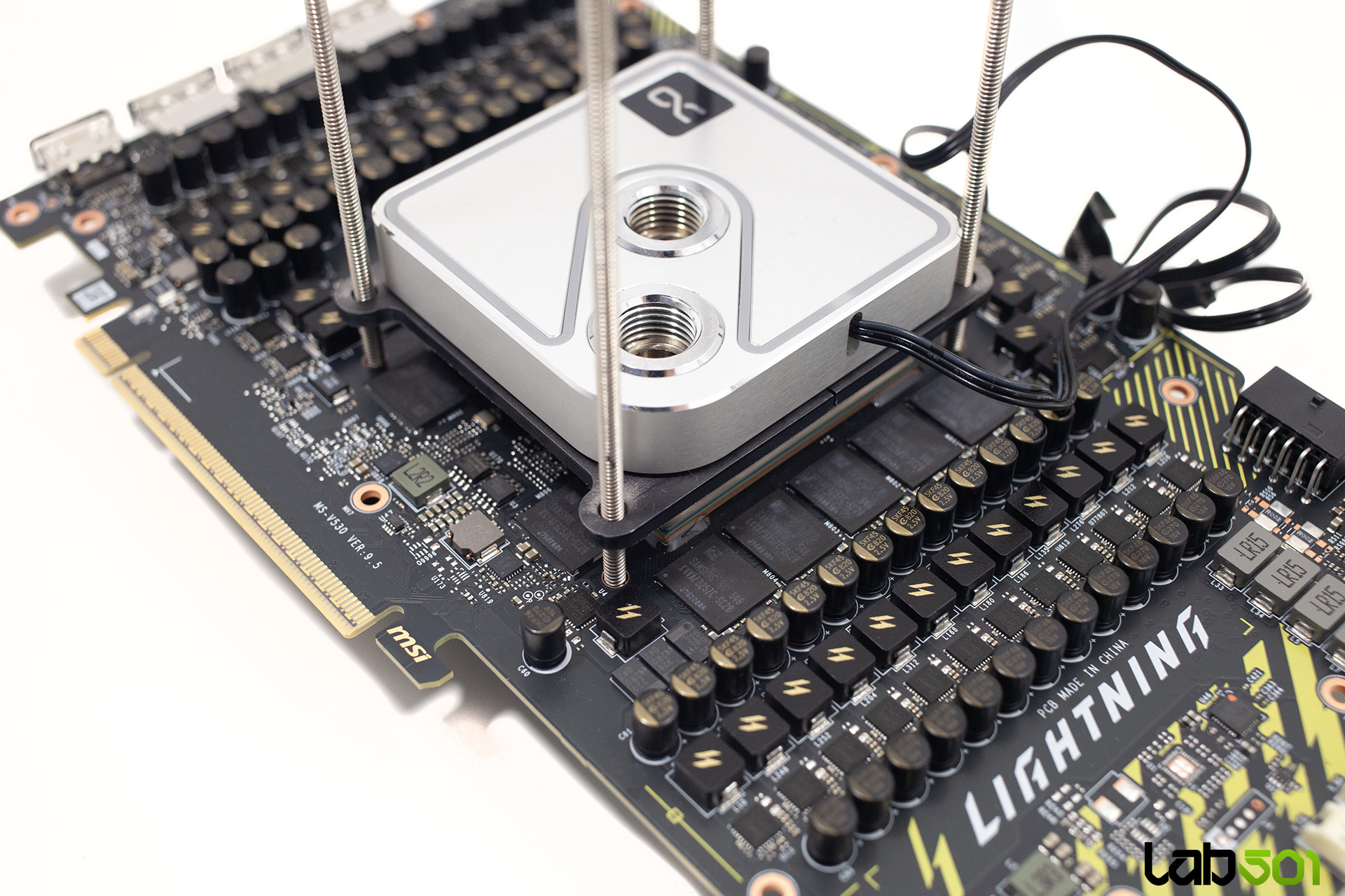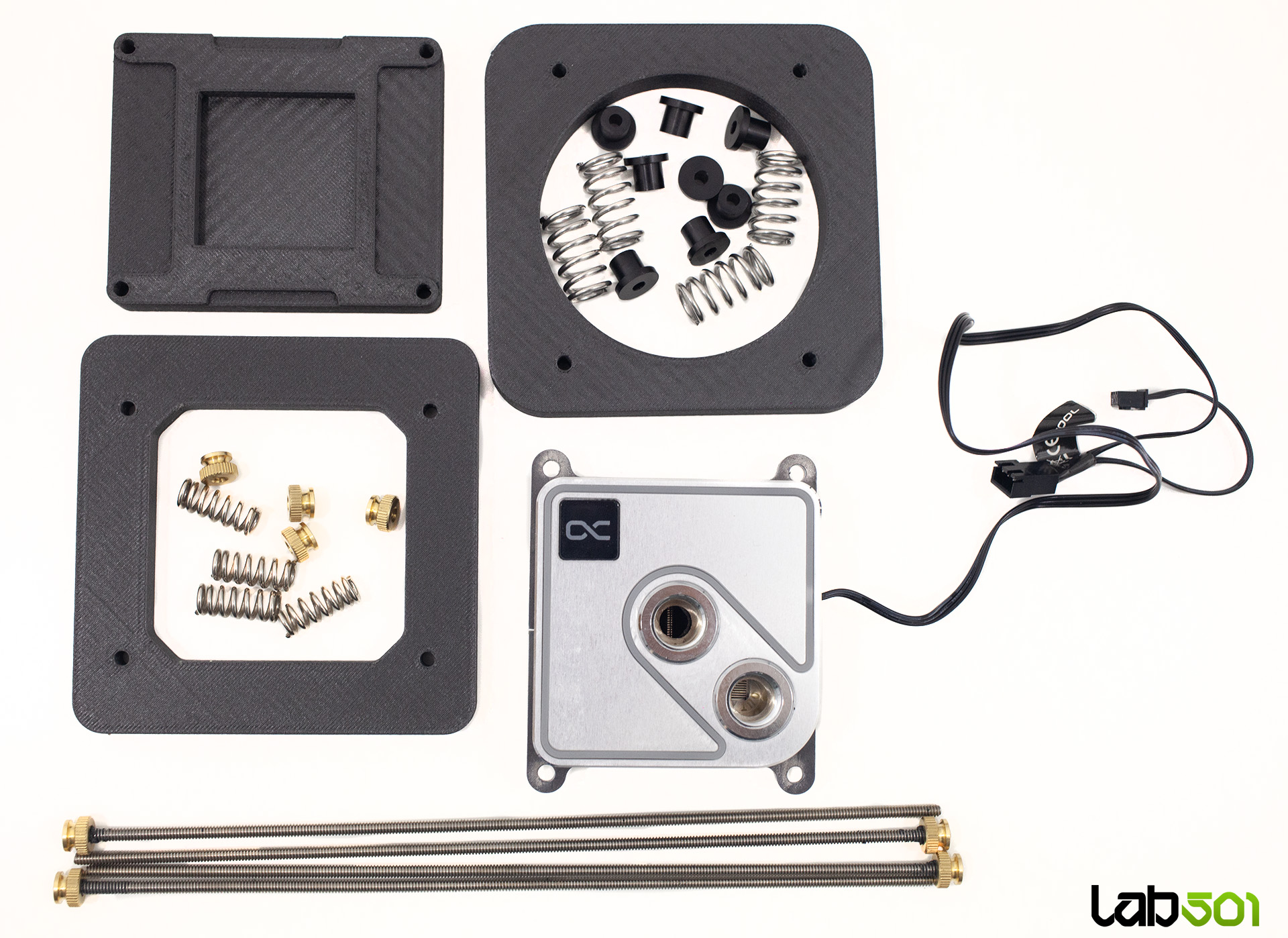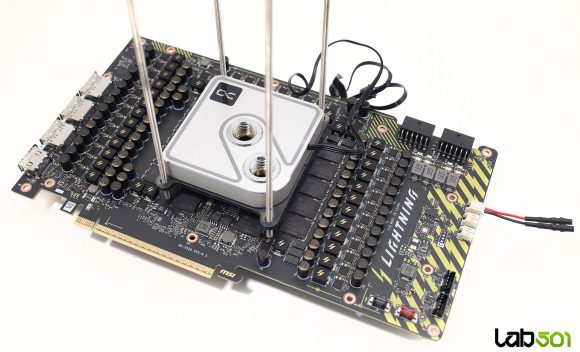 Am utilizat tijele filetate si piulitele de la Kingpin Cooling F1 EE, iar pentru arcuri am apelat la un sistem de prindere mai vechi, deoarece aveam nevoie de unele cu diametru mai mic. Pentru a evita inclinarea waterblock-ului, am strans suruburile uniform, asigurand o presiune optima, lucru confirmat si la demontare.