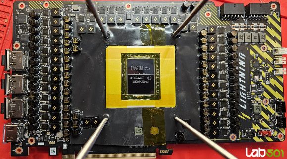 Mai departe am trecut la pregatirea placii video, aplicand un strat de lac atat pe fata, cat si pe spate, in zona din jurul GPU-ului. Intre memorii m-am oprit la condensatorii etajului de alimentare. Componentele SMD de pe substratul GPU-ului au fost, de asemenea, acoperite cu lac, peste care am aplicat un strat de Kapton pentru a preveni infiltrarea picaturilor de apa.